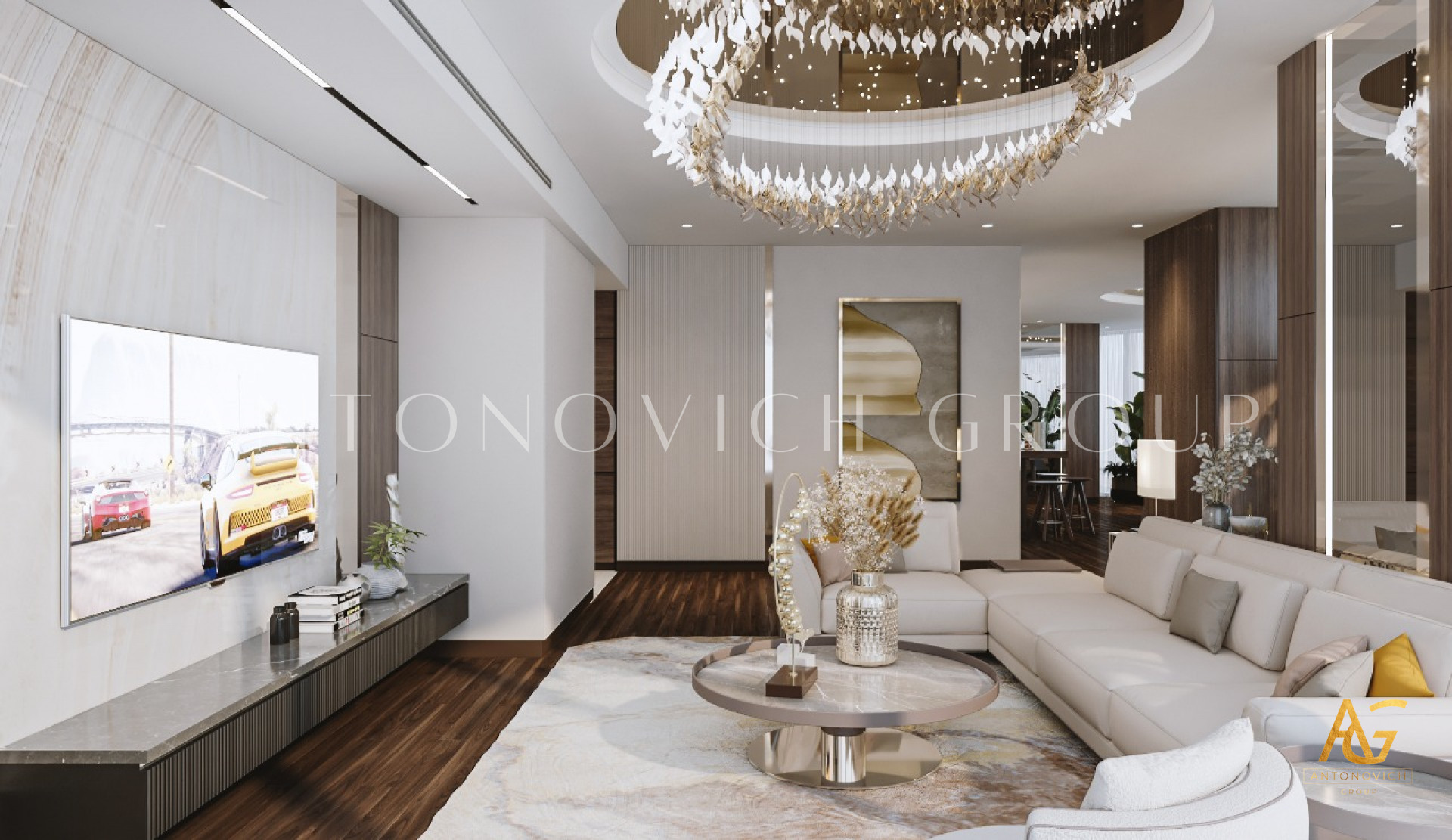 This is a large-scale luxury housing project in the Burj Khalifa by Antonovich Group. The owner indicated a desire for a magnificent modern interior in which comfort was prioritized and every aspect of the interior emphasized its high status and respectability. A sufficiently sized flat allowed designers to express their creativity. The spherical living room is central to the tale of this magnificent residence. The floor is adorned with carved designs in beautiful marble. The ceiling is adorned with a large crystal chandelier with waterfalls of pendants in the middle. Large spherical columns in bright hues formed the focal point of the living rooms interior design.