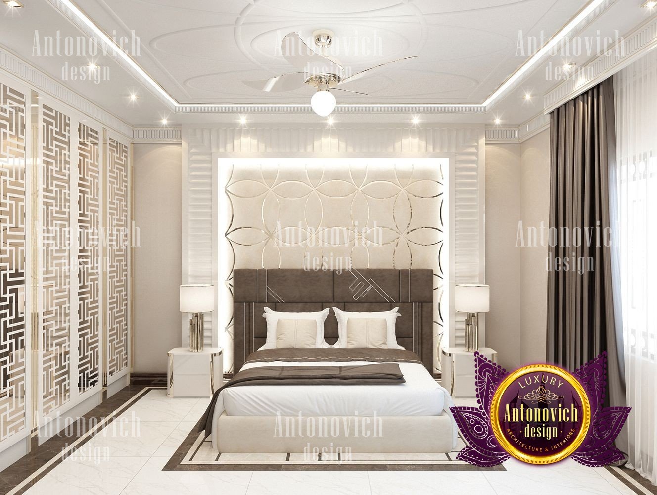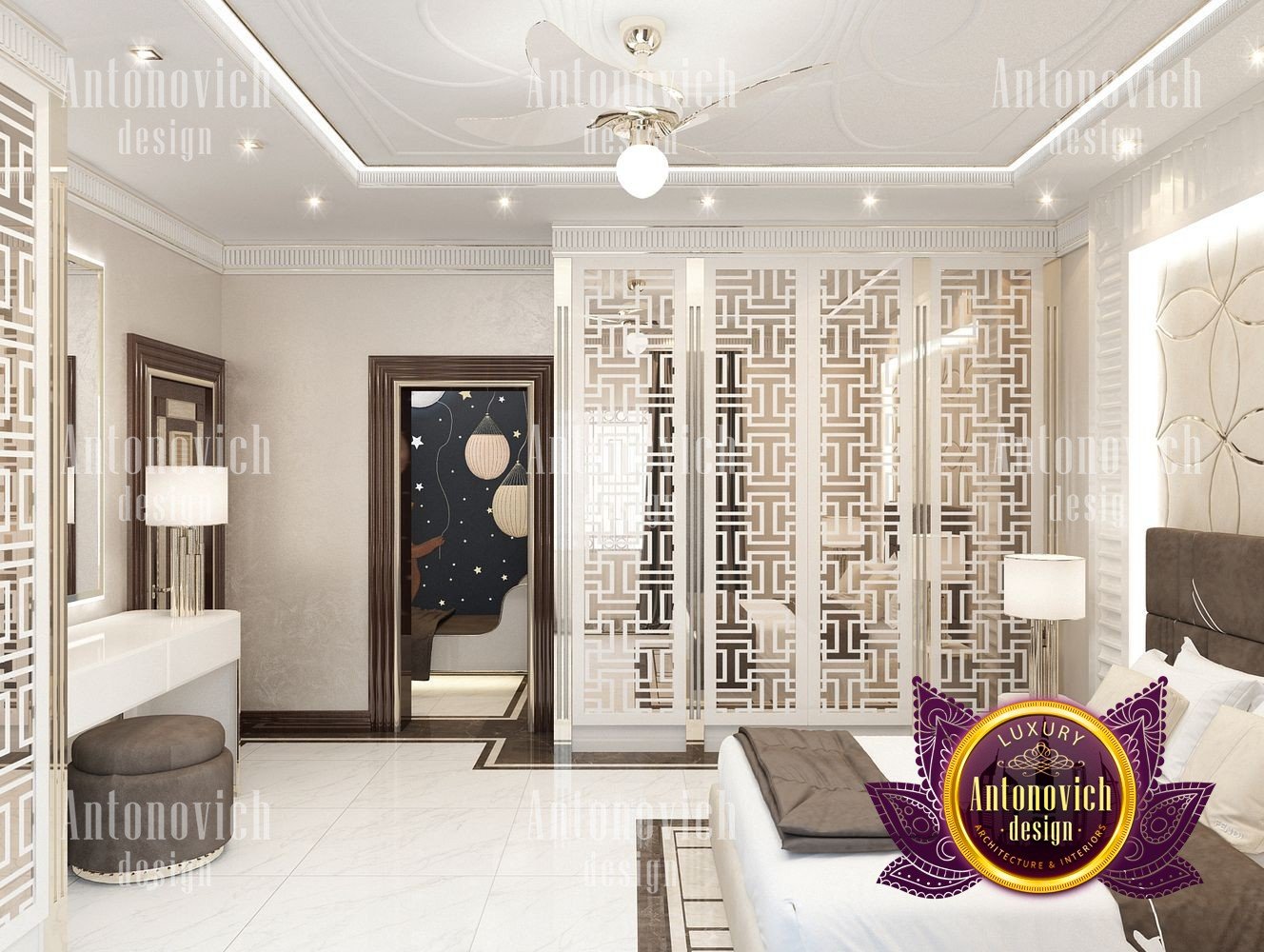 Instead of ordinary wall paint and decorations, Luxury Antonovich Design team perfectly installed and arranged an amazing wall paneling with perfect backlighting towards the headboard of the bed. A detailed art in metal works emphasizes the chic style feature. The team has indeed selected the most stunning lighting arrangement as the chandeliers and spotlights bring out the right blend of brightness towards the full bedroom interior design. Take look how classy that the curtains have been perfectly covered the windows and complimented the natural lighting on its finest shades .