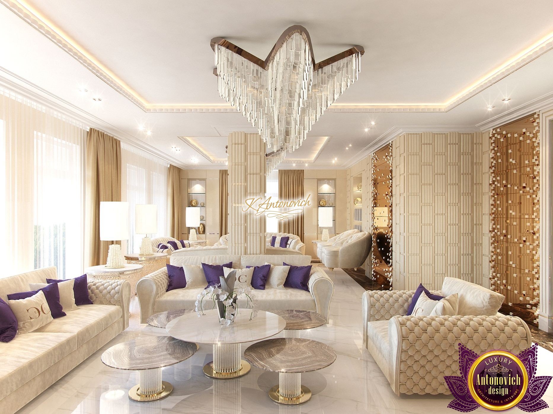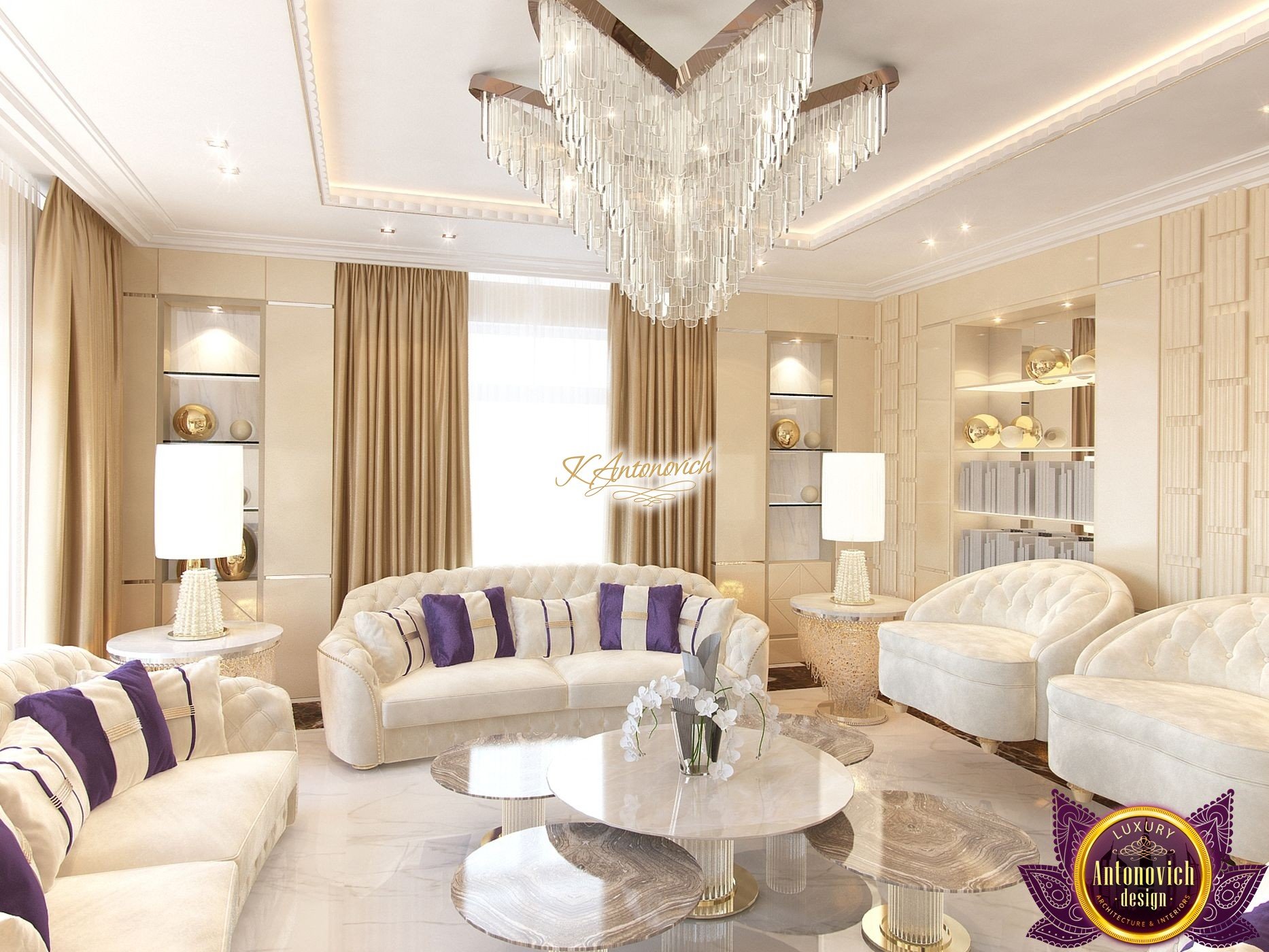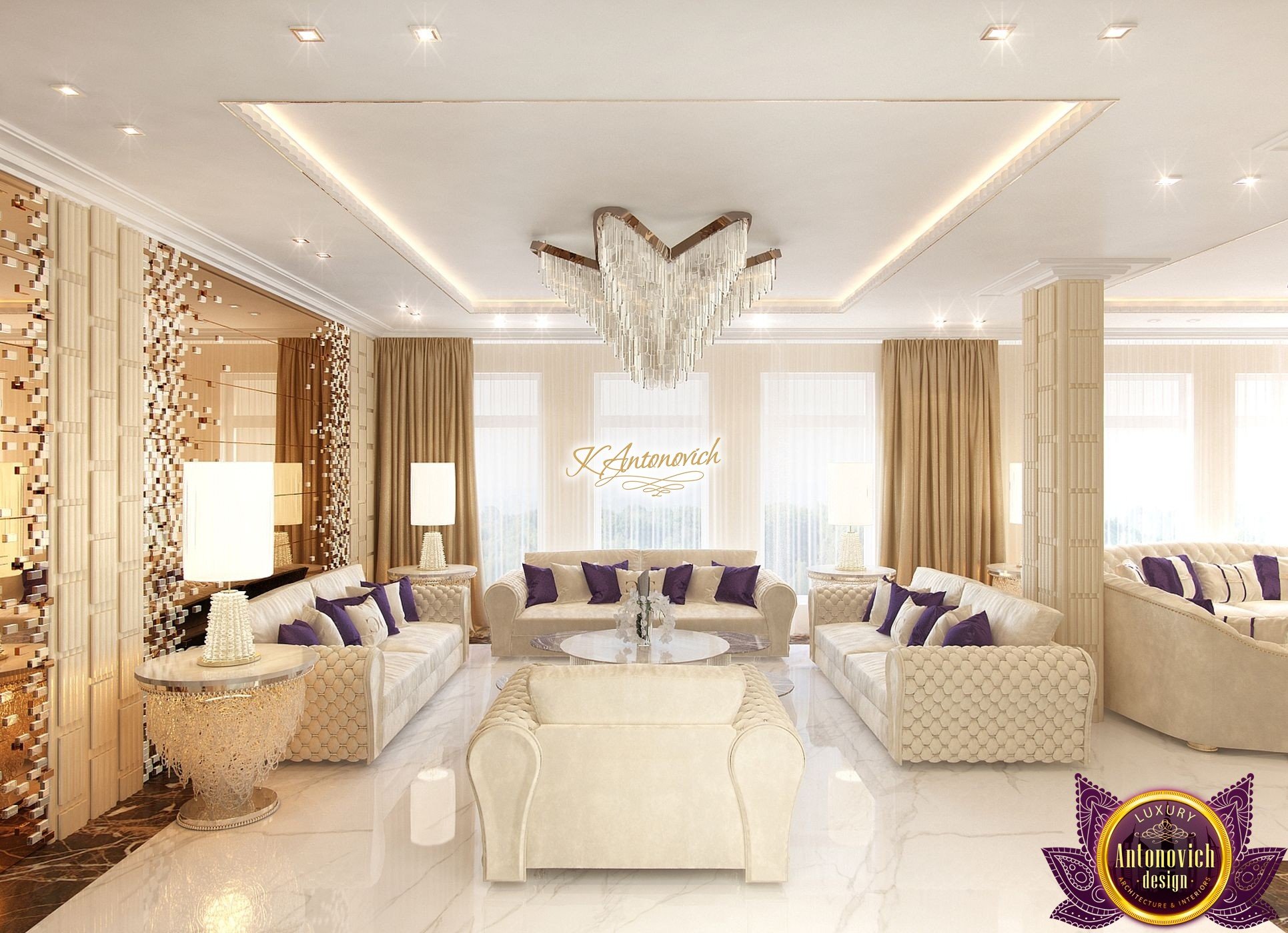 The interior design of the living room in the Art Deco style impresses with its bright and luxurious image. Designers of the interior of the studio Luxury Antonovich Design create interiors that are the beginning of the emergence of new fashion trends.In this spacious room, a modern classic with Art Deco style is harmoniously combined.The authors of the project paid special attention to the decor of the walls. Here there are original glossy panels with elements of brass.Gloss with a mirror effect not only visually increases the space but also makes it especially elegant.The large living room is conditionally divided into two zones.To zoning space, the authors of the project use square columns with white capitals. Upholstered furniture has become one of the main decorations of the living room interior.Sofas and armchairs are upholstered in chic silk velvet of milky cream color.Against this background, very stylishly look silk pillows in rich lilac shades. Window decoration and floor design are the most laconic solutions that are designed to bring to the fore the rest, more vivid decor elements.Large windows are curtained with curtains made of luxurious monophonic silk of caramel shade. The interior turned out very warm and sunny, thanks to a light range of shades from milky white to golden. lighting elements became bright accents, which emphasize the stylistics of art deco.The ceiling was decorated with two elegant chandeliers. And chic tables with lamps are decorated with magnificent crystal pendants. White marble on the floor with beautiful natural veins gives the interior of the living room a visual lightness and easiness.