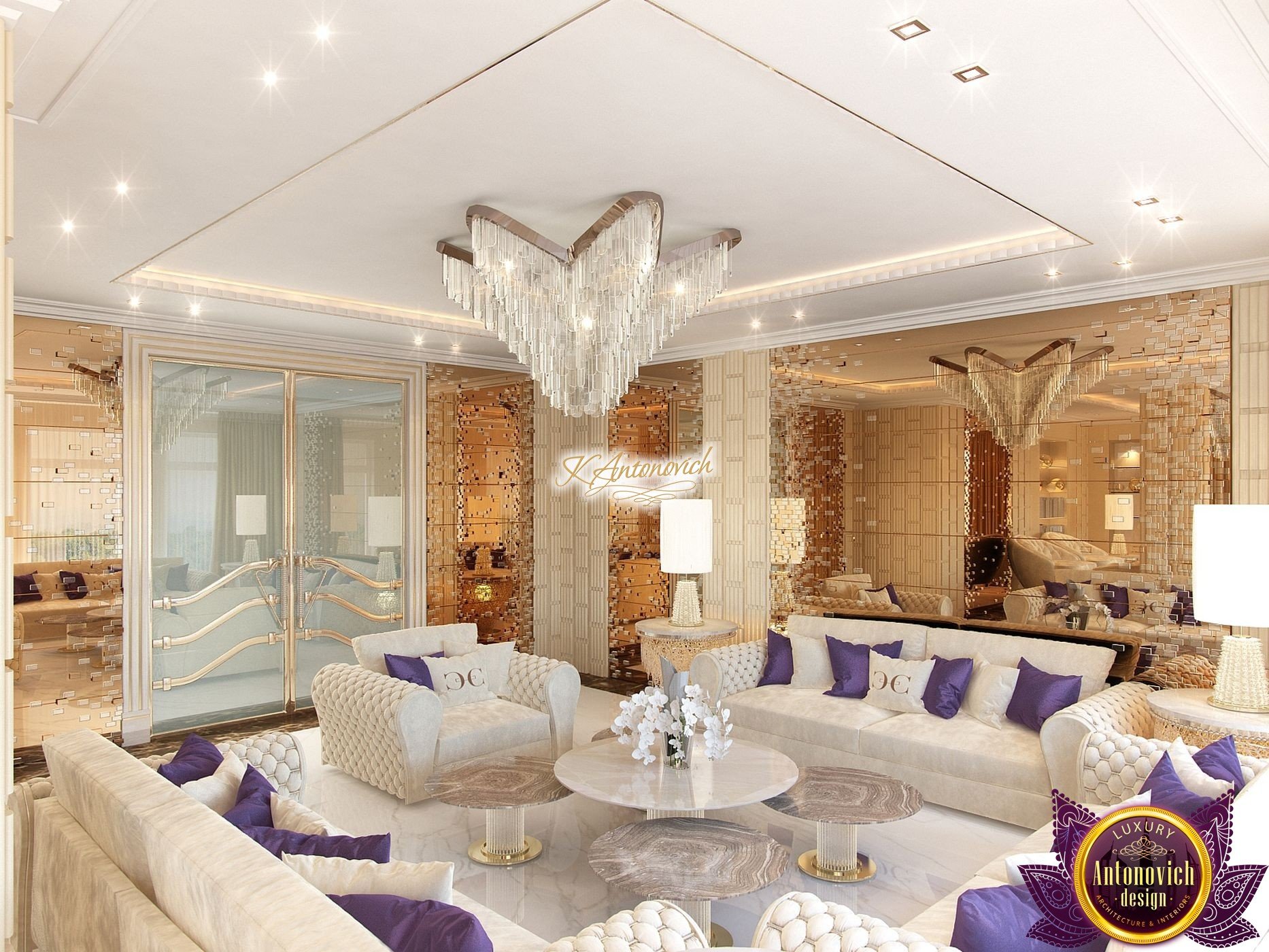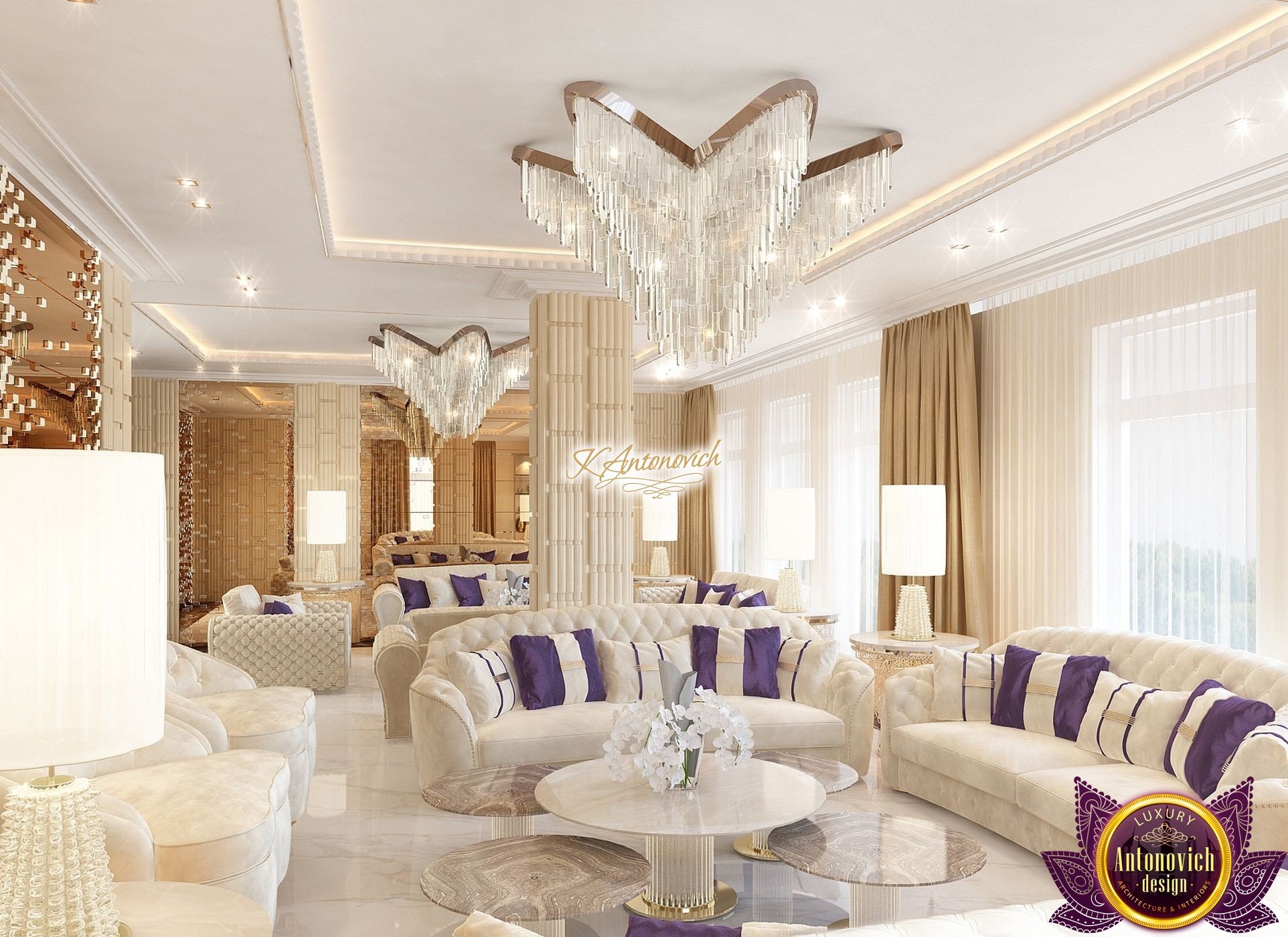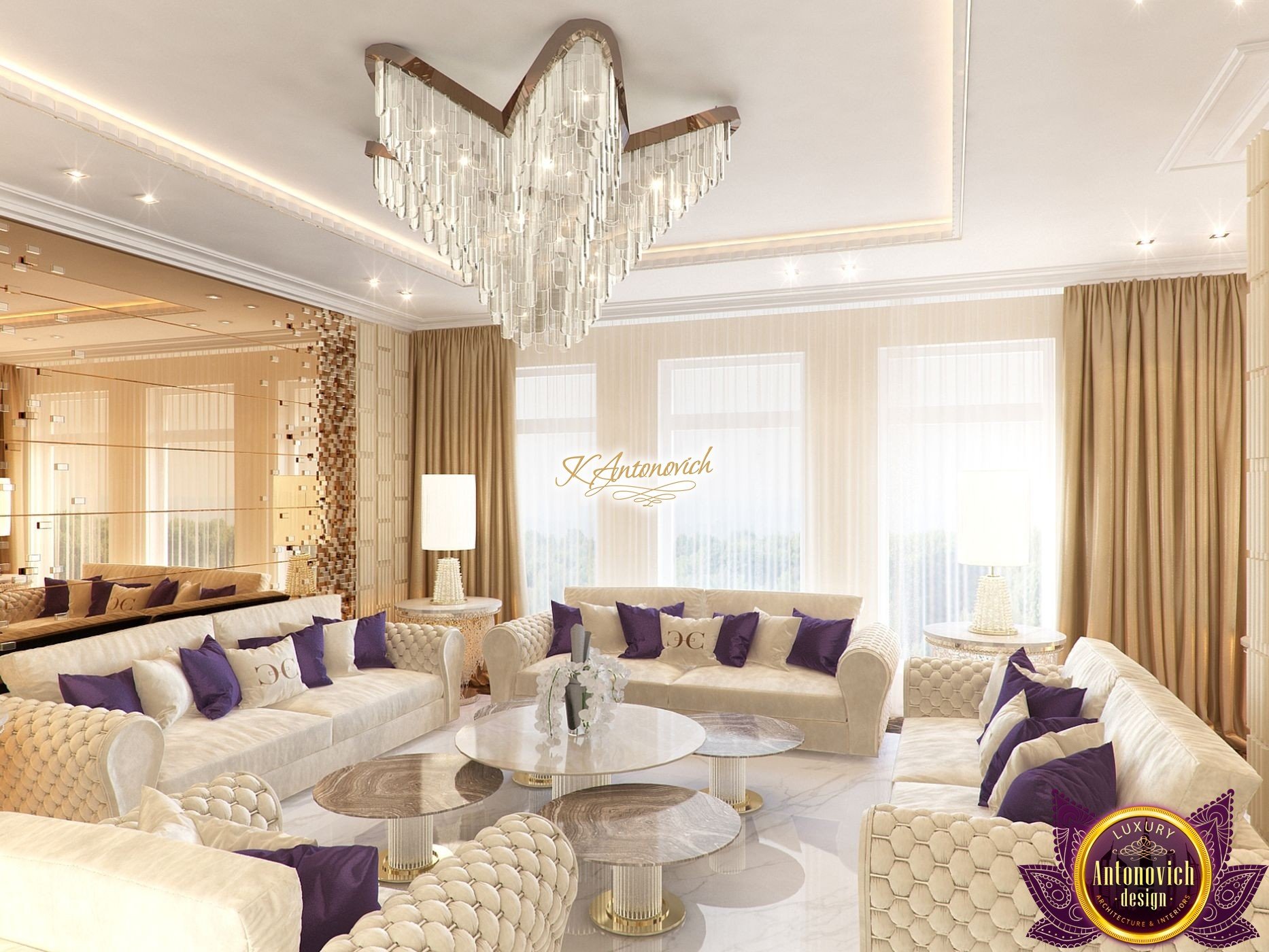 The interior design of the living room in the Art Deco style impresses with its bright and luxurious image. Designers of the interior of the studio Luxury Antonovich Design create interiors that are the beginning of the emergence of new fashion trends.In this spacious room, a modern classic with Art Deco style is harmoniously combined.The authors of the project paid special attention to the decor of the walls. Here there are original glossy panels with elements of brass.Gloss with a mirror effect not only visually increases the space but also makes it especially elegant.The large living room is conditionally divided into two zones.To zoning space, the authors of the project use square columns with white capitals. Upholstered furniture has become one of the main decorations of the living room interior.Sofas and armchairs are upholstered in chic silk velvet of milky cream color.Against this background, very stylishly look silk pillows in rich lilac shades. Window decoration and floor design are the most laconic solutions that are designed to bring to the fore the rest, more vivid decor elements.Large windows are curtained with curtains made of luxurious monophonic silk of caramel shade. The interior turned out very warm and sunny, thanks to a light range of shades from milky white to golden. lighting elements became bright accents, which emphasize the stylistics of art deco.The ceiling was decorated with two elegant chandeliers. And chic tables with lamps are decorated with magnificent crystal pendants. White marble on the floor with beautiful natural veins gives the interior of the living room a visual lightness and easiness.