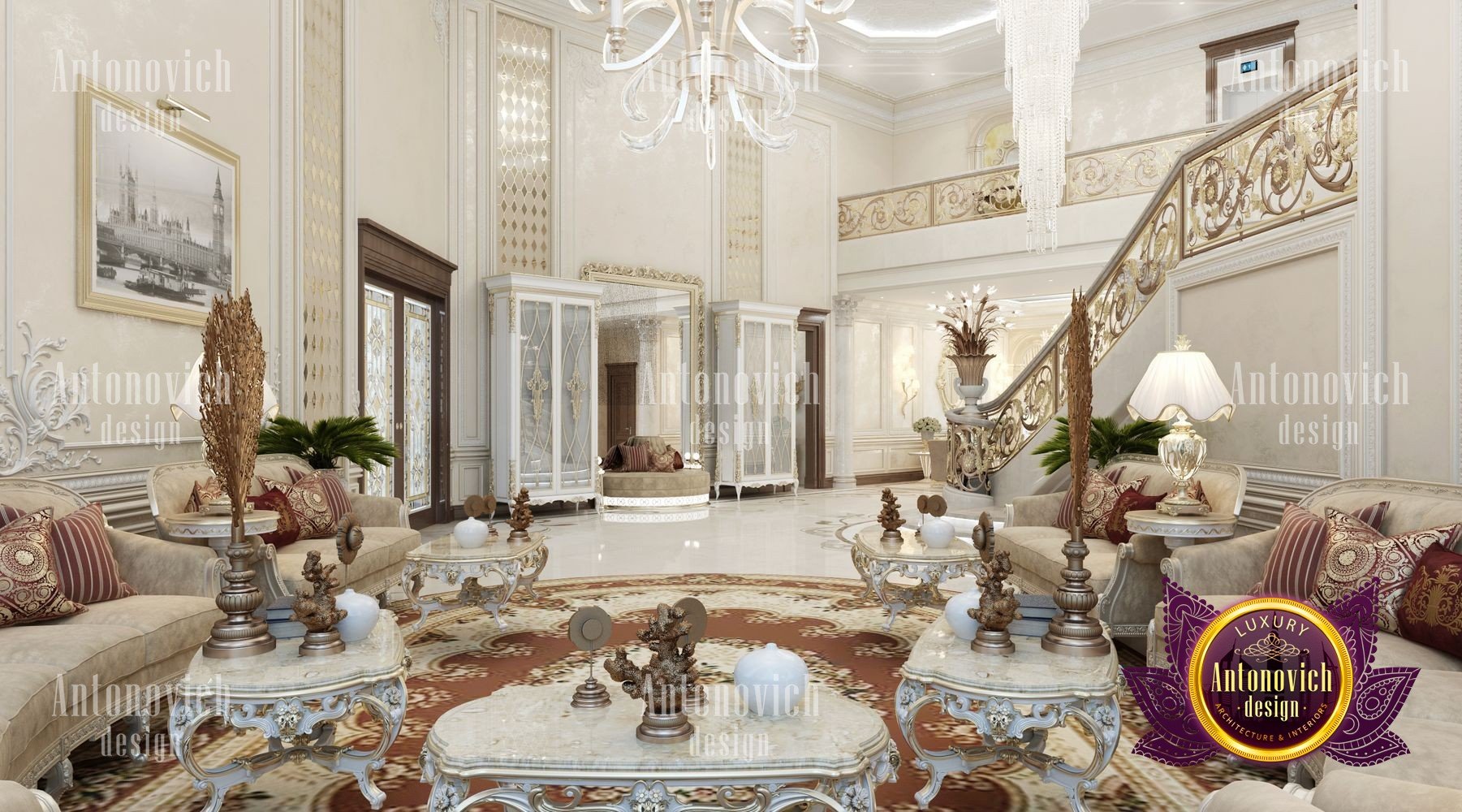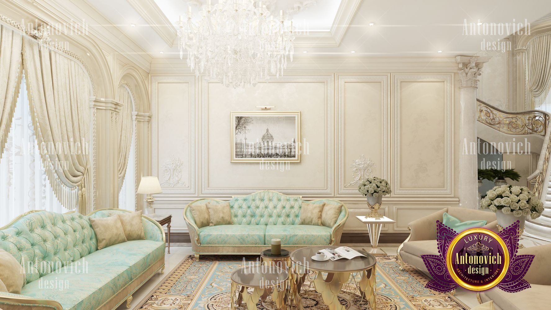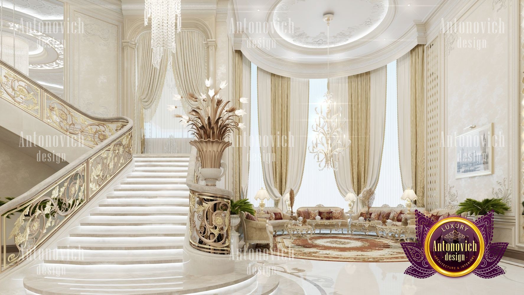 Complete immersion in the purity of lines, the beauty of hues, the ease, elegance and chic of modern luxury occurs when you admire this beautiful interior of the living room in a modern style. Very bright, extravagant and extraordinary project was created by designers of the studio Luxury Antonovich Design. According to the design project of an elite house in Dubai, for the living room was allocated almost half the houses first floor. In this project, the close interconnection between the work of the architect and designers team allowed already at the idea stage to link individual architectural design and interior design. Thus, achieving absolute harmony. Here we can observe an interesting moment when directly the living room area occupies only a third of the space. Its main part with large windows is allocated for the zone of a large dining area. But lets first look at the living room. Fashionable furniture in a modern style placed comfortably by the fireplace. The sofa and armchairs are upholstered in light beige velvet, which stylishly shades the dark brown edging made of natural wood, varnished. A cozy moment in the form of a natural carpet slightly compensates the coolness of natural marble floor. In the same part of the space, there is also a small kitchen with a bar-counter. The gloss of wood and the shine of polished brass in combination with the flickering of natural marble set a certain mood in this interior. A modern fireplace is built into a large marble partition, which is designed to divide the living room and dining area. And a large dining room for 8 people looks enchanting thanks to stylish lighting details and elegant windows decor. paint house design, online interior designer services, perfect design house, professional home designer