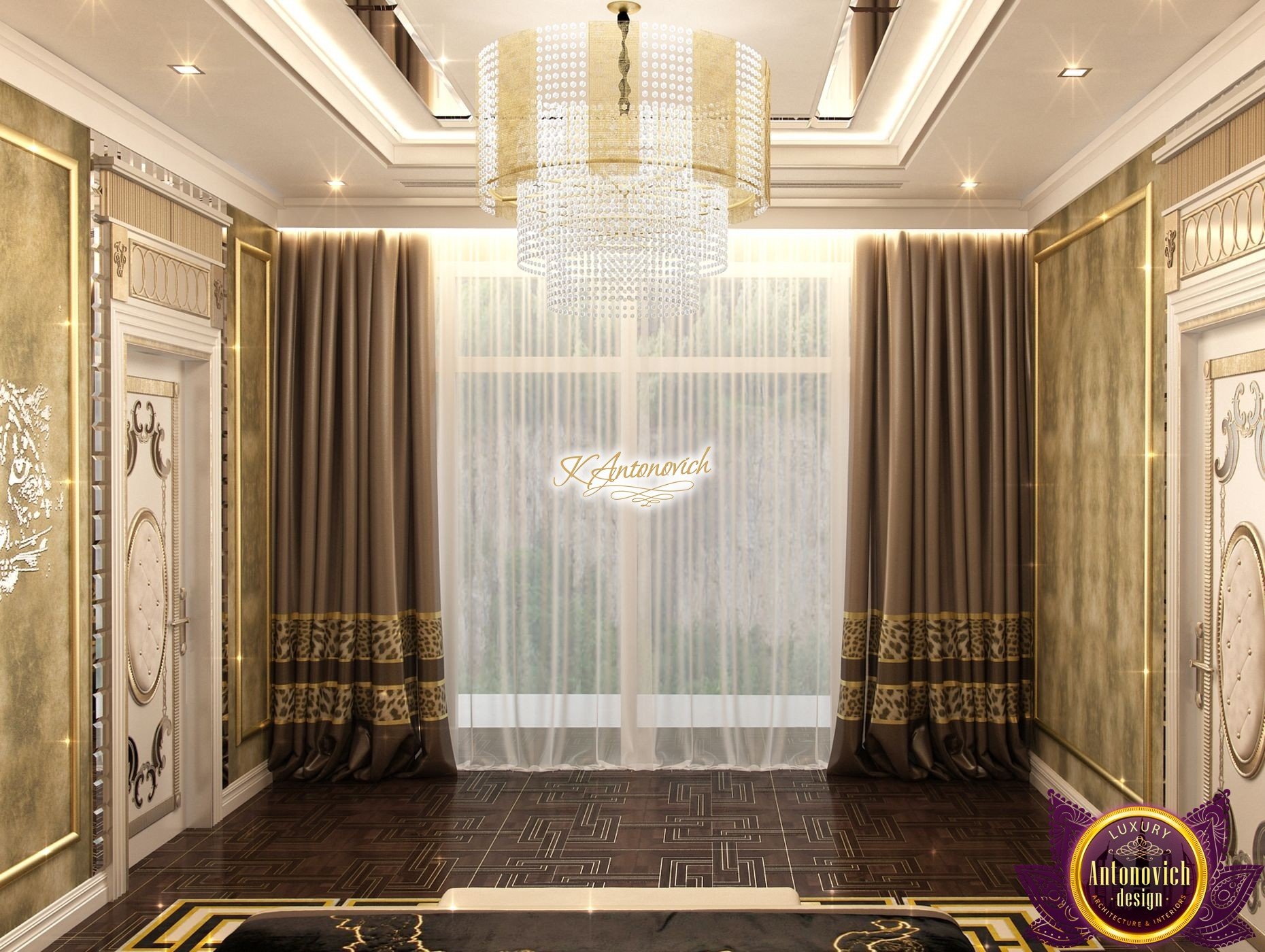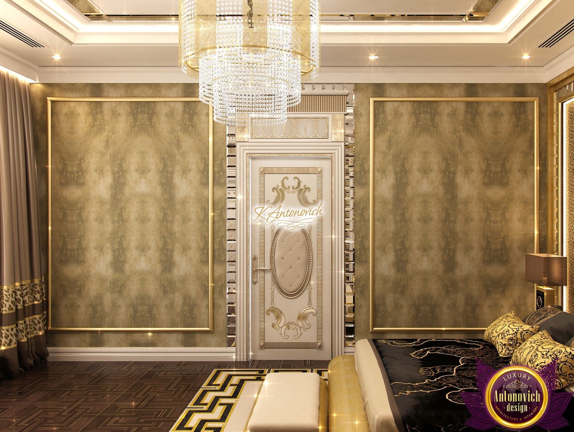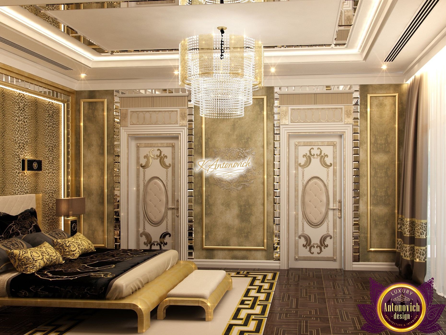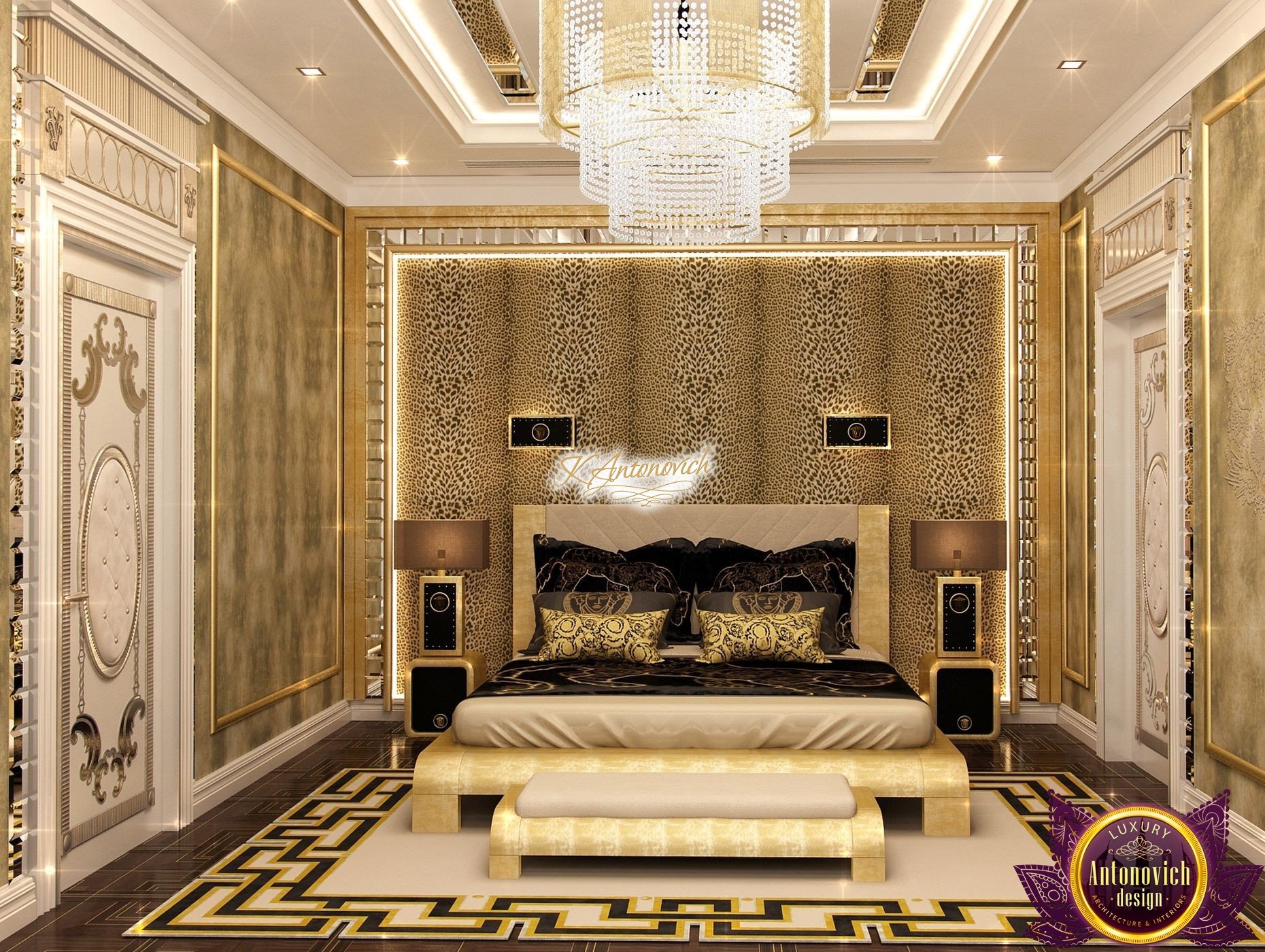 The ideas of the bedroom design are based on the perception of the life, and taste preferences of the owners of the house. It is in this room, every detail is devoted to an ideal, comfortable and secluded rest.The design of a large bedroom, in an elite house, embodies the beautiful Art Deco style with a touch of modern. This interior has a very bright and memorable image.It is based on the use of such decor materials as natural leather, gilding, and high-end textiles. Sets the basis for the mood is a large decor panel behind the headboard of the bed. The panel is upholstered with luxurious silk with a leopard skin ornament.The design of a bedroom in a country house has become a bright oasis for our customers. Some walls are decorated with elite wallpaper made of genuine leather. The interior is very harmonious and an integral in overall design concept.The beautiful bedroom design consists of very bright solutions in the floor decoration design, of the ceiling decoration, of the walls, and the decoration of the windows. A large window is decorated with beautiful natural silk curtains of brown hue, which are complemented by a wide insert of fabric with leopard print.The best bedroom design it is always the use of only the best materials as well as modern technology. The ceiling in the interior of the bedroom was decorated with a deep niche with illumination and a huge crystal chandelier. This design can be best described as the design of a woman's bedroom. Here, glamor has acquired a very refined and vivid tinge.Geometric ornaments on the floor contrast perfectly with the abstract ornaments of textile decorations of the bed. The design of a cozy bedroom impresses with its extravagant luxury.