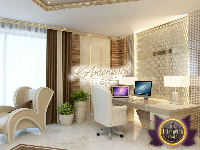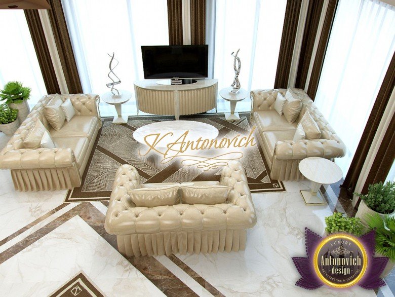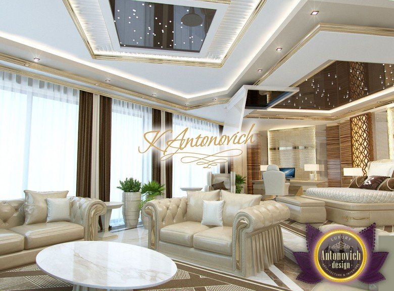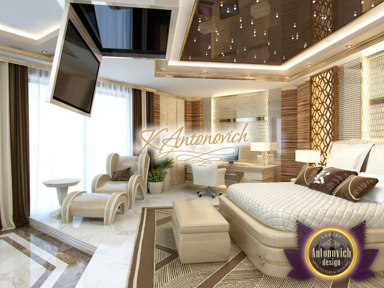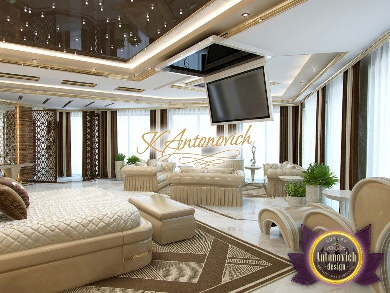 A luxurious interior design with beautiful furniture and decor. As shown in the magnificent furniture designs, this exquisite masterpiece by Luxury Antonovich Design is made with so much beauty and refinement. With its lovely dark curtain highlights and soft cream tones, the bedroom has a luxury color scheme. The ceiling is magnificent and one-of-a-kind, with a television that is ideal for this opulent bedroom design.