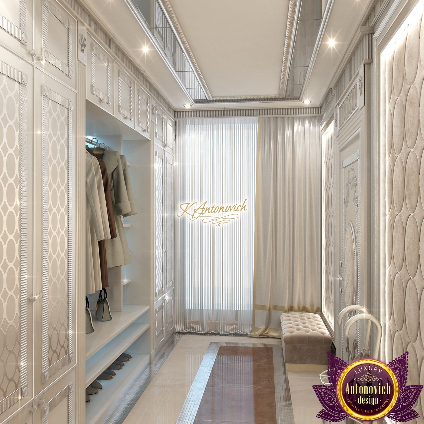 The interior design of the dressing room in the elite house has become a very interesting project. A fairly large room in the building was allocated for the design of the dressing room.That opened up scope for creativity for the interior designers. To ensure proper lighting, the authors of the project proposed to decorate the ceiling with modern lighting fixtures.In general, the design of the dressing room is made in the style of minimalism. The premise is organized as comfortably and functionally as possible.The windows were decorated with modern Roman curtains and blinds. For comfort near the window is a sofa with soft pillows. For convenient storage of accessories, a small insular construction is provided.The bright palette of hues visually expands the space, as well as glossy facades of furniture. In the design of furniture, open shelves with illumination predominate. Thus, the choice of clothes is much simplified.After all, you can visually cover the entire dressing room with a glance. The highlight of the design of the dressing room project become a small work area.This is a great place to relax and think about your ideas. Such a wish of the owners of the house found its perfect embodiment in the dressing room design.