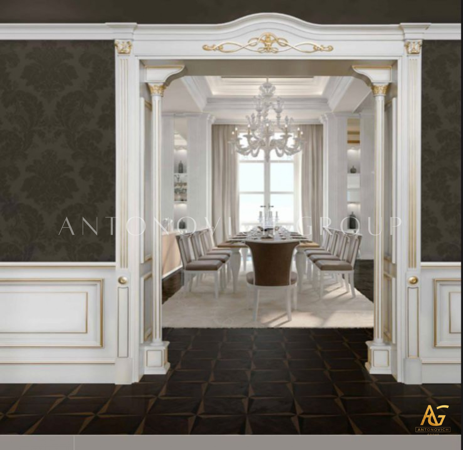 The overall aesthetic of the room influences the ornamental items chosen. Carving and gilding, as well as the personal ambiance of a rural nobleman's snug bedroom- arched entrance with carefully carved craquelures all, contribute to the recreation of palace splendor. The exquisite design of a wooden door with wrought iron parts is connected with the rigid aesthetics of the Middle Ages.