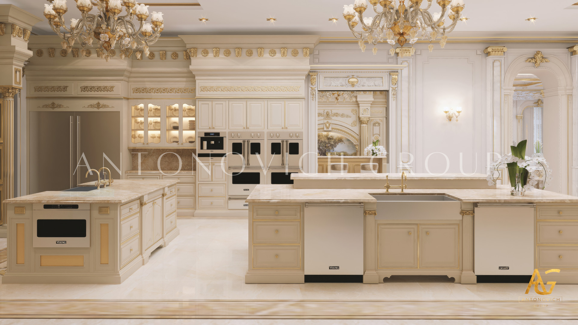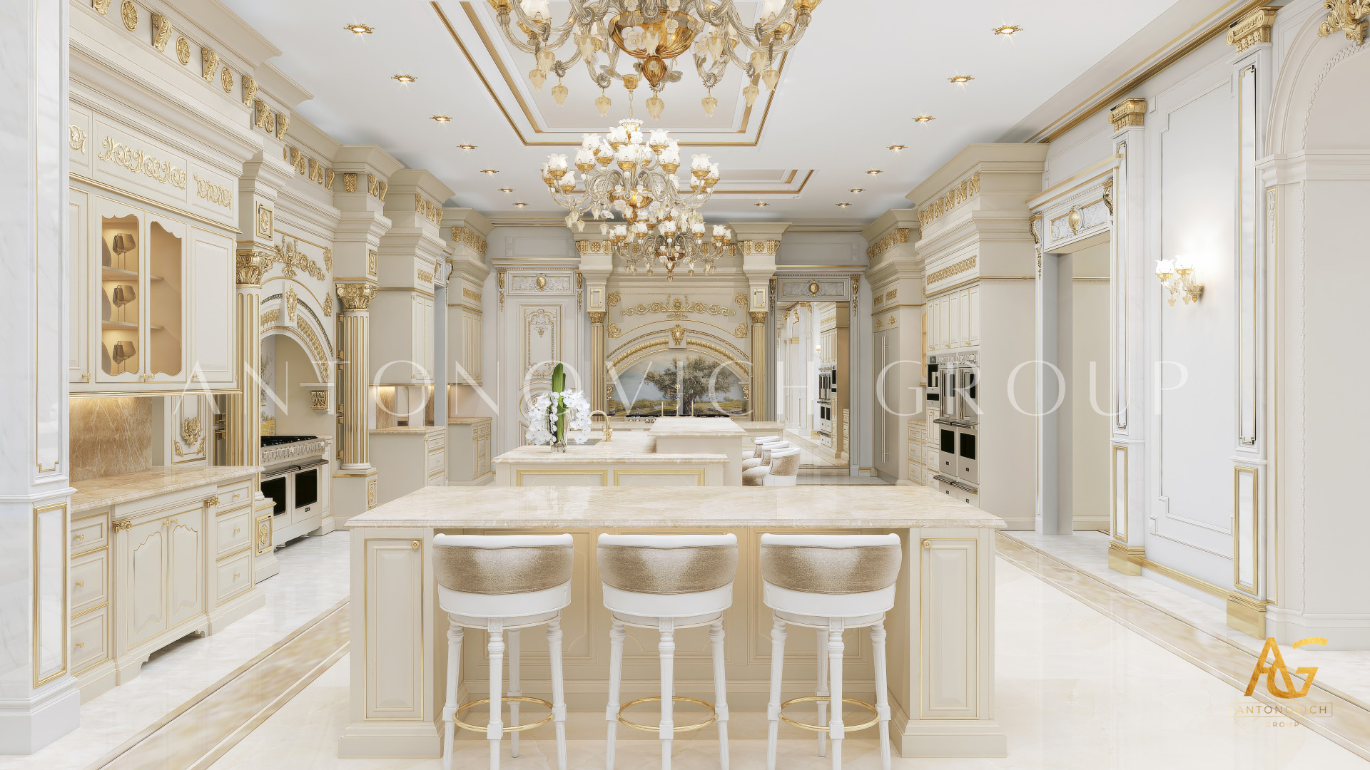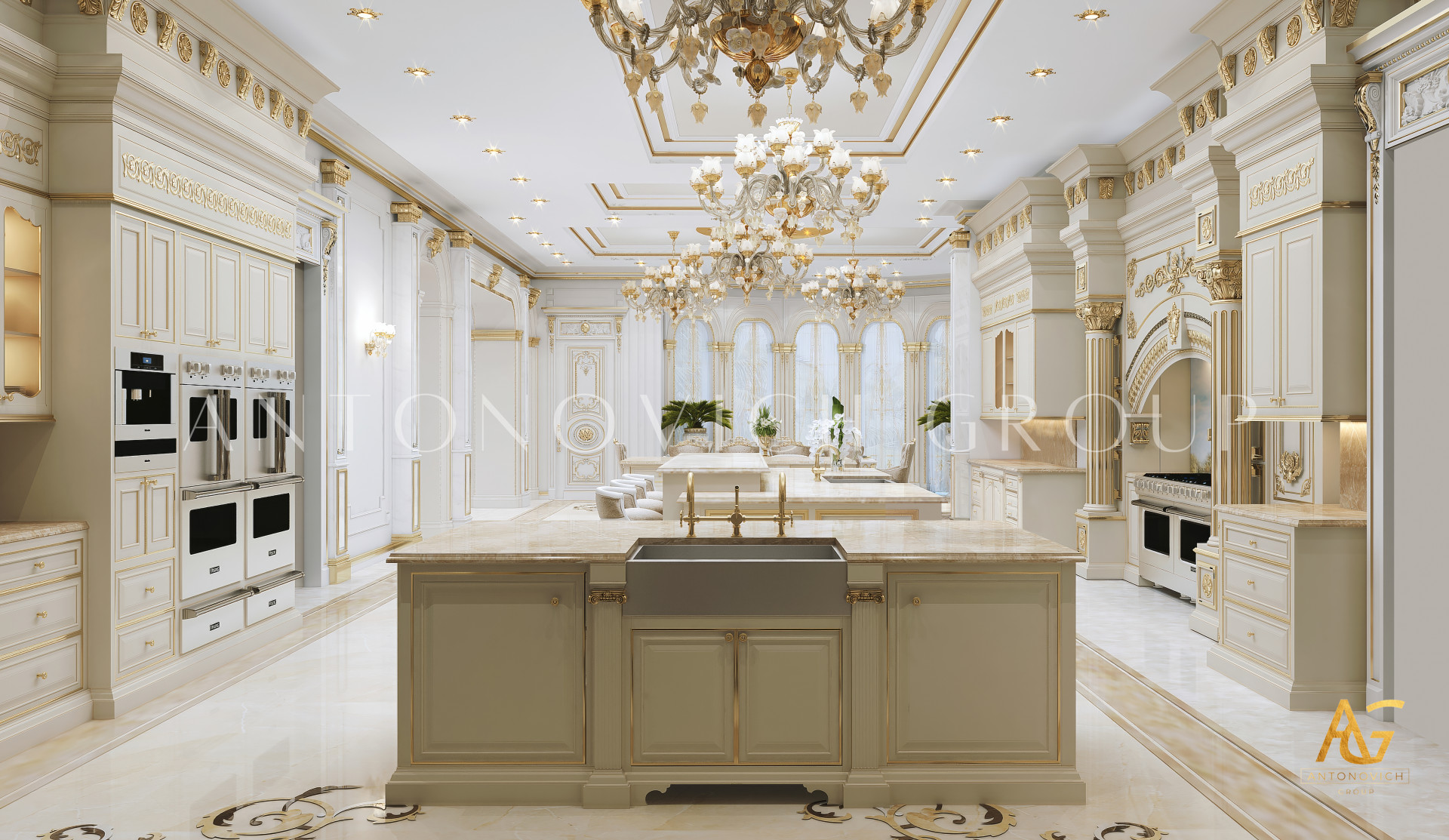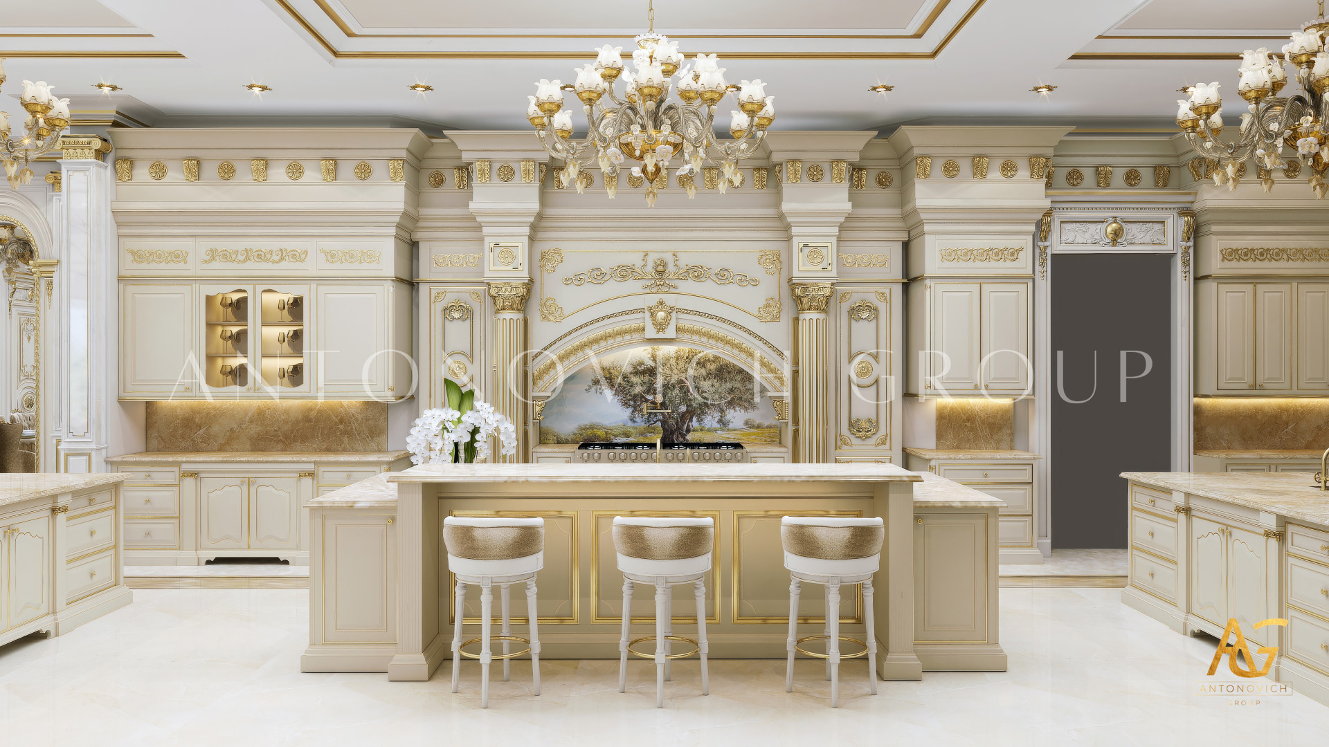 The design of a cozy kitchen in a classical style has become a perfect example of how luxurious a relatively small space can be. Interior designers of the studio Luxury Antonovich Design created a very ergonomic and at the same time refined interior. The kitchen design of the classical style is subject to the same rules and canons of this direction as any other room.Space is filled with exquisite decor. The ceiling is decorated with stucco molding with gilding.The elegant chandelier is surrounded by neat curls of stucco decor with crystal pendants.To ensure the proper lighting of the interior, designers complement the ceiling with small round lamps and furniture with lines of a soft LED backlight.The design of the kitchen in the classical style is always a sign of respectability and aristocracy. In this project, literally, every square centimeter of the interior is luxurious.For floors decor, designers have proposed a practical material - marble. The marble floor was decorated with exquisitely carved patterns of stone different kinds. If the design of the living room in the classical style allows you to create several functional zones.Then for a small kitchen, is only fit the insular structure with a bar counter.Order the design of the kitchen, the owners of the elite house decided in purpose to renew and revitalize the space of the house with refinement and novelty.Furniture of particular importance here. The design of the light kitchen visually expands the room. Light-colored furniture facades are inlaid with carved decor with gilding and rich accessories.These moments are in perfect harmony with the ceiling decor.The design of a classy light kitchen ideally decorates the room with a small window.The highlight of the interior become the beautiful Roman curtains from expensive brocade with golden fringe.