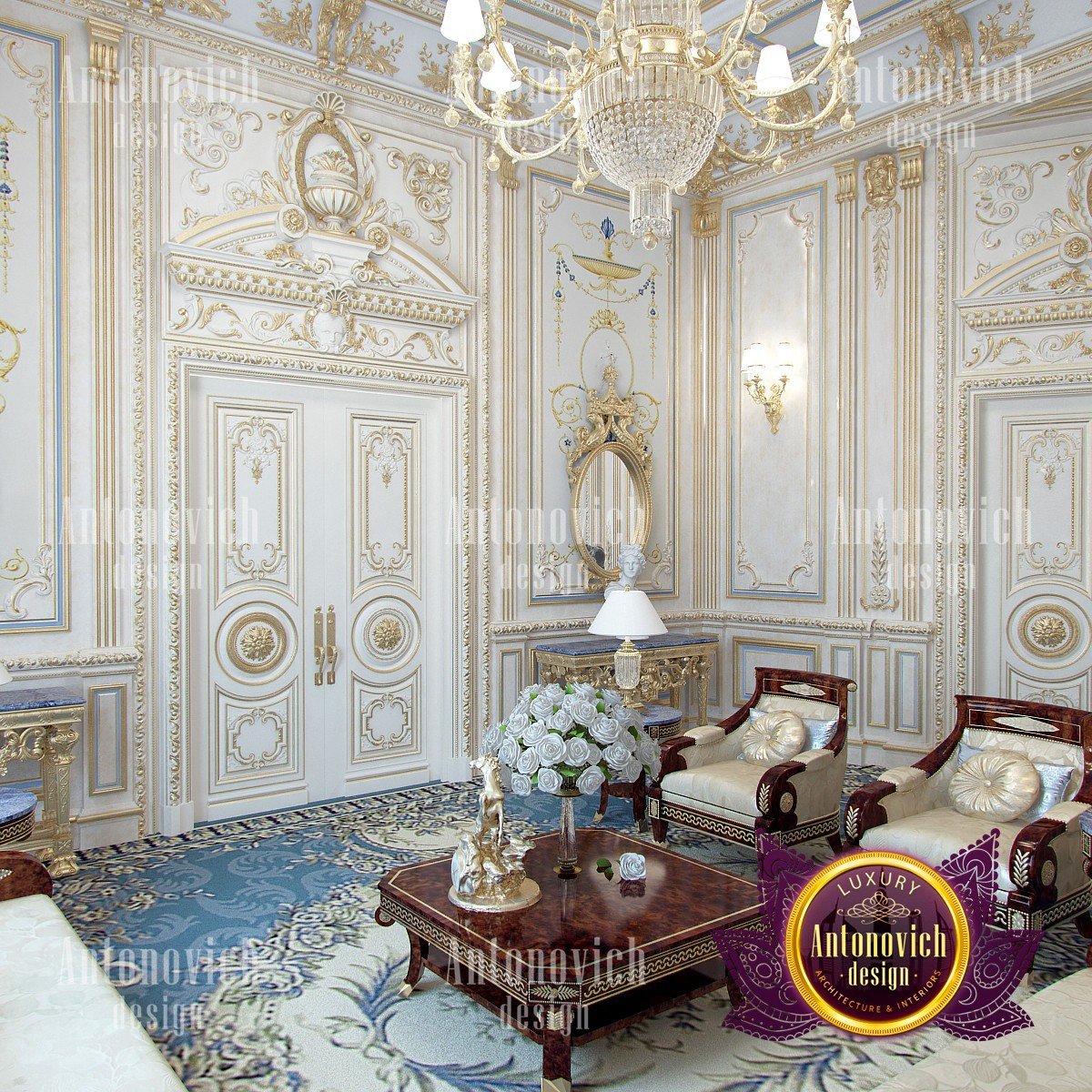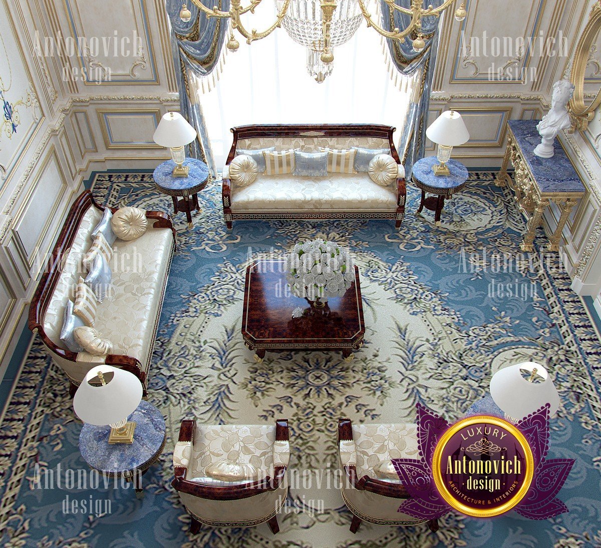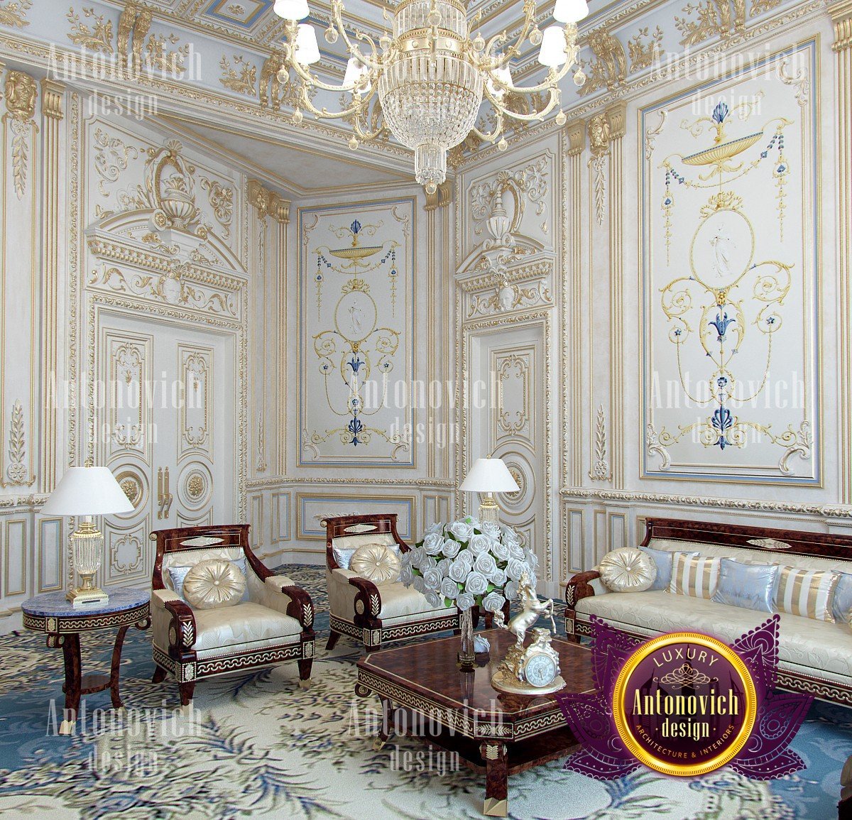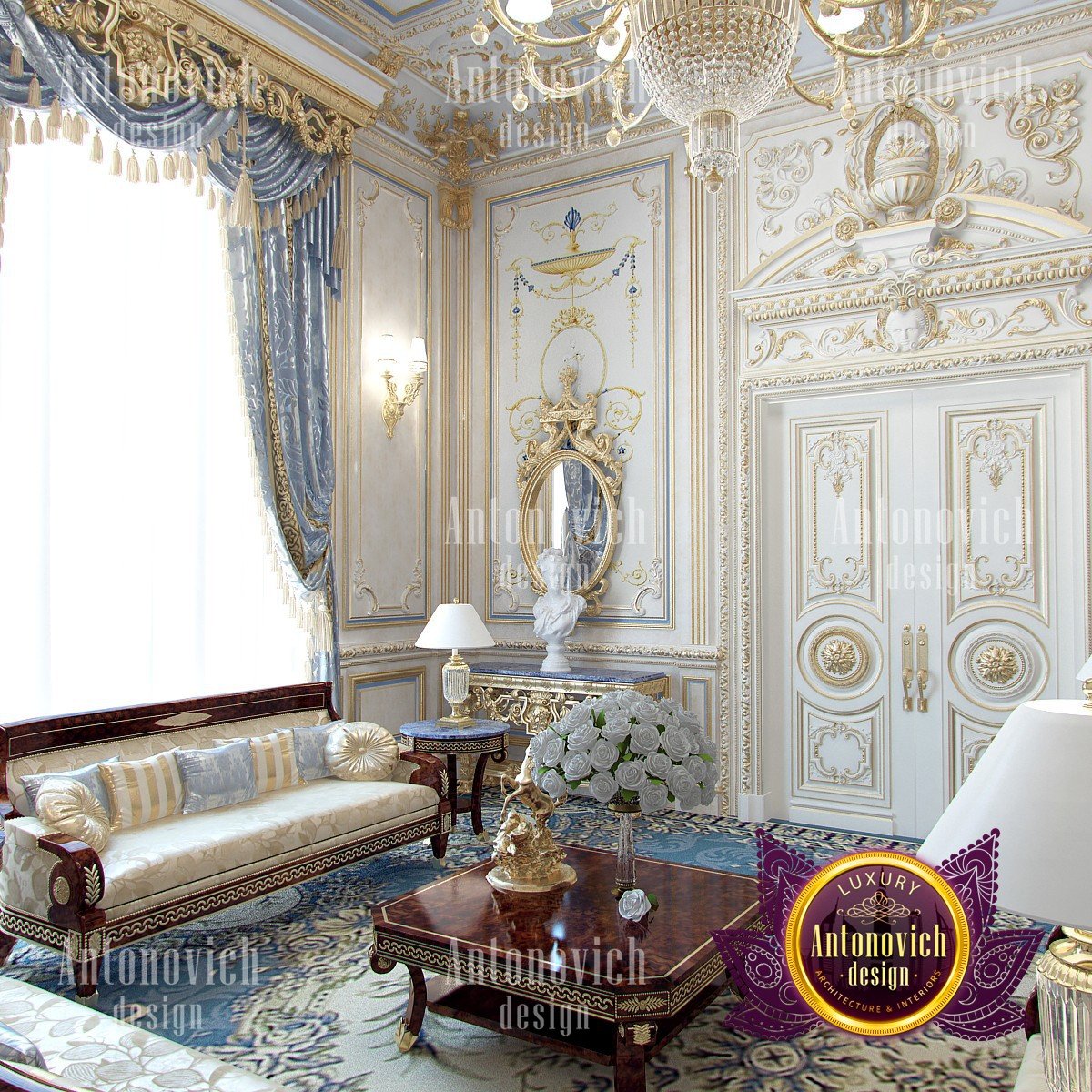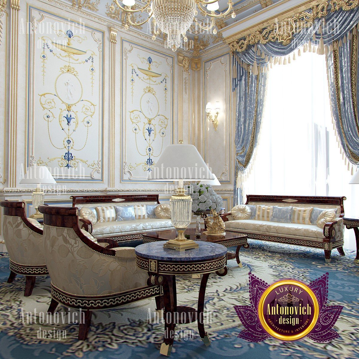 If you drew your own palace in dreams, then surely the image was similar to this royal living room. Baroque, rococo and classical style have merged here together. Designers of the studio Luxury Antonovich Design have developed a project of an elite villa in the classical style. Each room in the house is a celebration of beauty, luxury, and splendor. The rich decor of walls, ceilings, and floors fully corresponds to the best traditions of these three styles. The relatively small space of the living room interior has the advantage of high ceilings. This moment allowed the designers to use the magnificent decor in the form of stucco molding, gilding, and decorative plaster. The combination of white hue, blue and gold is the best exquisite option for such interiors. In the decoration of the walls, the Buiseri are filled with exquisite motifs of artistic painting. To provide the interior with the maximum sense of warmth of home comfort, along with the entire perimeter, the floor was decorated with a luxurious Persian carpet of blue tones. Design curtains for the living room in the classical style have become one of the most elegant moments. Silk velvet of blue color perfectly blended into the interior. A soft wave of lambrequin is supplemented with brushes. With the help of soft holders, beautiful creases of drapery are formed. And finishes this beautiful picture of the interior of the living room with beautiful furniture in classic style. Sofas and armchairs from a dark valuable wood looking gorgeously with noble textiles in light colors with printed ornaments. And the interior is illuminated by a beautiful chandelier with crystal pendants.
