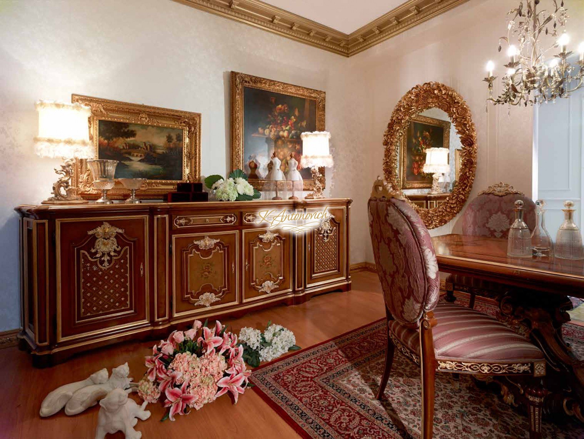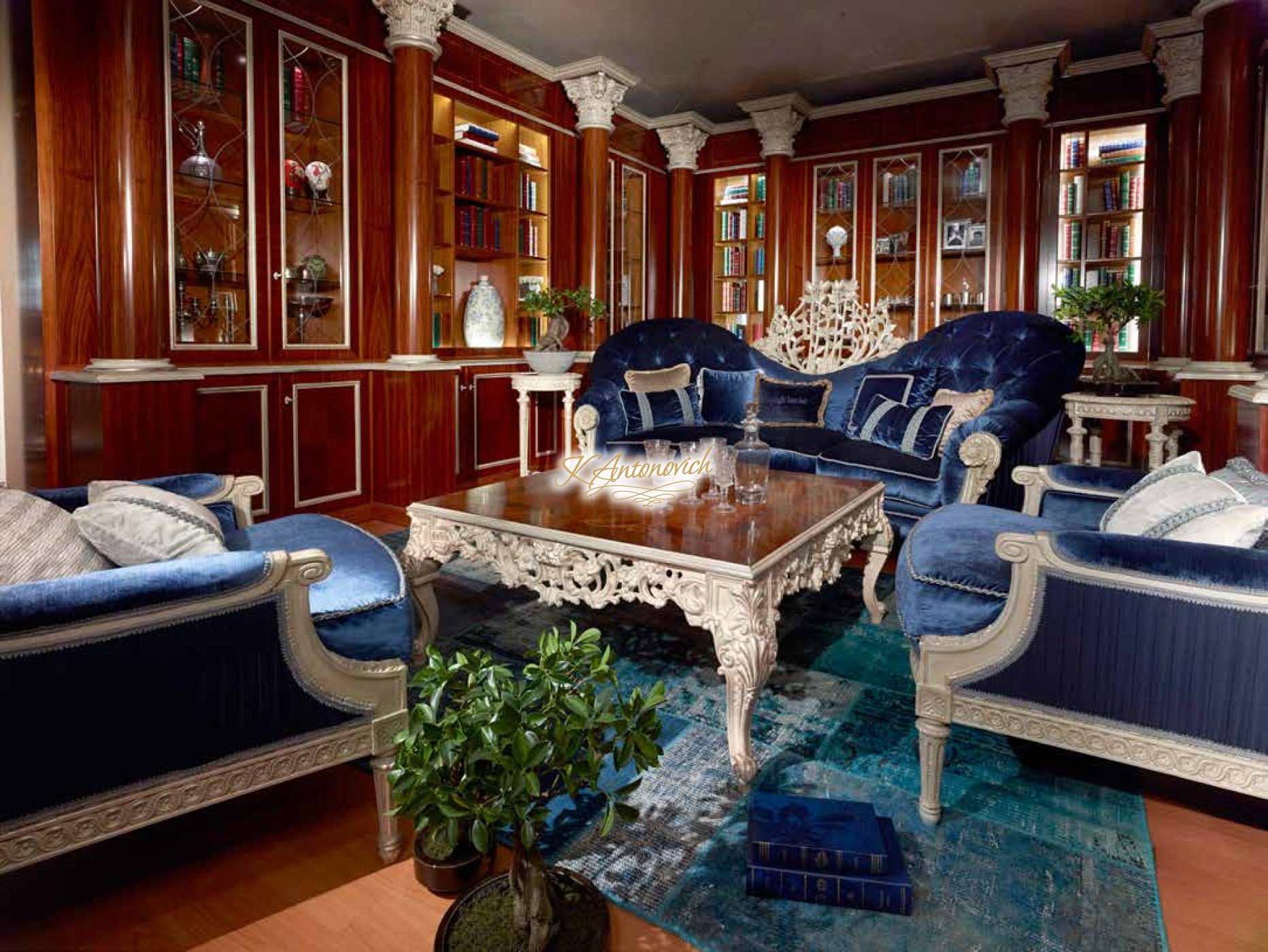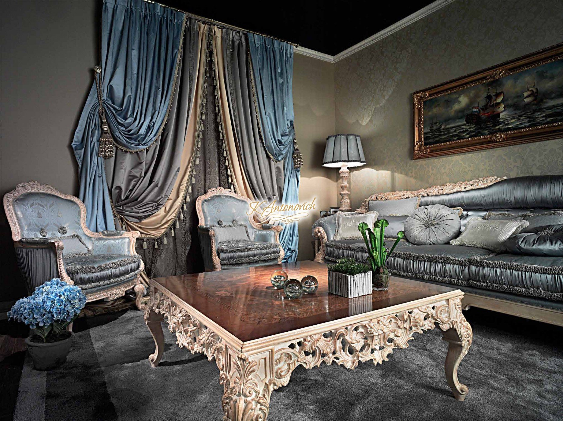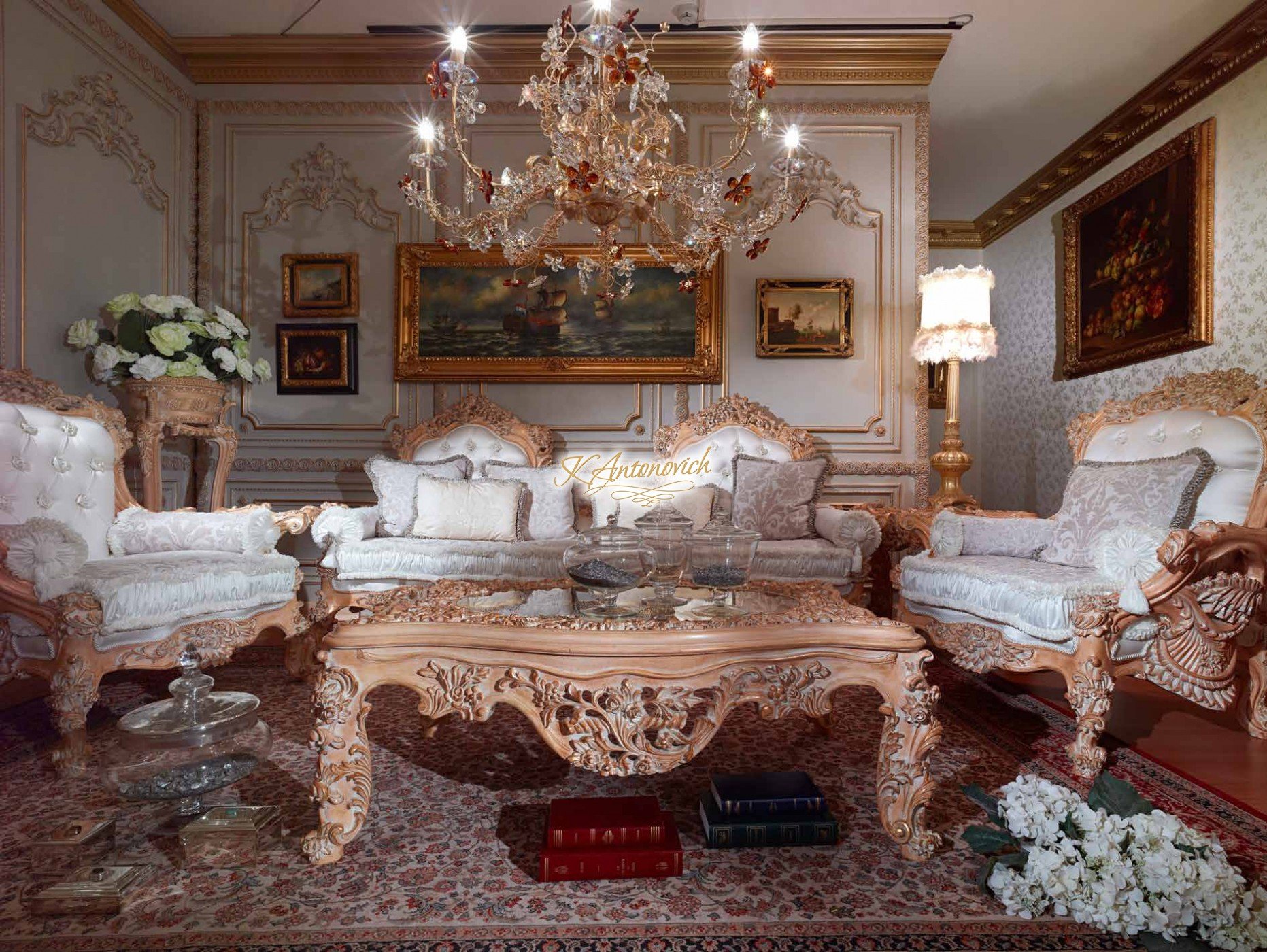 Life is beautiful, full of victories, successes, and achievements. This is what interior designers the of Luxury Antonovich Design Studio wanted to express, creating this design of a living room in a classical style.After all, the owners of the elite house have achieved great success and have high status.They wanted to create their own patrimonial nest, which will delight by the beauty and luxury more than one generation of the family.And it is classical style is a universal way of creating elite interiors that will not be subject to time or tastes changes. The luxurious living room became a natural continuation of the interior of the elegant and magnificent hall. Here, interior designers had masterly combined all the traditional elements of the classical style in the overall picture of a cozy and comfortable room.The ceiling looks most laconic and restrained. His smooth snow-white surface was decorated with a rosette of stucco decor and a chandelier in a classical style.The ceiling outlined by a wide molding with a wave of stucco decoration, which is covered with gold leaf.The additional lighting line makes the ceiling more spacious. In general, the decor of the walls continues the motifs of the hall decoration.In addition, in the living room, there is one very expressive detail. This is a luxurious fresco with art painting, which is framed by an arch and mirrored canvases.A romantic Venetian scenery has brought to the interior a special mood of presence in beautiful Italy. The authors of the project also did not ignore such traditional element of the classical living room, as the marble fireplace. This beautiful symbol of the hearths warmth is framed by a beautiful marble of brown color with a natural texture.Elite parquet on the floor with a classic pattern and natural Persian carpet make an image of luxury and comfort complete in its noble decoration.