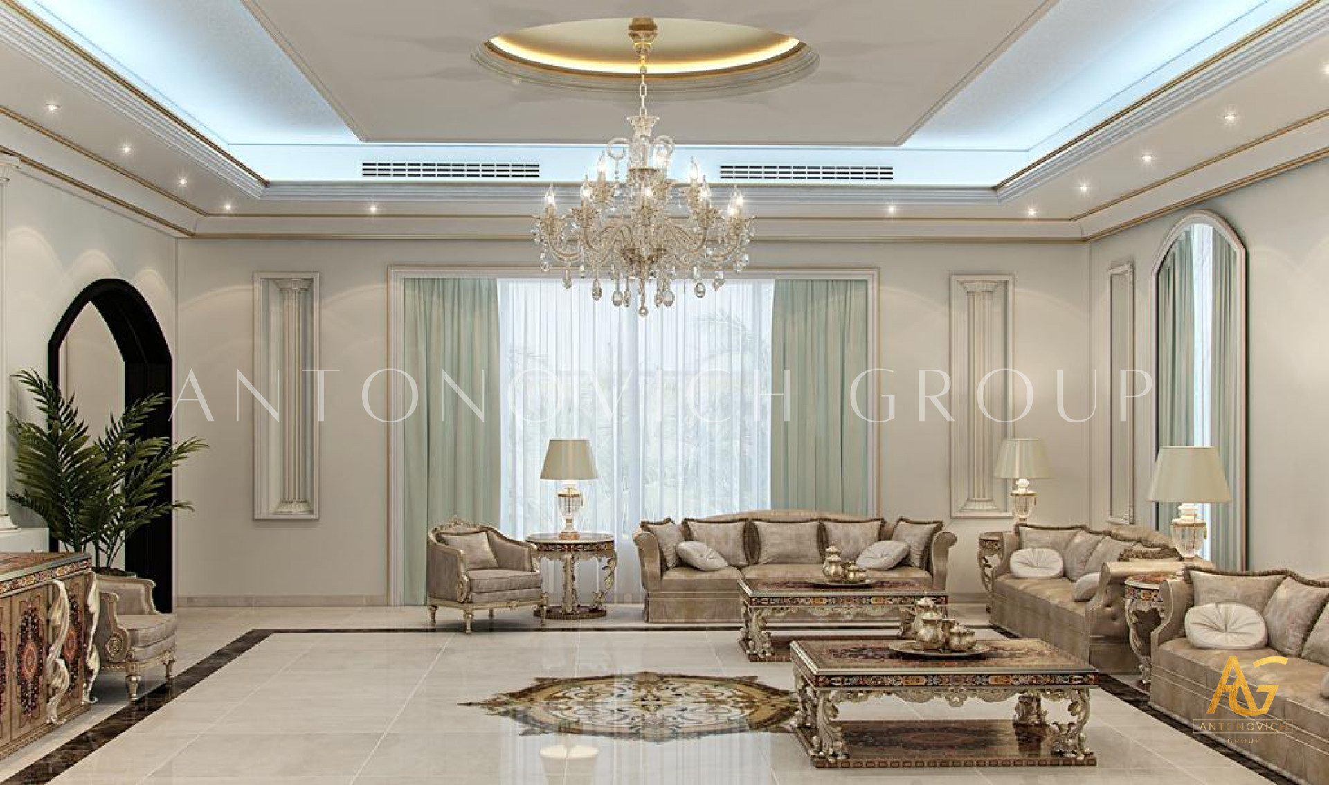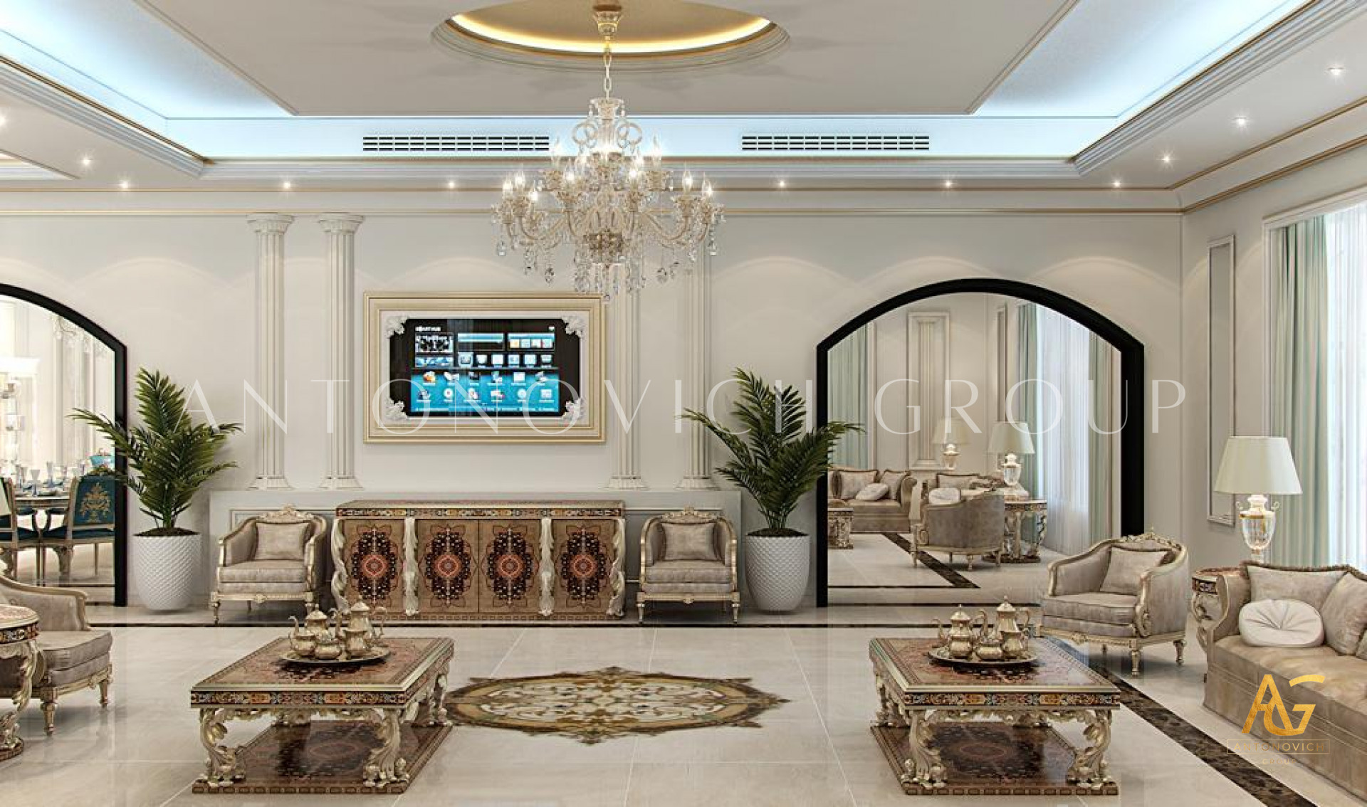 The huge Majlis design, Private in Doha room is only a few steps away from the other area. Fitting the complete luxury interior design of Doha and the majlis has been amazing thanks to the tall, large windows. For a bright, open, and streamlined appearance, the luxury interior design Doha employed white frames and brown drapes. The interior design of the luxury home in Doha was meticulously planned by Luxury Antonovich Design, and much care went into the creation of this work of art. This property, which is situated on a beautiful design, takes in the stunning views of the rich classic interior. This mansion oozes traditional grandeur with its large patterned doors and windows, white walls, and spacious majlis room. The Modern villa interior design in Doha attraction of the property is that it is a lovely luxury majlis in Doha with a sofa and soothing couch. The luxury majlis has a large room filled with high-end furnishings, which is a must-have for high-end homes. From the exquisitely crafted majlis room space to the European-themed décor, dramatic accent lights, and expansive layout and design, the majlis exudes luxury. A beautiful Crystal Chandelier greets you as you enter the majlis room. The opulent residence in Doha has a high ceiling to give it more space and beauty. A luxury majliss interior design was built to provide a lavish environment.