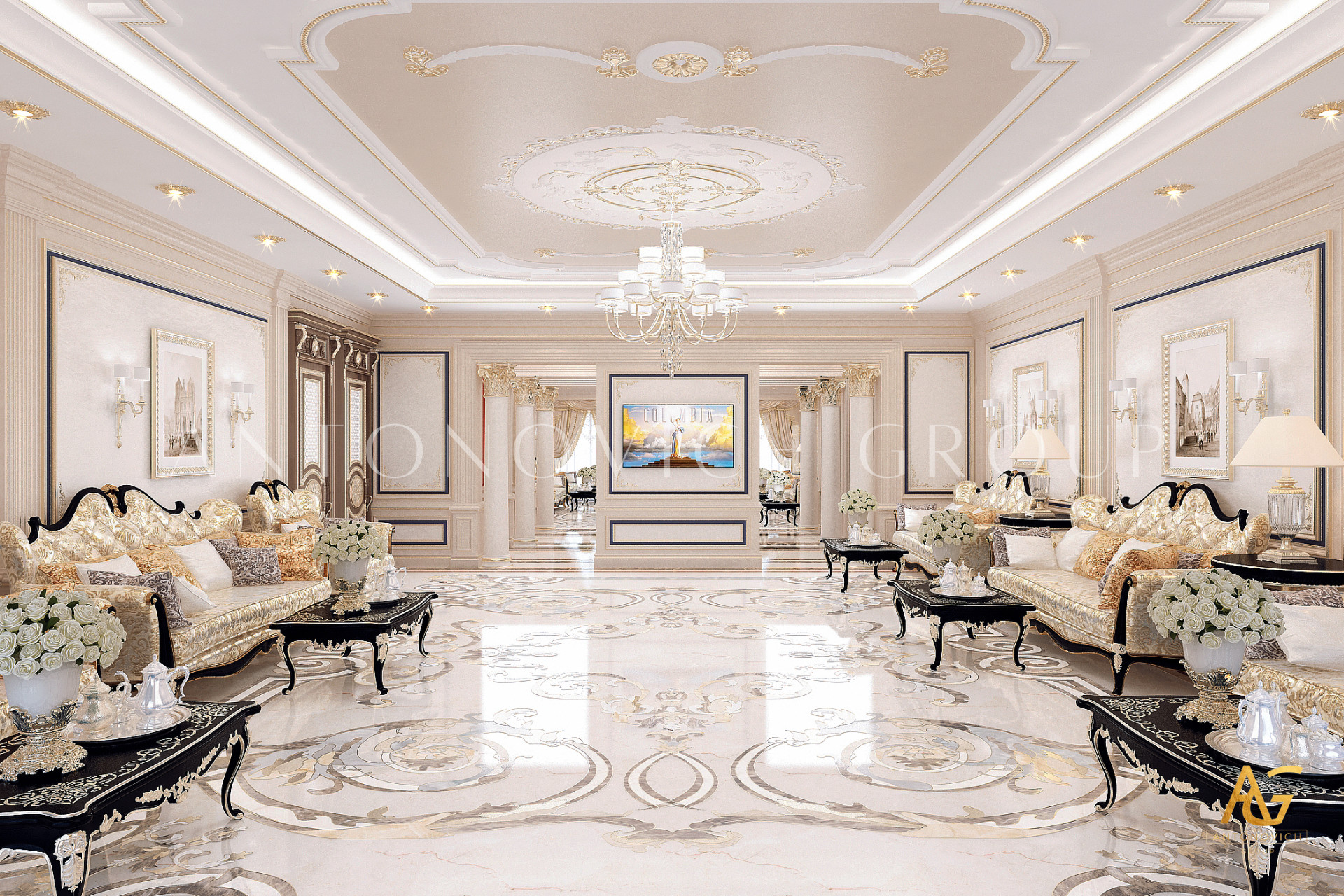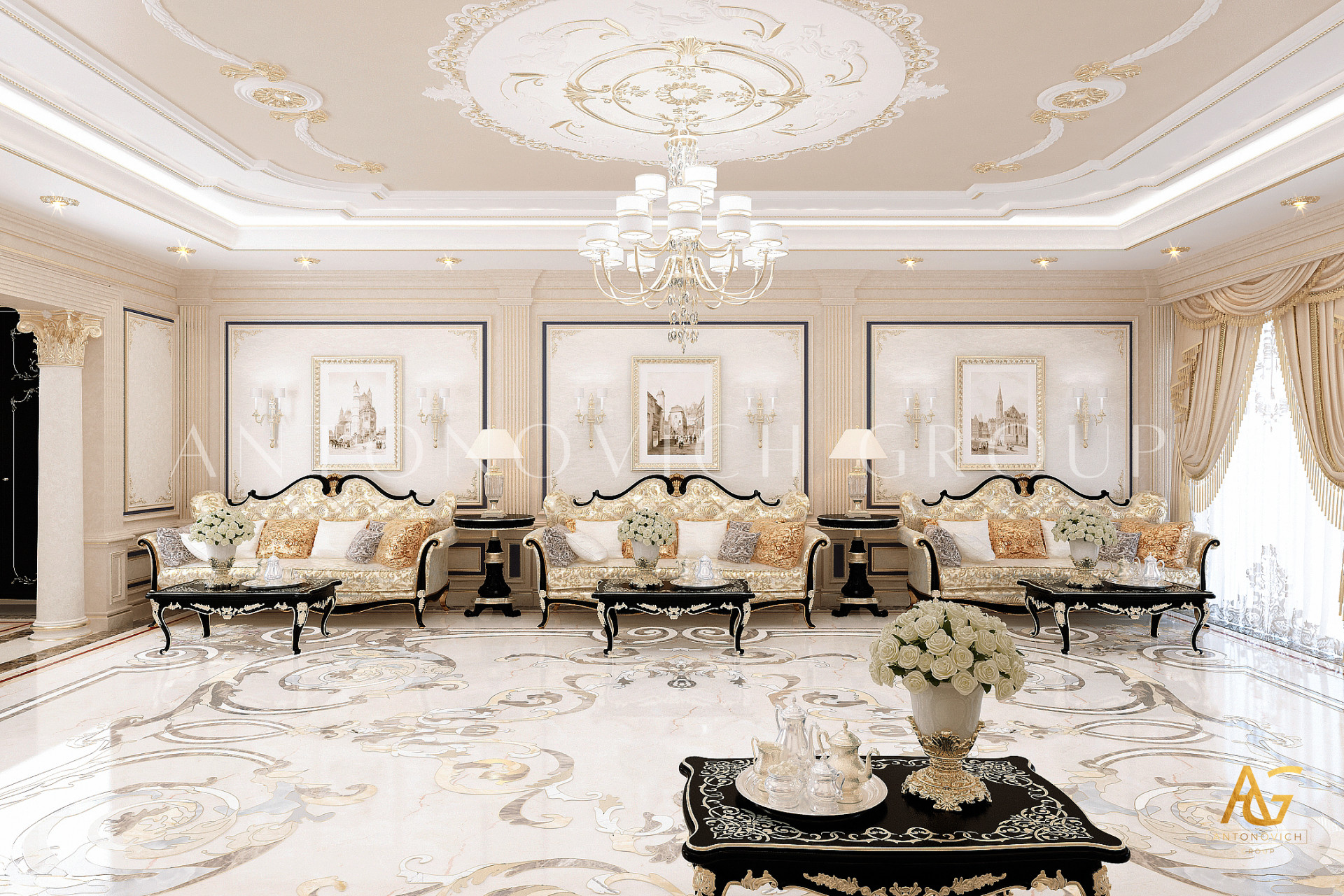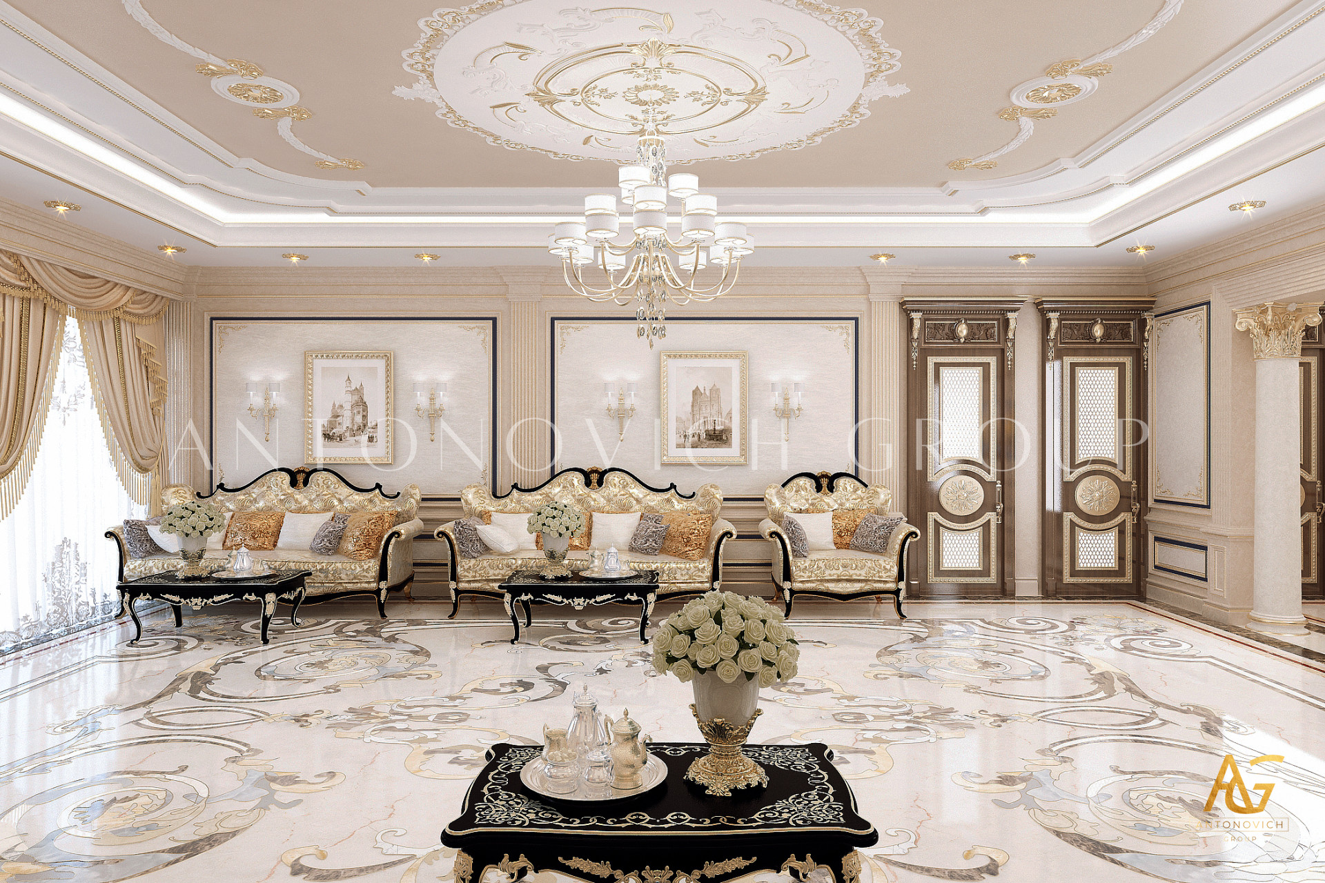 Elegance, elegant, refinement. That is how you can describe this beautiful interior of the living room in a classic style. A timeless classic in the works of talented designers the studio Laksheri Antonovich Design acquires a special charm and aristocratic refinement. Every detail, every square centimeter is important in creating a solid and artistically expressive image. The decoration of the walls in the best tradition of the classic style of the interior is decorated with exquisite pilasters with stucco and gilding. The basis of the design of walls was decorative plaster of creamy tone. Against this restrained and noble background looks great paintings and classic lamps. To dilute this restraint interior, designers complement the decor of the walls by mirrors inserts and narrow stained-glass windows made of brass with backlight. Noble restraint inherent also to the ceiling decor. Multilevel niche delimited by lines of illumination. Elegant crystal chandelier surrounded by extra spotlights. Flooring from light-colored marble, with elegant swirls patterns, carved in stone of several rocks to bring to the interior a touch of glamor and glitz. Furniture arrangement became the basis for maximum comfort and proper organization of the beautiful interior of the living room space. Soft sofas on gracefully curved legs are covered with beautiful fabric with printed patterns. Next to each sofa placed the snow-white coffee table. This corresponds to the tradition of oriental hospitality when the house is always welcome guests and are ready to offer the best of everything.