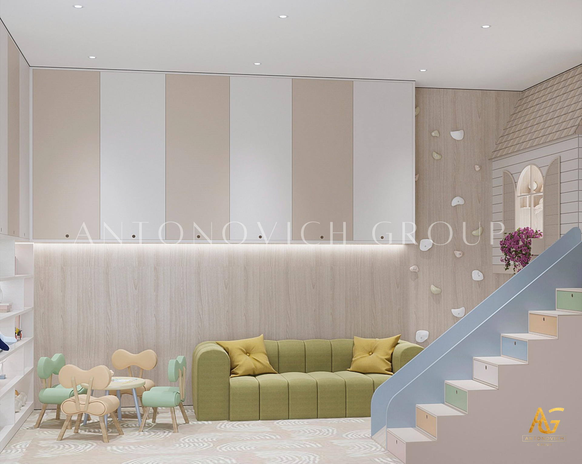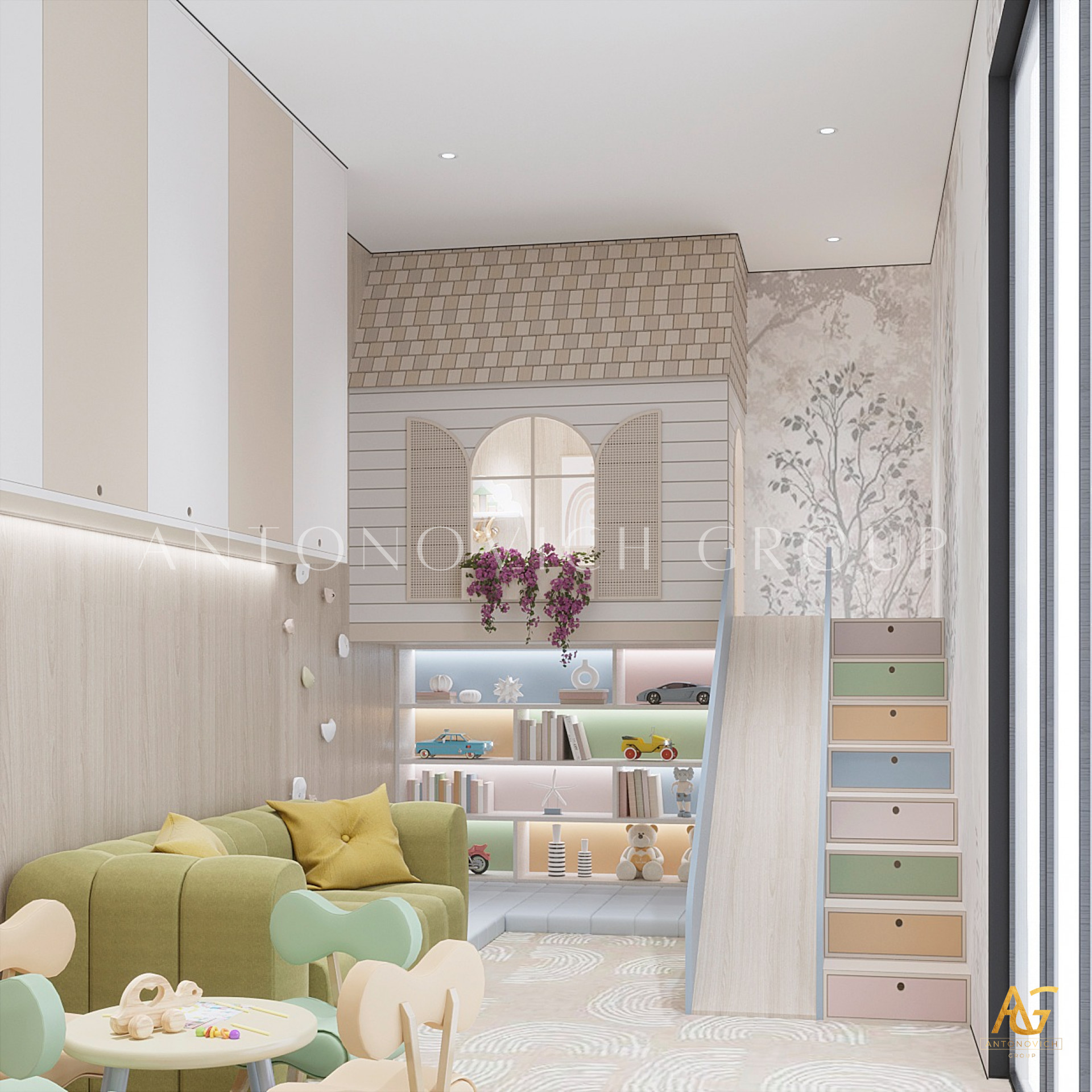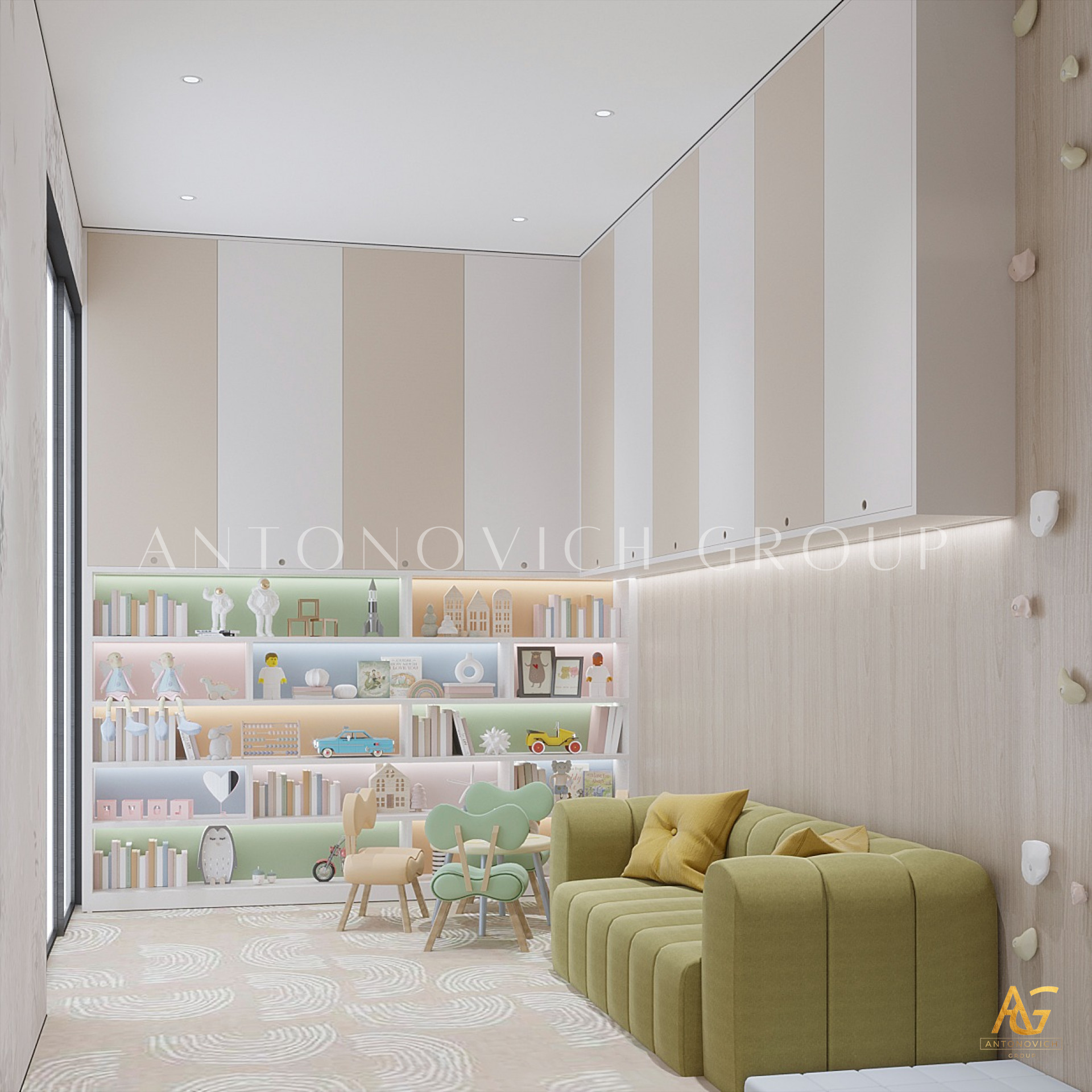 Antonovich Group understands that a kid's bedroom is more than just a sleeping space; it's a canvas for creativity and playfulness. Introducing a colorful pastel palette becomes the first stroke in creating an atmosphere that sparks joy. Soft pinks, serene blues, and gentle yellows form a symphony of colors that not only visually expand the space but also evoke a sense of tranquility and happiness.