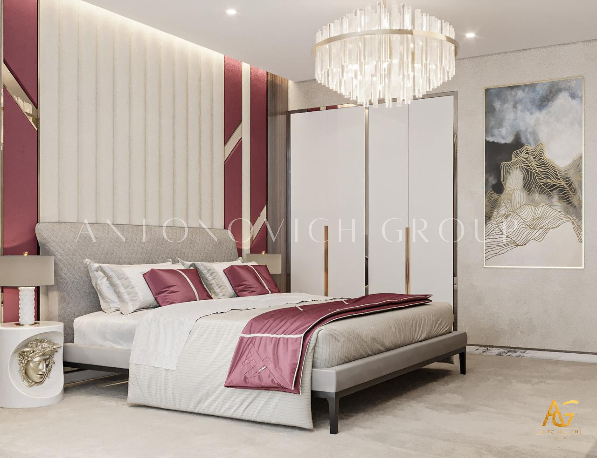 The stunning interior design by Luxury Antonovich Design has a balance of luxury and beauty. By its very nature, luxury rooms tend to be too much and overwhelming, with so much going on, but this luxury bedroom interior design is created with the proper layout in mind. The beautiful colors of the room dont seem too loud. It is the right color for a relaxing ambiance.