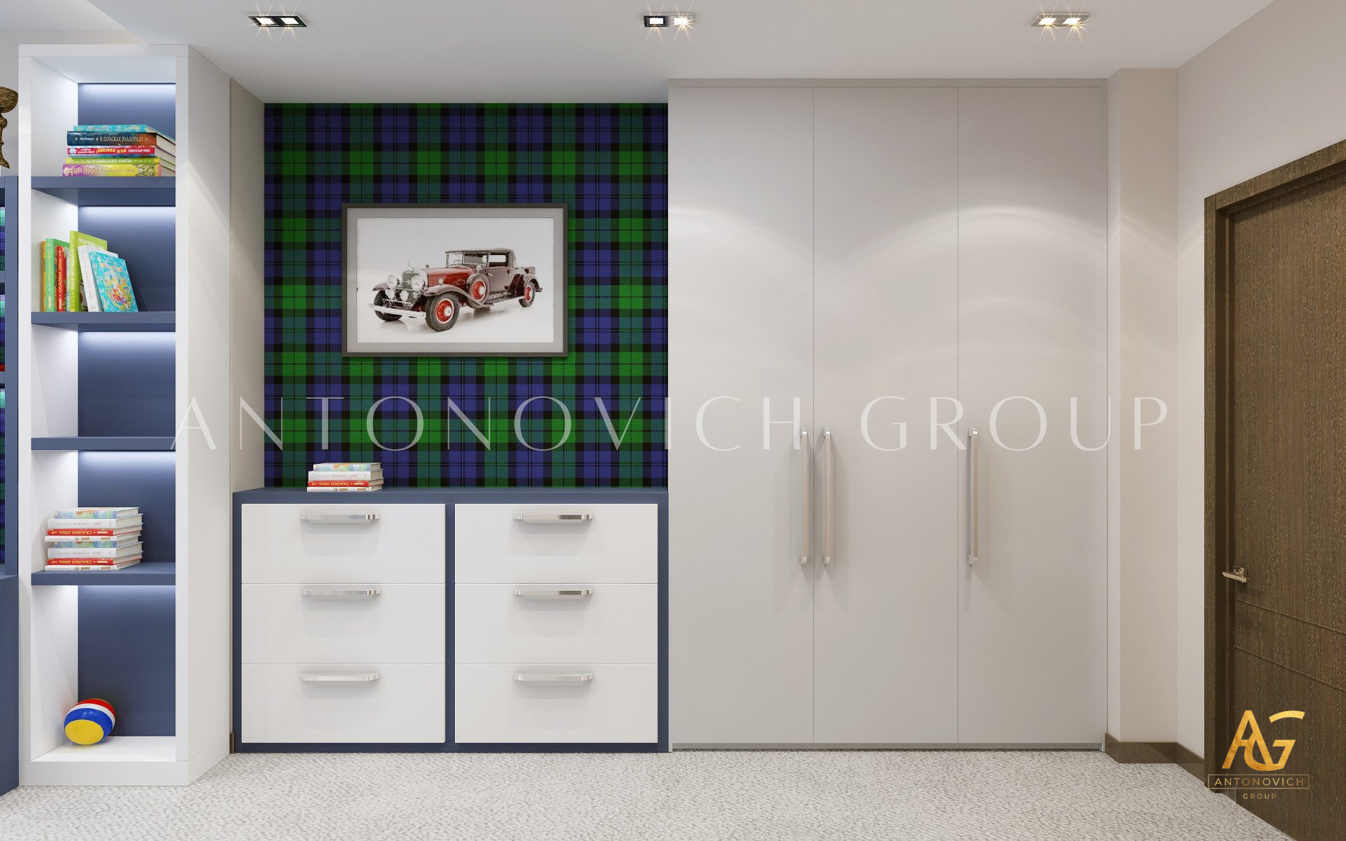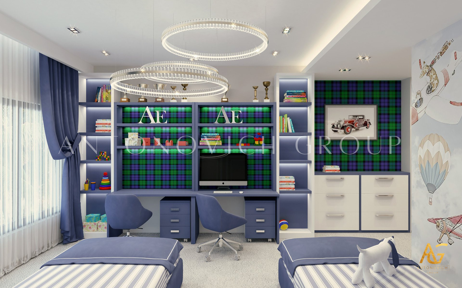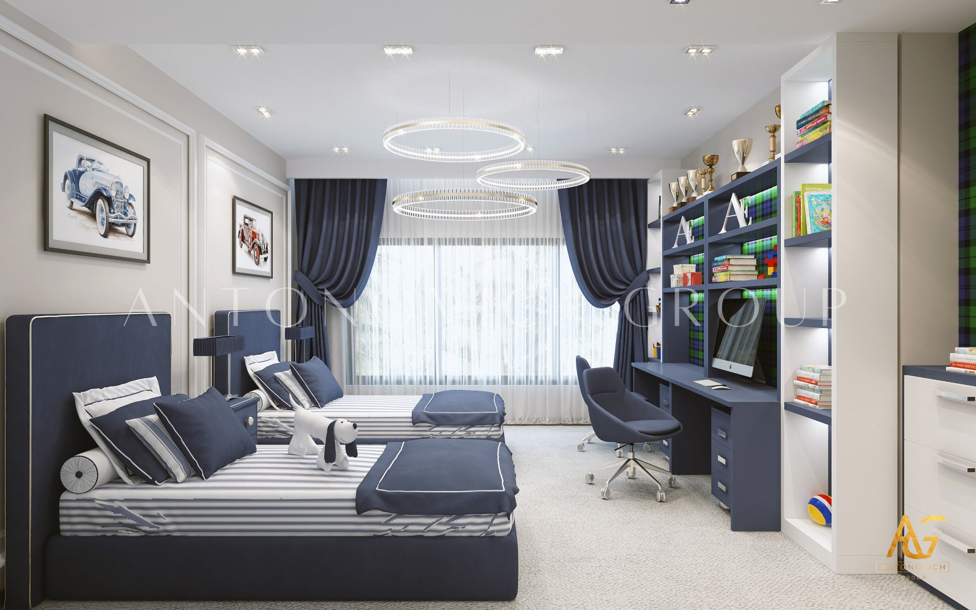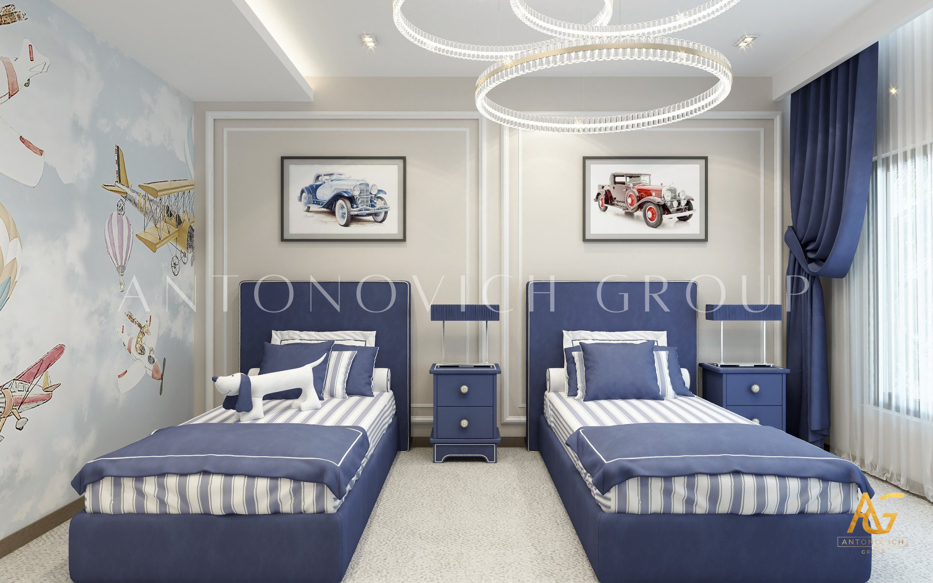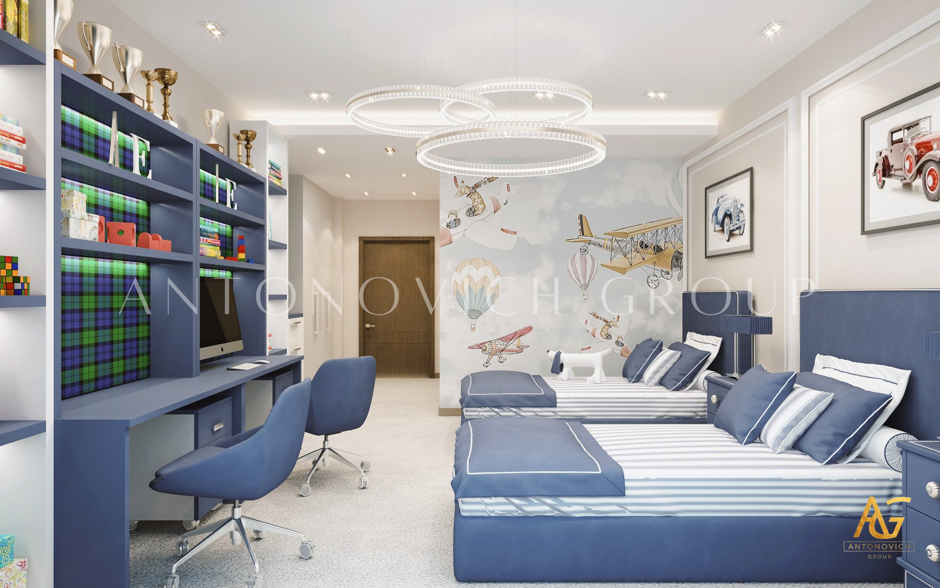This comfortable children’s bedroom design for boys has a twin style bed setting. It has been filled with the most wonderful and creative wall art pieces that makes the bedroom looks more interesting. Even it is a twin bedroom interior design, Luxury Antonovich design has managed to achieve the setting with the best interior design Dubai and create it very functional. It has the right spacing for the study area with two separate desks and a very nice arrangement of cabinetry and drawers for a more useful purpose. The bedroom has the perfect shades of lighting at the same time has a great access of natural sunlight during the day thru a huge glass window covered by the finest fabrics for curtain and shades.