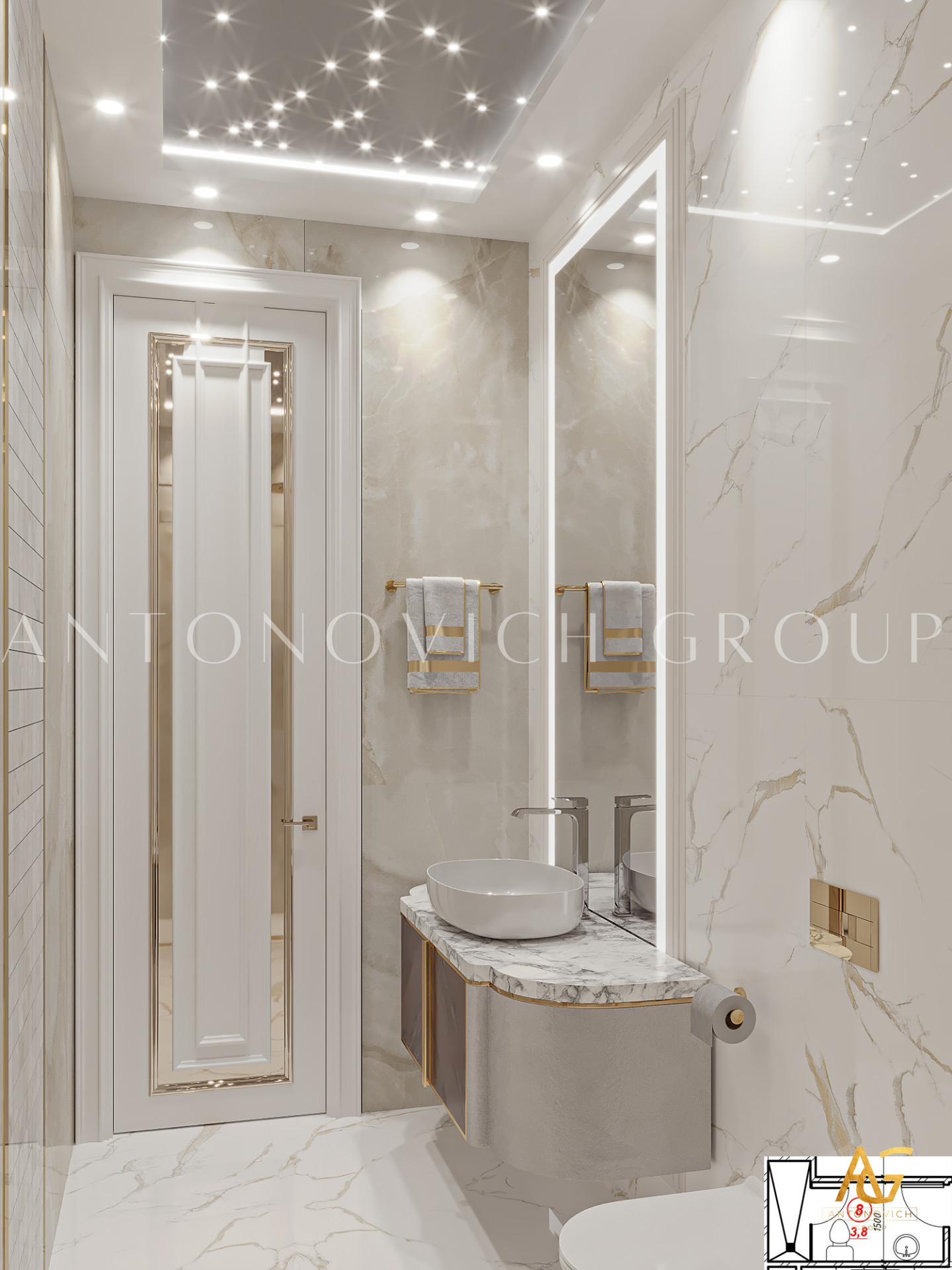 Antonovich Group provides complete bathroom and powder room interior design services from start to finish. From design visualization to construction, remodeling, renovation, redecoration, fit-out, sanitary material selections, premium class bathroom equipment, installation, and repair to the final turn-key solution, we have you covered. Our team makes every effort to perform the perfect interior design arrangement in every bathroom with the most unique and stylish design like no other. Our high standards in performing every interior fit-out procedure are always consistent, as we always meet and exceed our clients expectations.