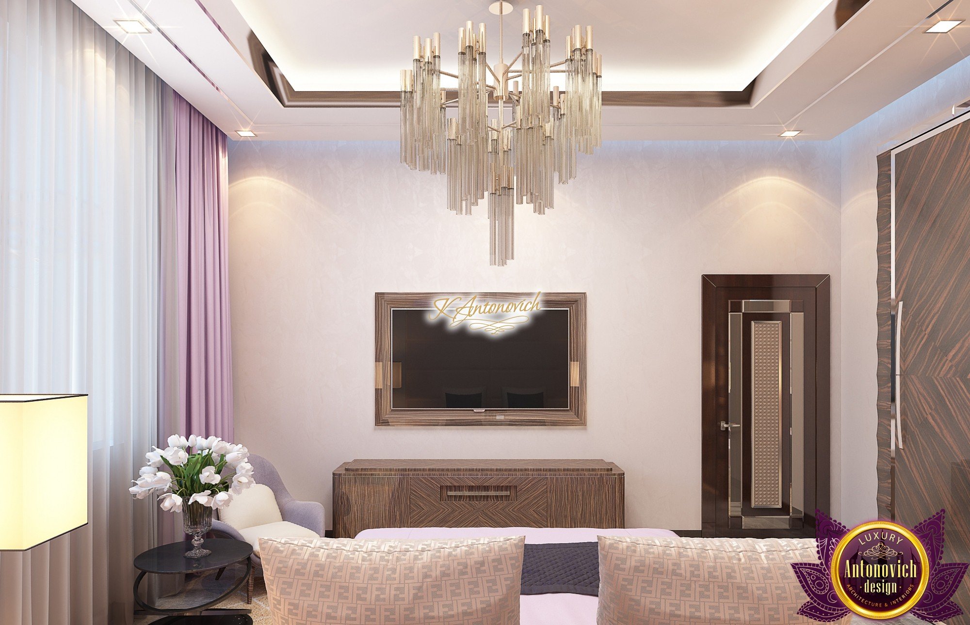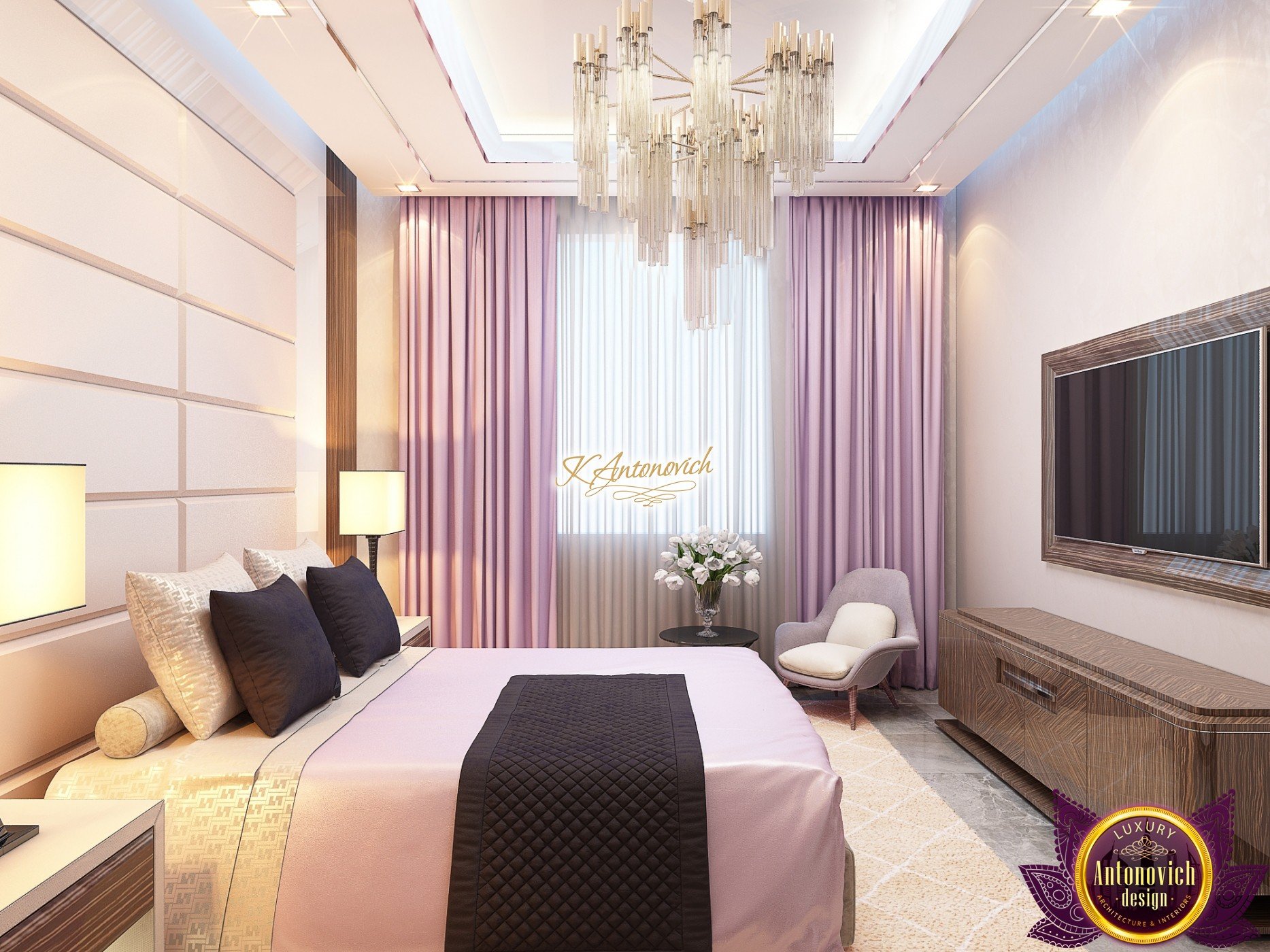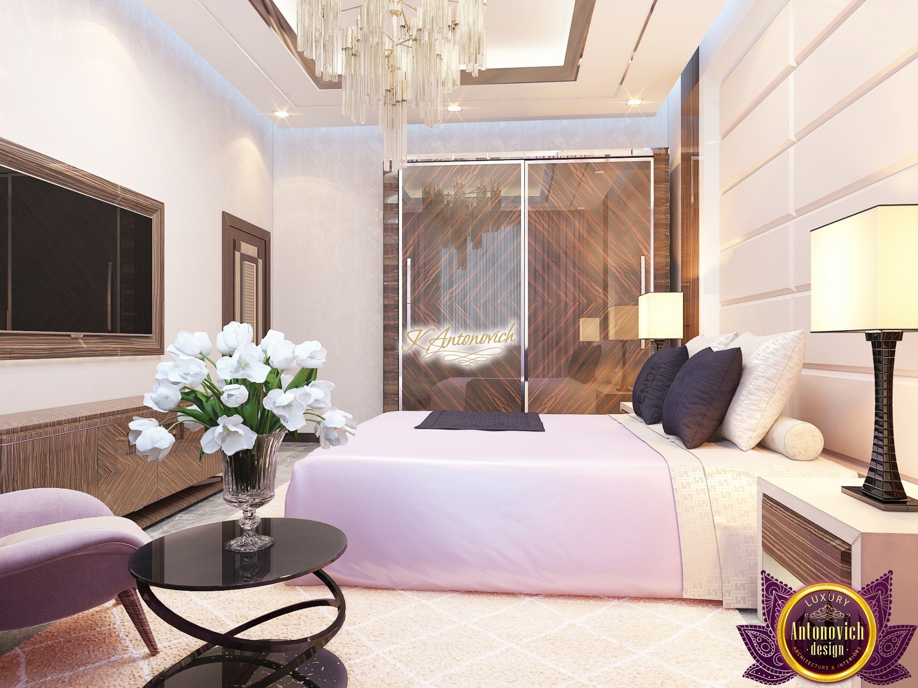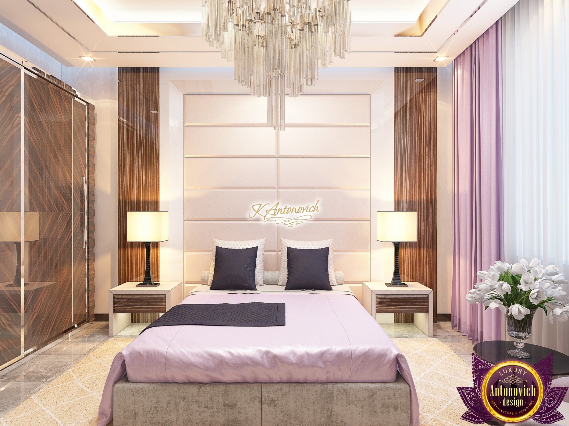 The lightness and the feeling of complete freedom this wonderful bedroom interior in a modern style gives. Interior Designers of studio Antonovich design combine minimalism and modern, to get such a vivid and yet elegant interior.Warm colors range, from milky white to pale pink, fills the room with warm and cozy mood.The Pleasant feeling of warmth very nature has brought into the interior by decor made of wood valuable species.Decor panel of the wall, behind the headboard, combined wonderfully with a large and functional wardrobe.The decor of the walls in the interior of a bedroom in modern style became the bright accent.The wall behind the headboard upholstered and decorated by a soft panel made of the genuine leather color of milk chocolate. And the very shape of the panel is visually reminiscent of a chocolate bar.Such refined and "delicious" moments in the interior of the bedroom makes it a special and unique.Another striking element in the interior of the bedroom was the ceiling decor. Deep niche visually makes the room higher.It is illuminated by the entire perimeter of soft line illumination.And in the center, ceiling decorated quite a large crystal chandelier in a modern style.Complement the interior lighting, elegant lamps on the bedside tables. For floorings, designers have offered precious marble and natural fluffy carpet.Curtains in the modern style of genuine silk pink hue became a beautiful finishing touch in this cozy bedroom interior. Design in a contemporary style becomes a great opportunity to fill the house with originality and exquisite charm.