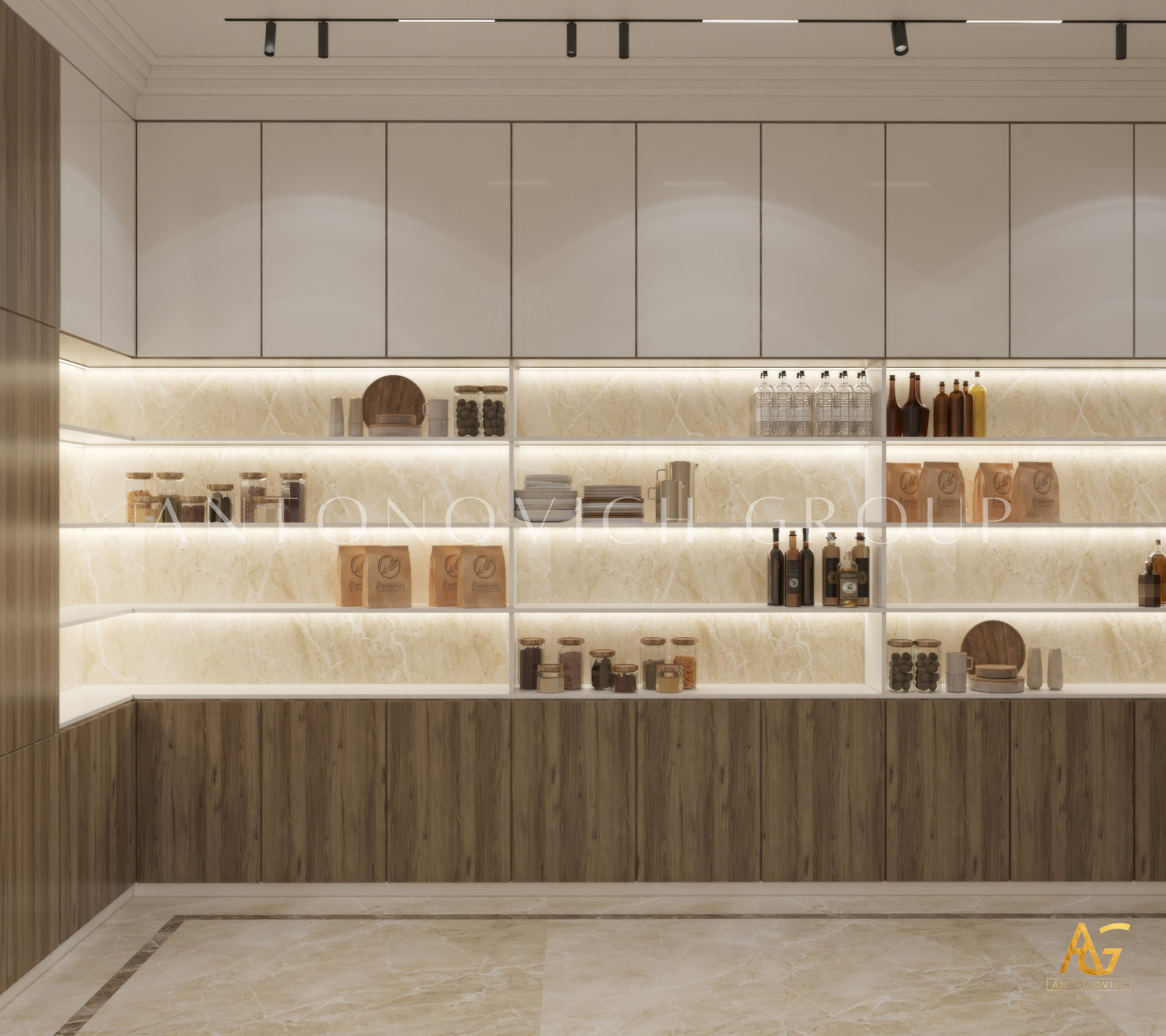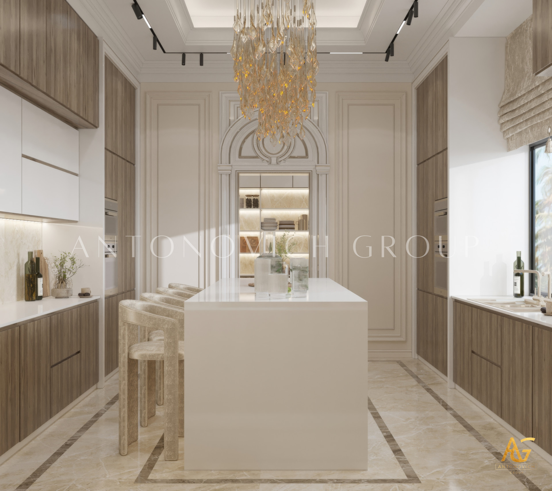 Interesting design of the kitchen in a modern style was offered by interior designers of the studio Luxury Antonovich Design. The interior is designed in the style of minimalism and is characterized by many-sided solutions in the use of decor materials and lighting. Kitchen design ideas are always aimed at creating maximum functionality when using this space. This is a rectangular kitchen format with an insular working surface. This bold and original solution was the result of one of the wishes of our customers. They travel a lot and decided to embody the idea of one of their favorite restaurants in Asia where the food is prepared right next to the visitors. Modern kitchen appliances can easily implement such design solutions. To emphasize an insular working area, interior designers used a luxurious framing in the form of a beautiful marble with silver stripes on the floor.The super design of the kitchen pleased the customers with the perfect harmony of lines, materials, and textures. The design of the kitchen for the house is laconic due to the selection of furniture.Kitchen furniture with light facades occupies the kitchen space almost along the entire perimeter. This allows you to conveniently store everything you need. The interior and design of modern kitchens also imply the use of the latest storage systems. Today it is the most automated and high-tech designs that make the use of kitchen furniture as convenient as possible.The design of the kitchen Dubai harmoniously continued the design of other rooms. The curtains become a beautiful accent in the interior of the kitchen. This is a variant of Roman curtains premium class.Ideas for interiors design of kitchen by the studio Antonovich Design is always an exclusive solution. Our goal is to make the kitchen design not only comfortable and functional but also as luxurious as possible in any style.