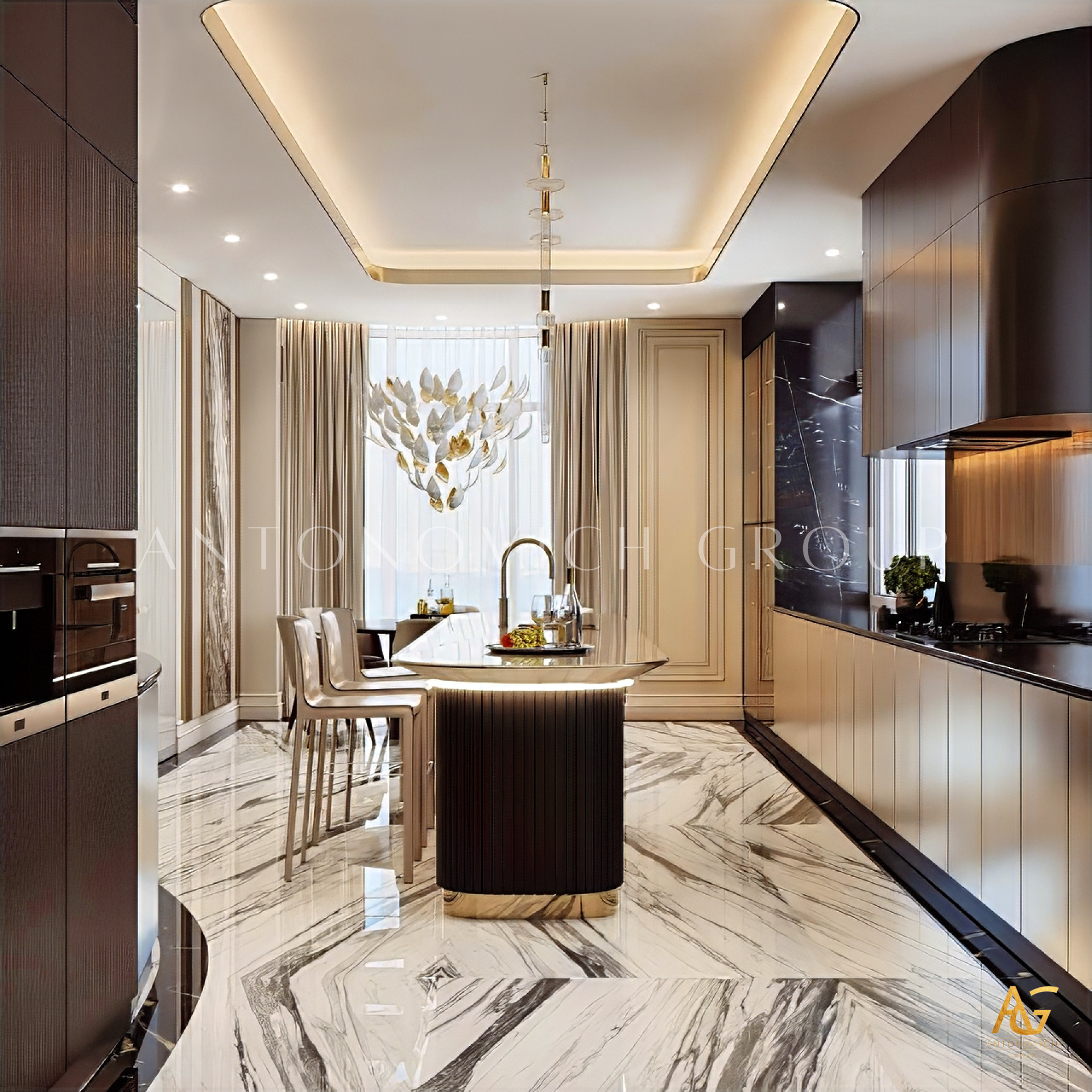 The design of the kitchen nowadays closely related to new technologies. Designers of the studio Luxury Antonovich Design in the work on kitchen projects use modern technology and the latest storage systems.The interior design of the kitchen became part of the work on the project of the villa in a modern style. The spacious room continues laconically overall design concept. Here there is a laconic minimalism and extravagant features of a modern style. The design of the kitchen in a private house it is always the work on the space of a large area. Thanks to this, designers manage to create not only functional but also very luxurious interior.The interior design of the kitchen in a modern style is filled with lightness and freshness of design ideas.Laconic and respectable looks every square meter of the interior.Curtains for the kitchen are made of luxurious silk monophonic bronze hue. White Italian marble on the floor is delineated with thin lines of polished brass. Such details give a particularly exquisite charm to the interior. A special configuration of the premises made it possible to combine the kitchen area and the dining area.Even more, these two rooms are almost independent. The interior design of the kitchen in high-tech style is always filled with moments of intellectual comfort. Behind the flat facades hidden the newest kitchen appliances, convenient storage systems and a competent arrangement of shelves and boxes.Working on the design project of the kitchen, we always think over the algorithm of actions of our customers in the kitchen. The interior design of kitchen in modern style with high-tech accents is one of the most popular interior design options.Thus, interior designers emphasize the bright individuality of the owners of the house.Modern interior design of the kitchen, it is creativity with engineering notes. And each design project of the kitchen from Antonovich Design serves the main purpose - providing the perfect comfort and coziness for our customers.