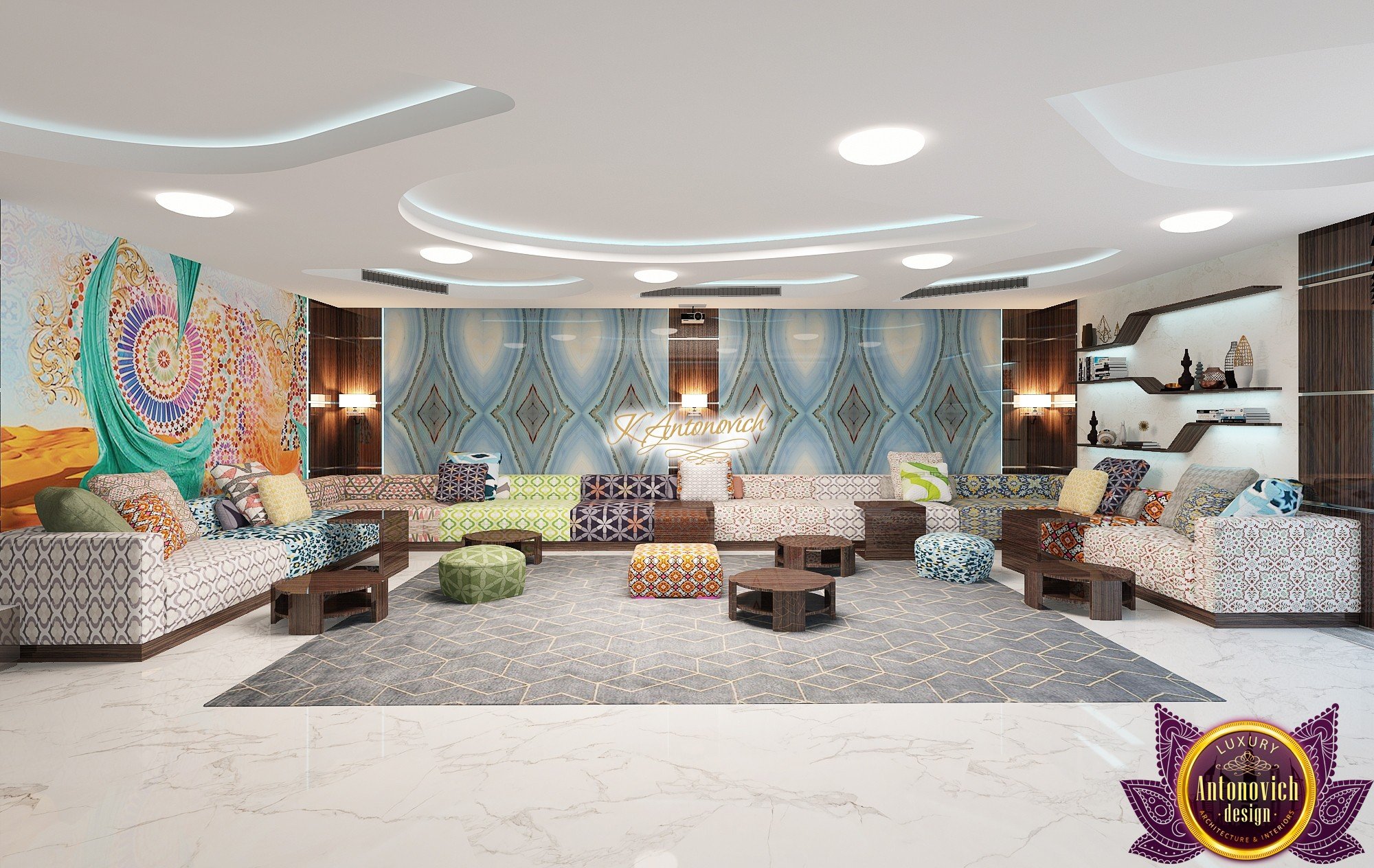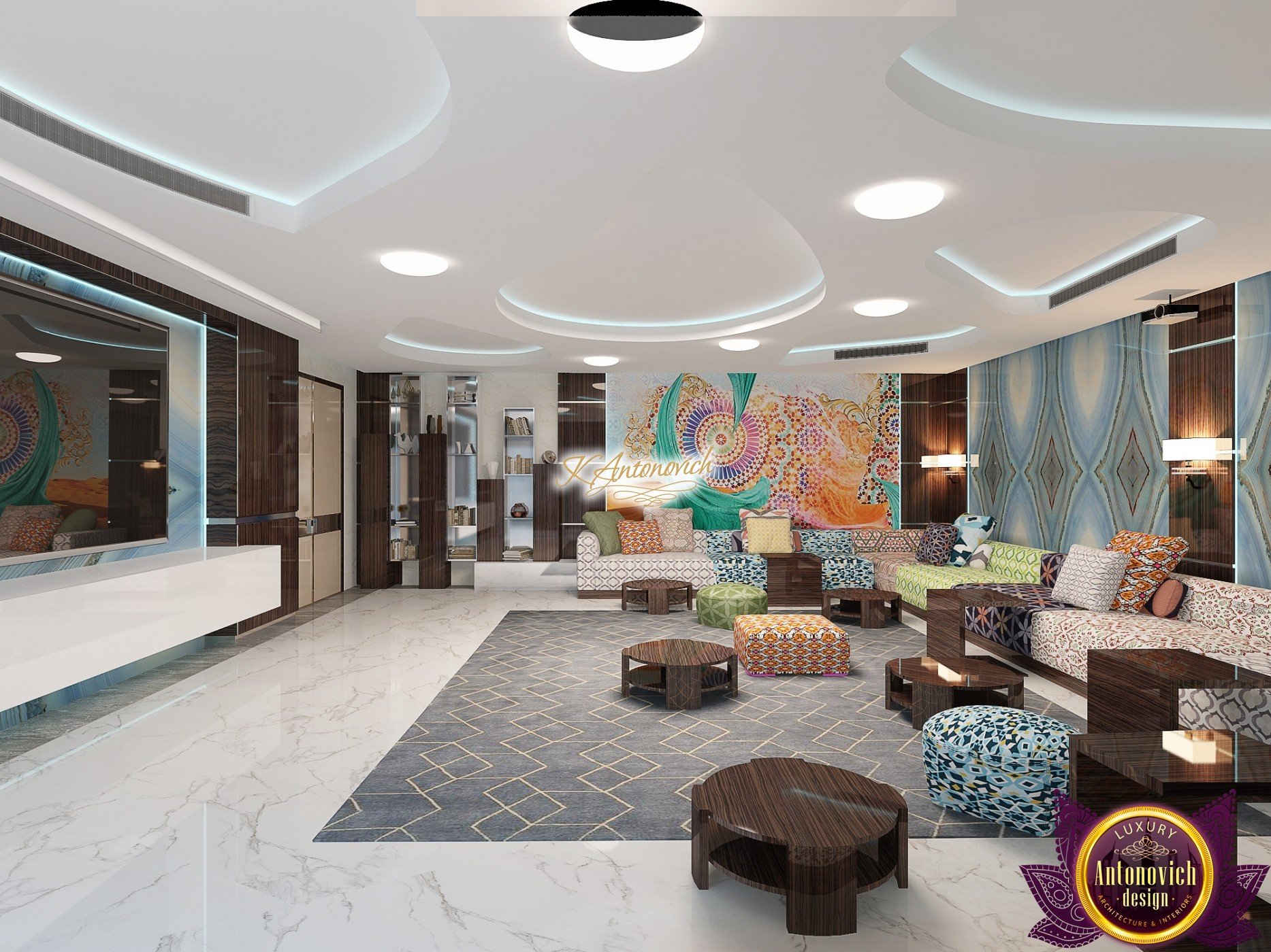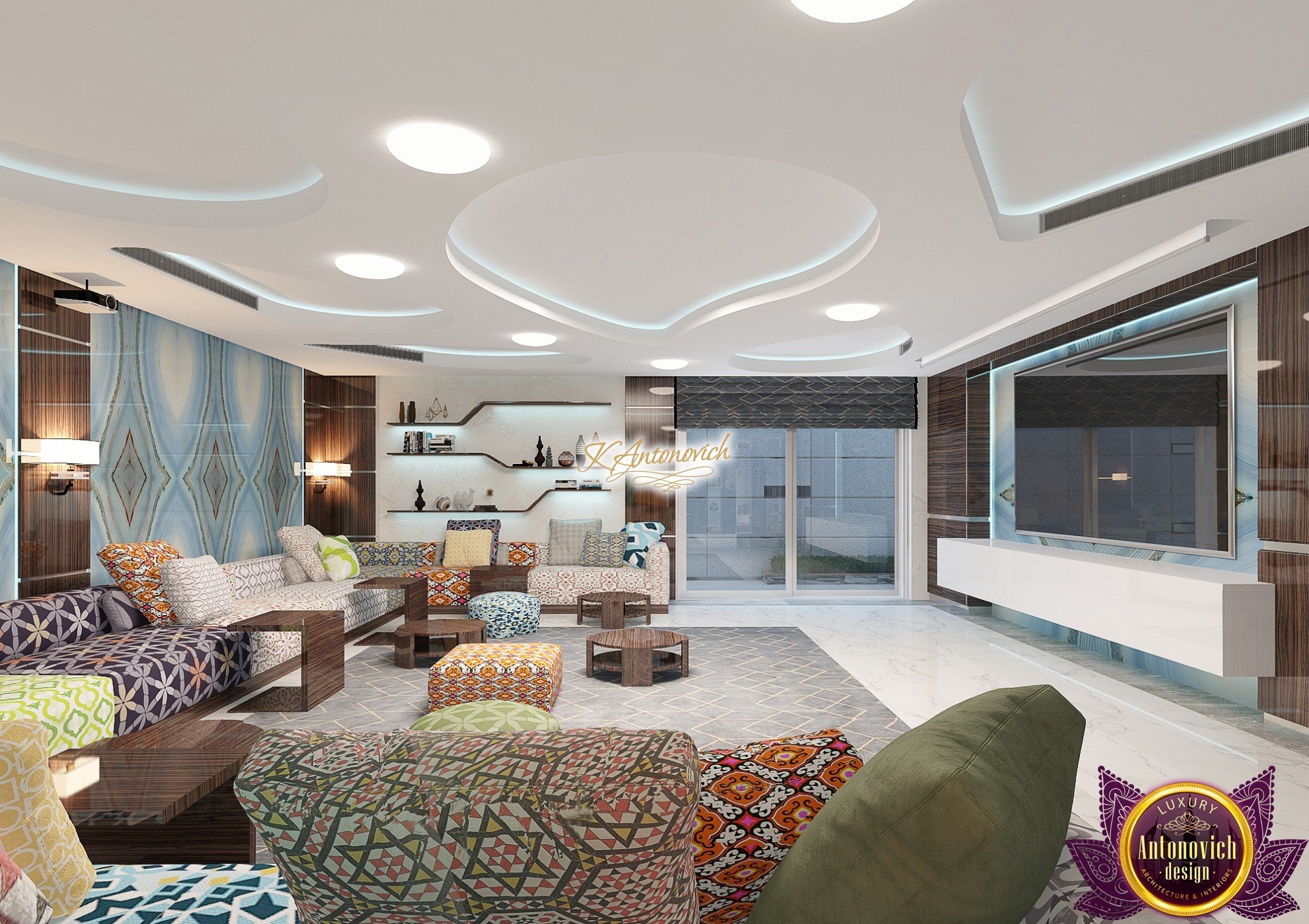 We invite you to plunge into the world of absolute harmony. Interior Designers of studio Luxury Antonovich Design created the interior, which literally froze on the thin line between the modern style and minimalist style. This new direction in the creation of elite projects sitting room ideas. Despite the outward simplicity and restraint, the interior paint ideas of the living room looks incredibly respectable. So what gives to the interior so noble and elite look. First simple sitting room design, to all of this contributes the luxury wall decor. Luxury motives, natural ornaments, natural materials warmth of nature brought to the interior.Decor panel made of natural agate perfectly combined with the decor of solid wood panels, which is covered with varnish. Futuristic and volumetric look have the ceiling.Interior designers have proposed several different-sized niches with streamlined contours.Lines of LED backlighting, modern ceiling lights and beautiful lamps provide excellent interior lighting and the necessary emphasis on those or other decor items. The most striking and enchanting moment in the interior of the living room was the furniture. Almost the entire perimeter of the walls are placed sofas upholstered of noble textiles with bright geometric patterns. Large plasma panel quite harmoniously fits into the modern interior. The basis of the floor decor is light marble.And to compensate for the coolness of stone in the interior design for sitting room provided a great natural carpet with geometric pattern. For books and souvenirs, designers offered open showcases with glass shelves latest sitting room design.