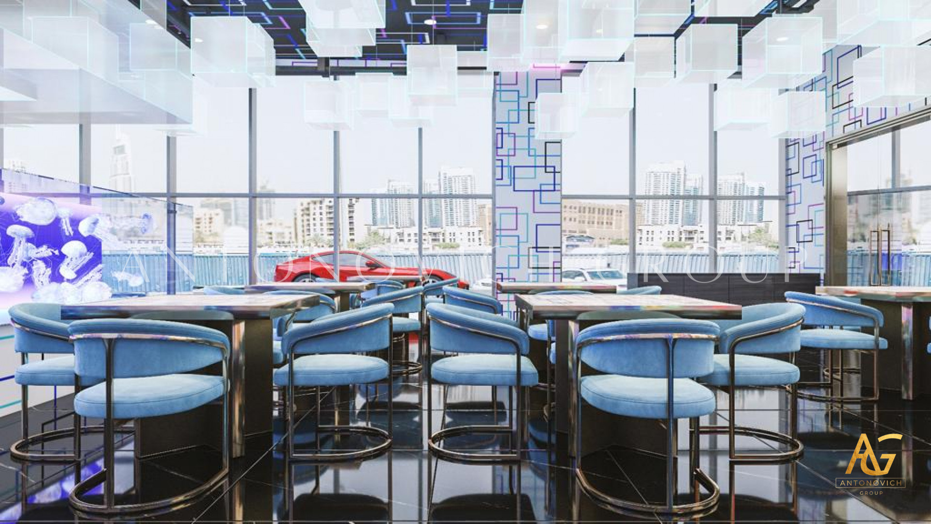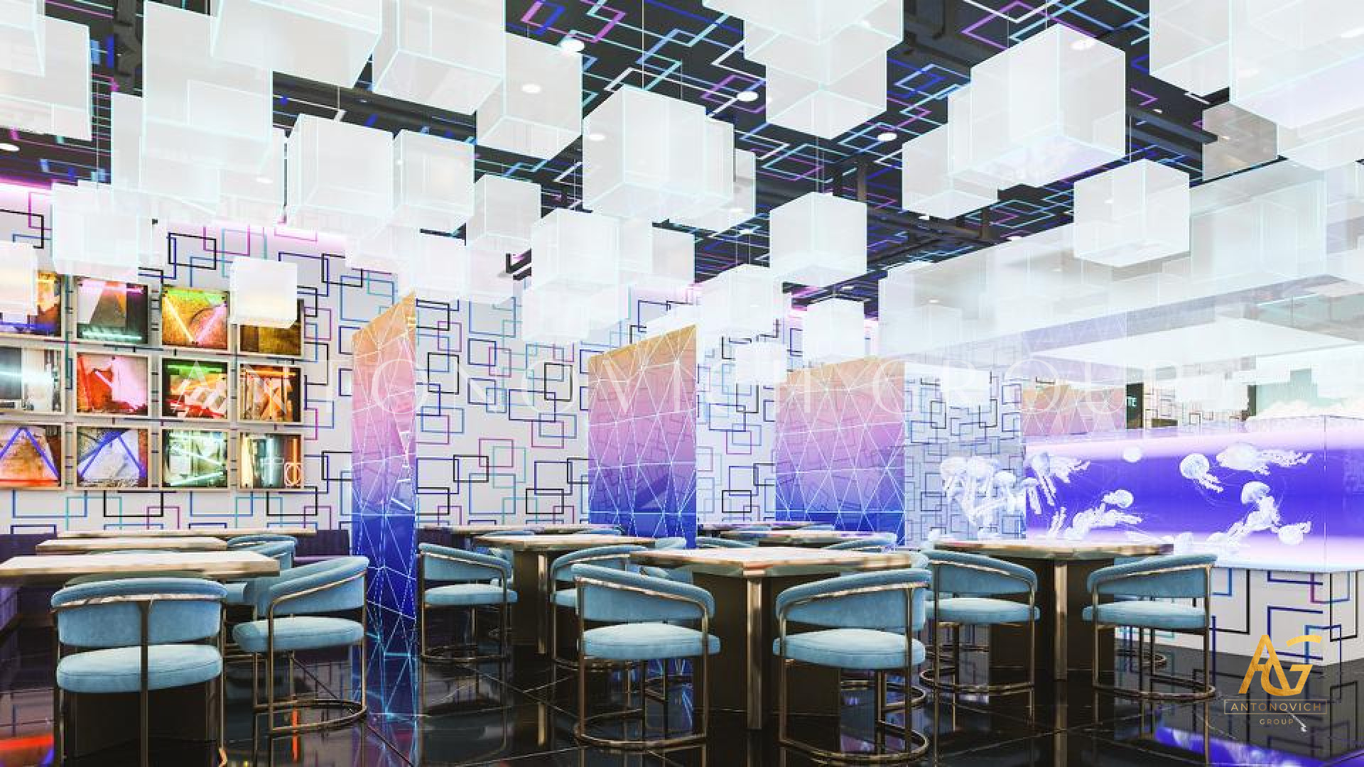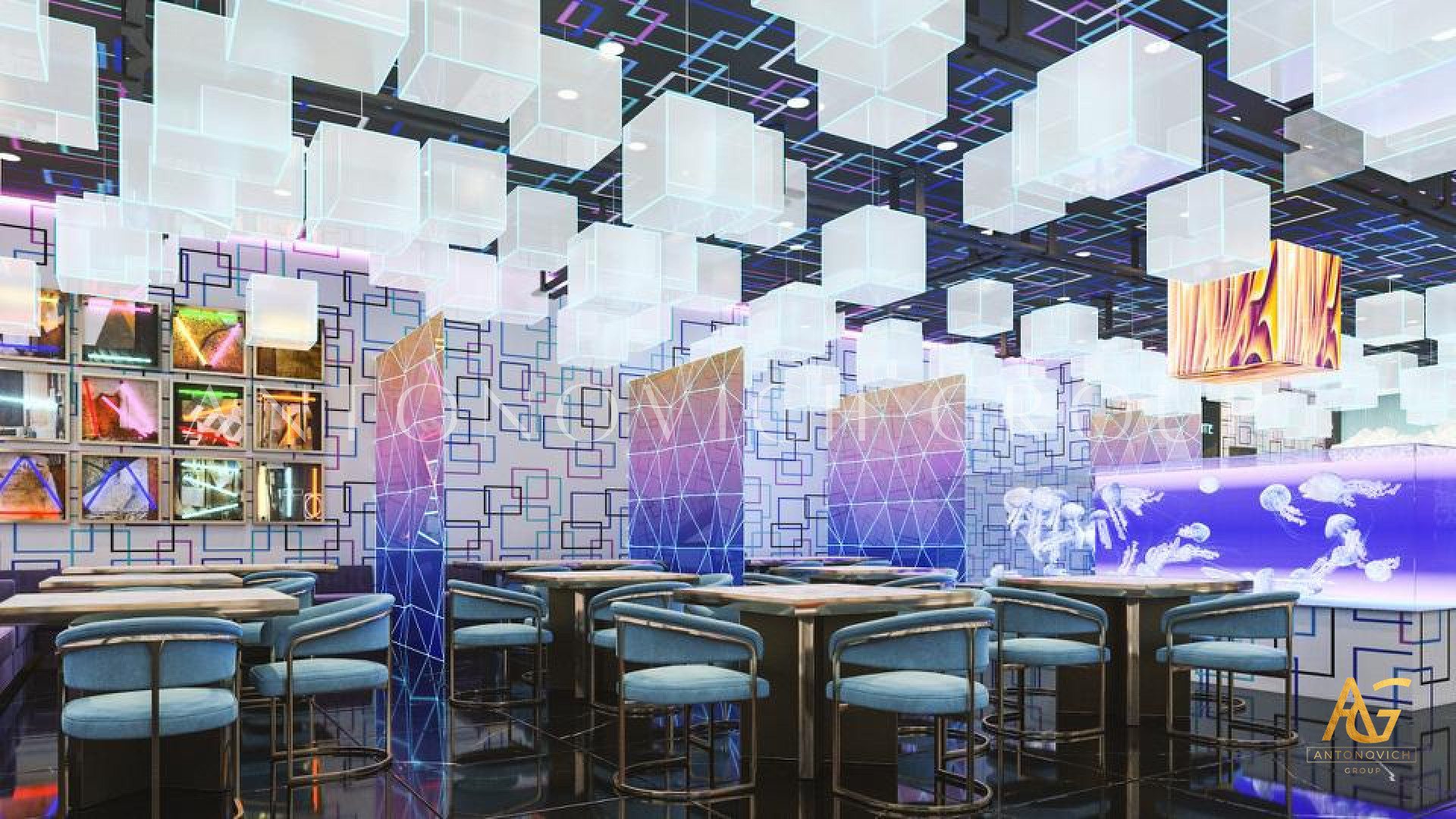 The colors in the Contemporary Restaurant Interior Design Dubai are just stunning. The furniture is excellent, and every detail has been thoughtfully designed to create a premium environment in the luxury interior design. The furniture that Luxury Antonovich Design has put together is beautiful, with its excellent color combination and structural design. The flooring is another feature of the luxurious interior design. Each and every detail is a work of art in its own right. Luxury Antonovich Design, the Top Restaurant Design firm in Dubai, created this high-end interior design with the purpose of realizing the clients comfort.