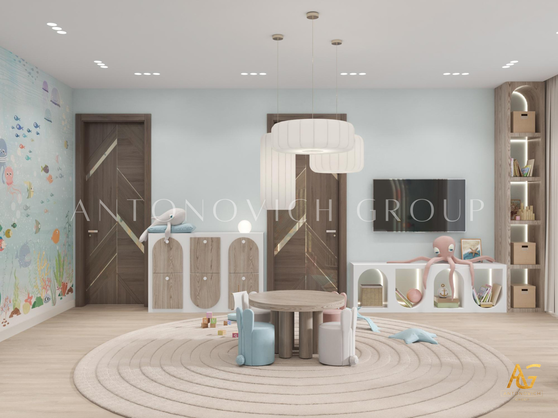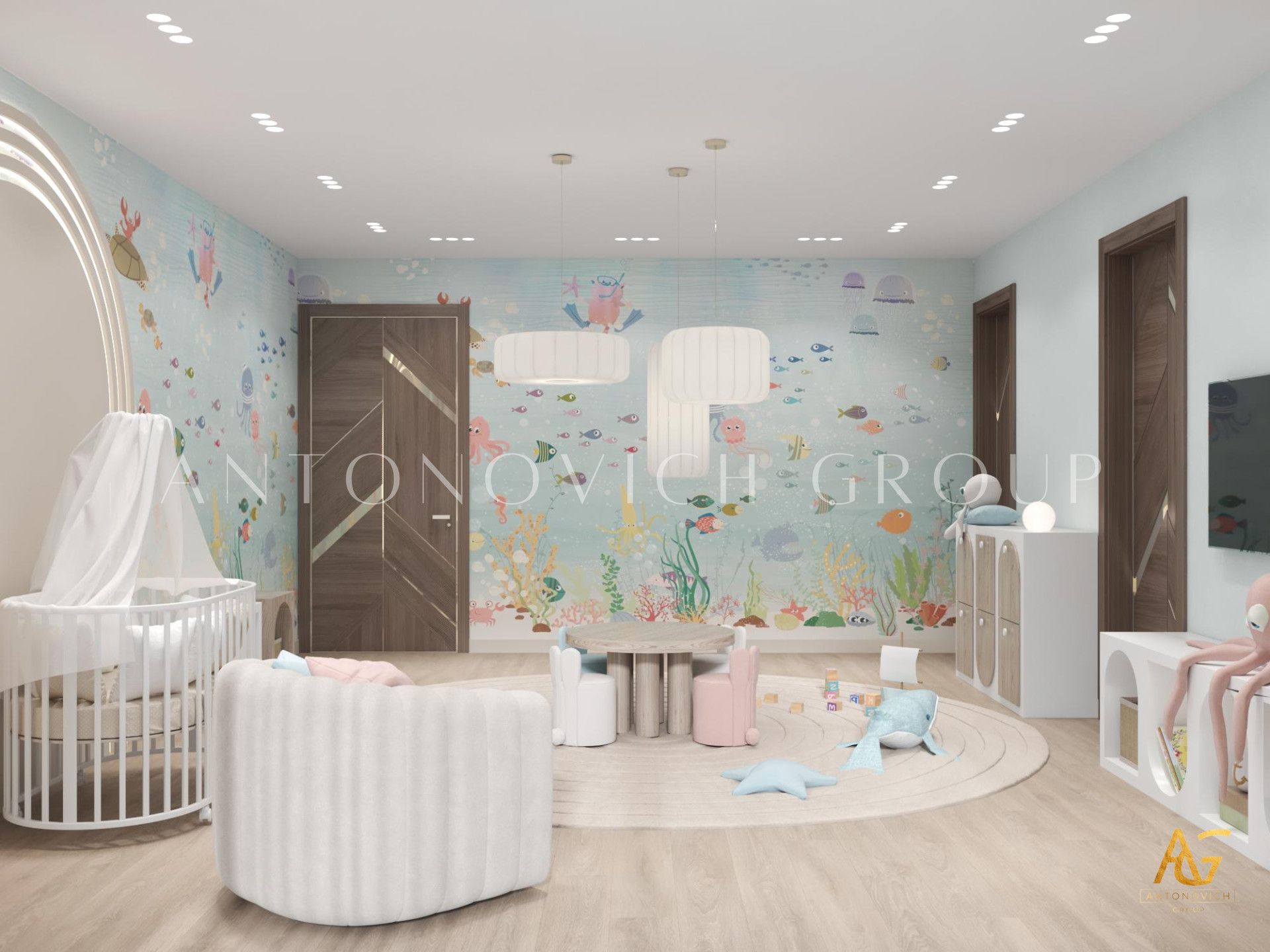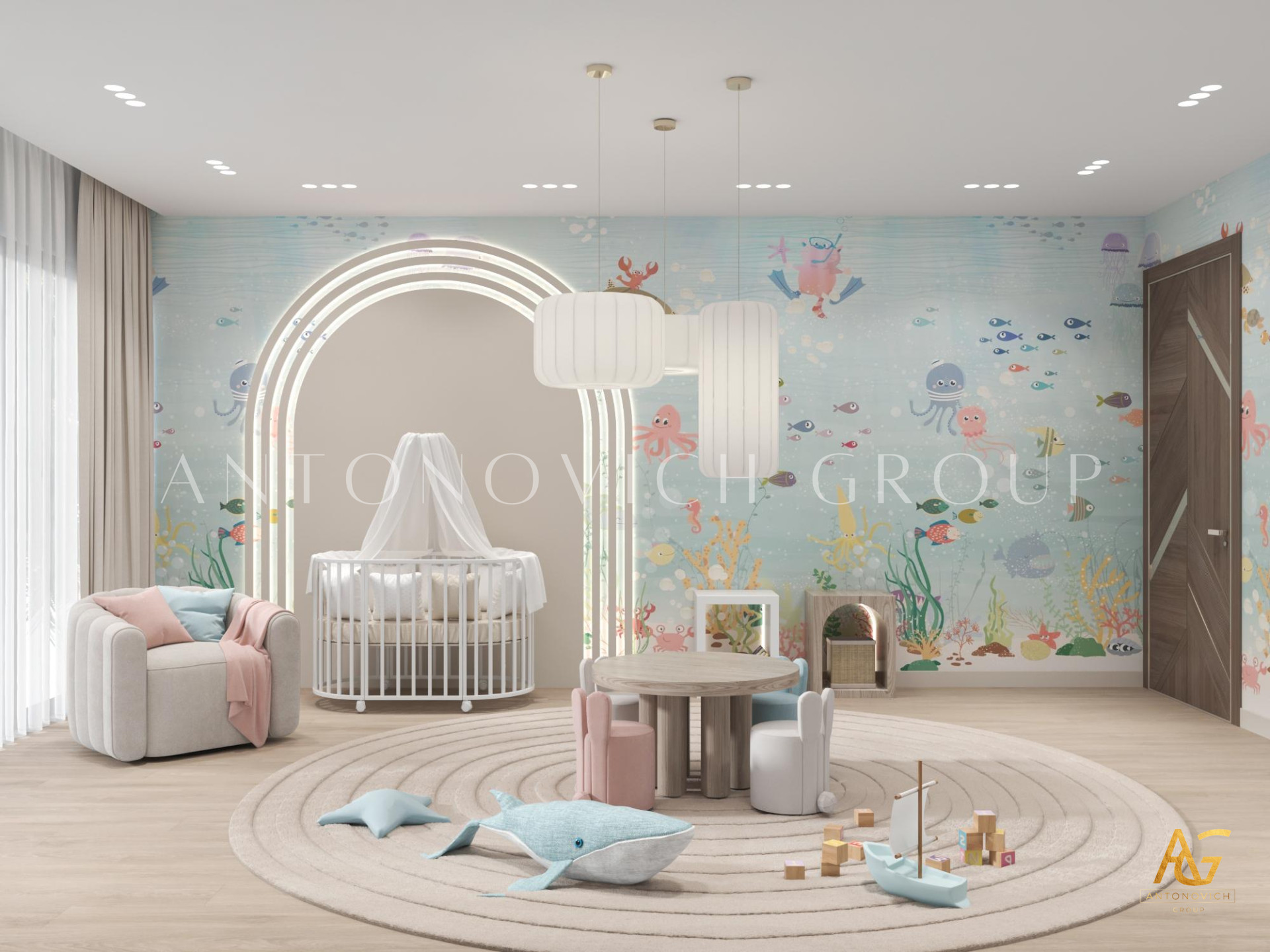 The luxury childrens bedroom interior design also has superb lighting on top of it. The unique and expensive chandelier is brought with so much class and elegance in Dubai. The headboard is also one of a kind with its flowy patterns.
