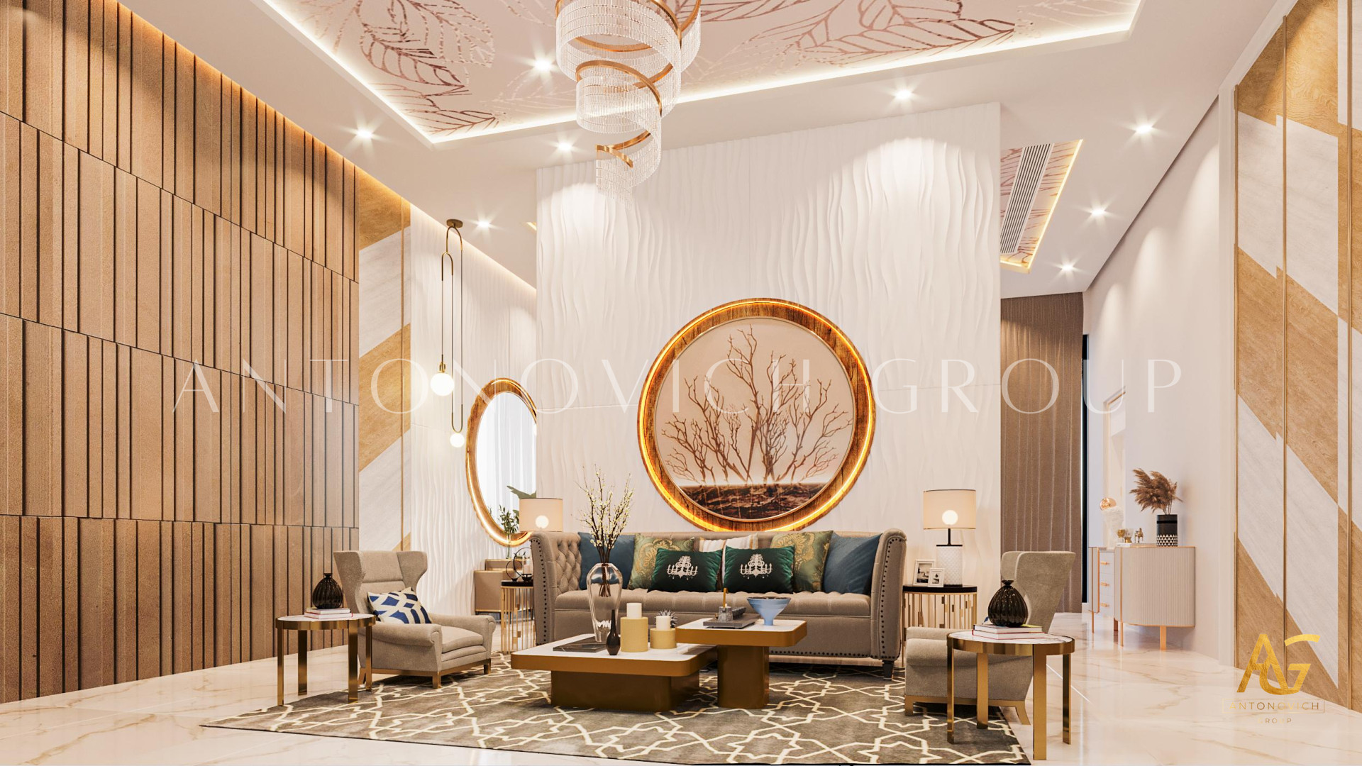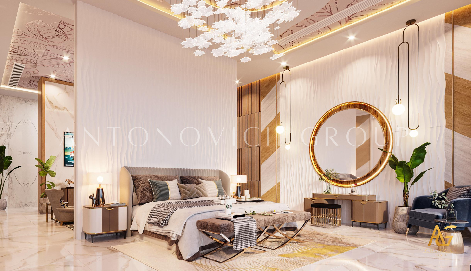 A cozy bedroom is what this new creation of Luxury Antonovich is all about. The beautiful rose gold color paired with stunning cream primary hue creates a contemporary and relaxing feel to the luxury bedroom interior design. The room is equipped with luxury details that are designed to create an ambiance of relaxation.