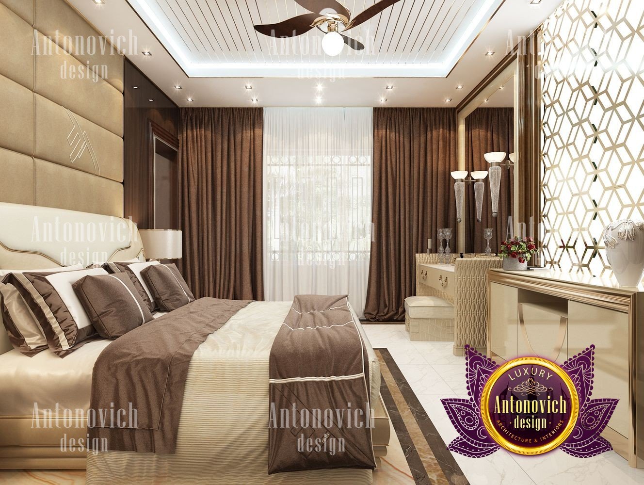 With this stunning luxury bedroom interior design, youll be transported to a world of luxury. Gold and brown are the main colors of this super luxurious bedroom made by Luxury Antonovich Design. The major aspect of this lovely bedroom is its furniture design. The bedrooms beautiful seats and tables are one-of-a-kinds. With its materials, it has a fantastic elegance and workmanship. With their wonderful details that create a contemporary aesthetic, the lovely bedroom is extremely well-designed. The shades of brown are very evident in the walls and in the decor. The beautiful designs add to the rooms opulence.