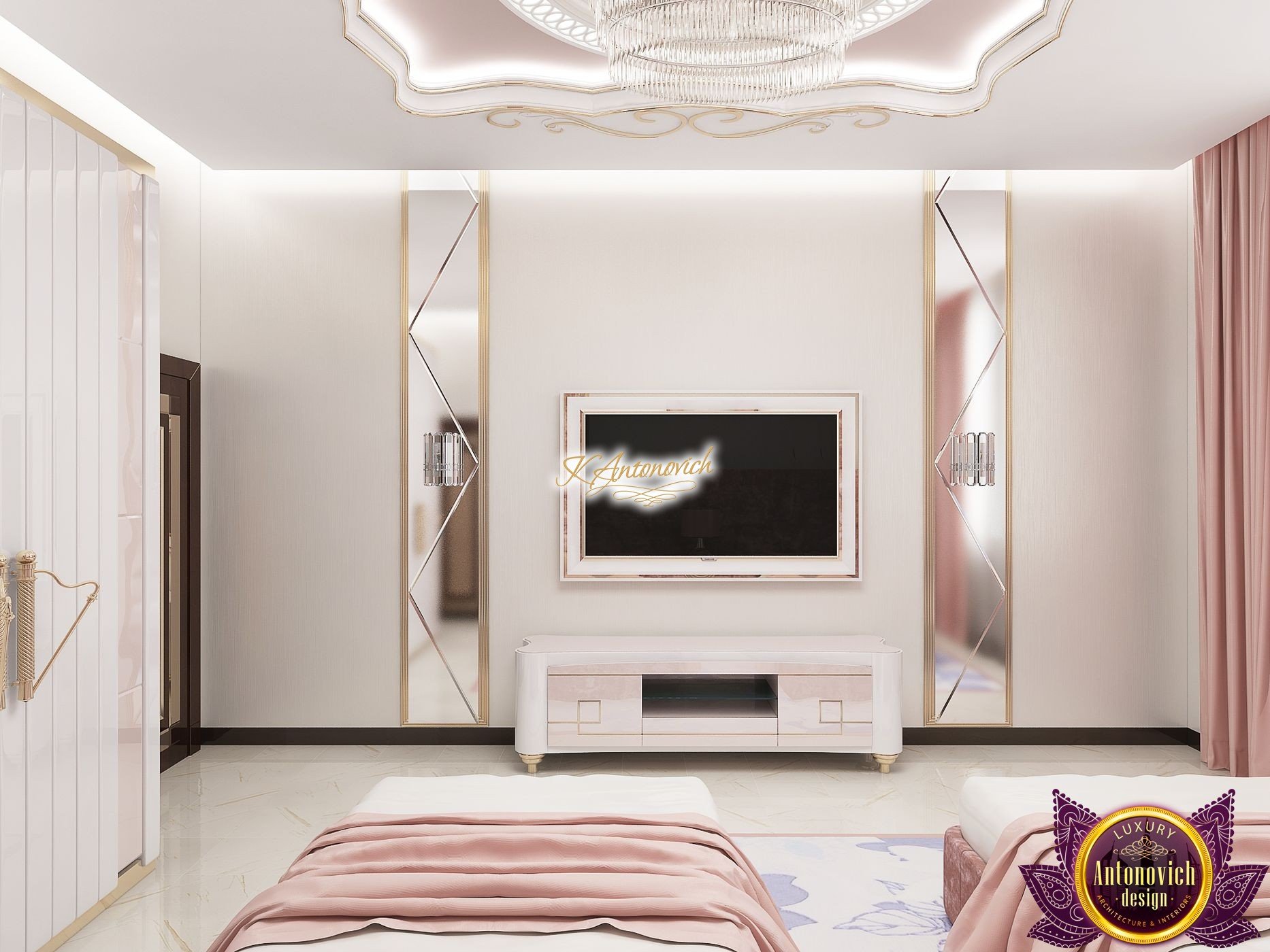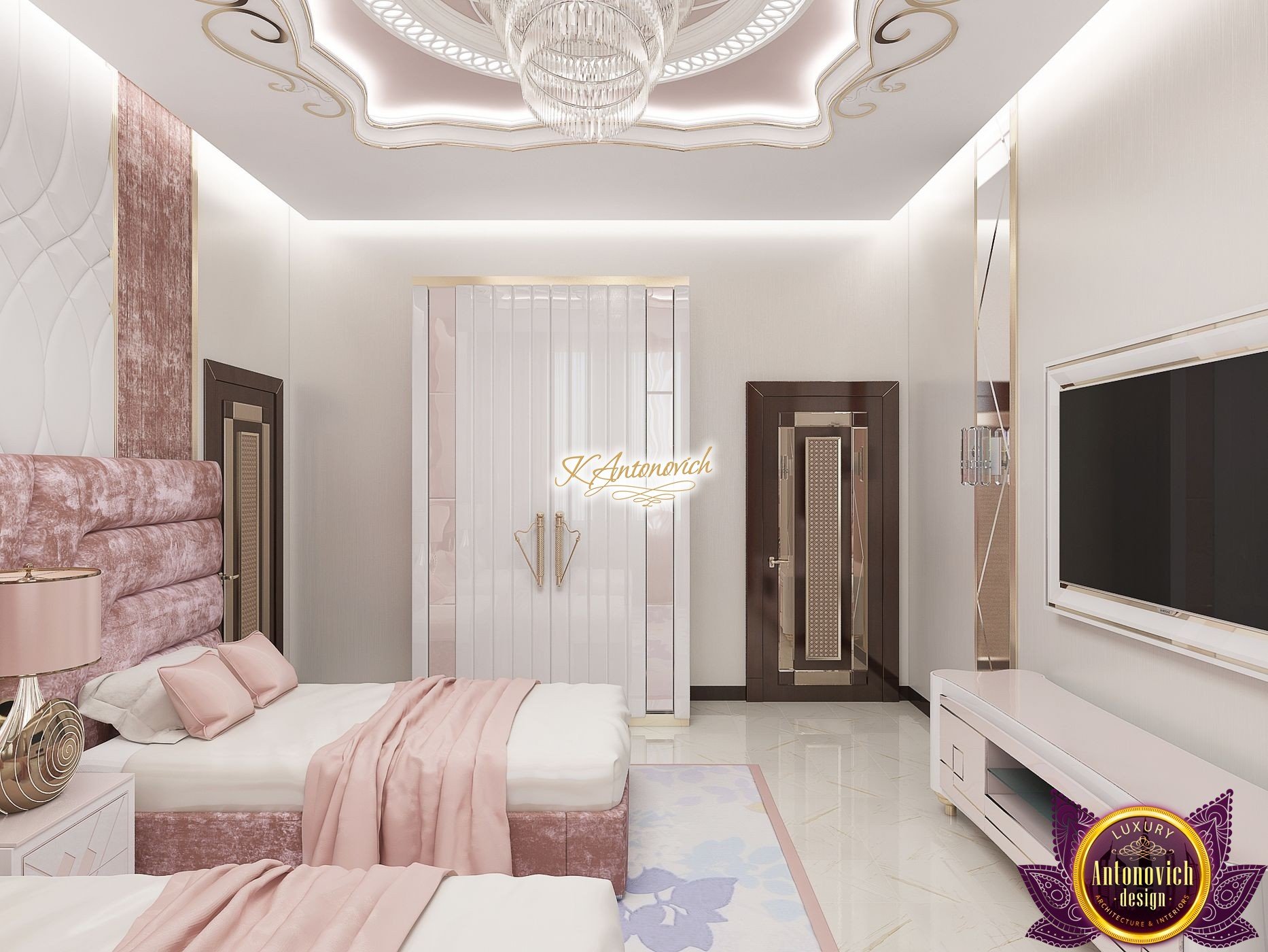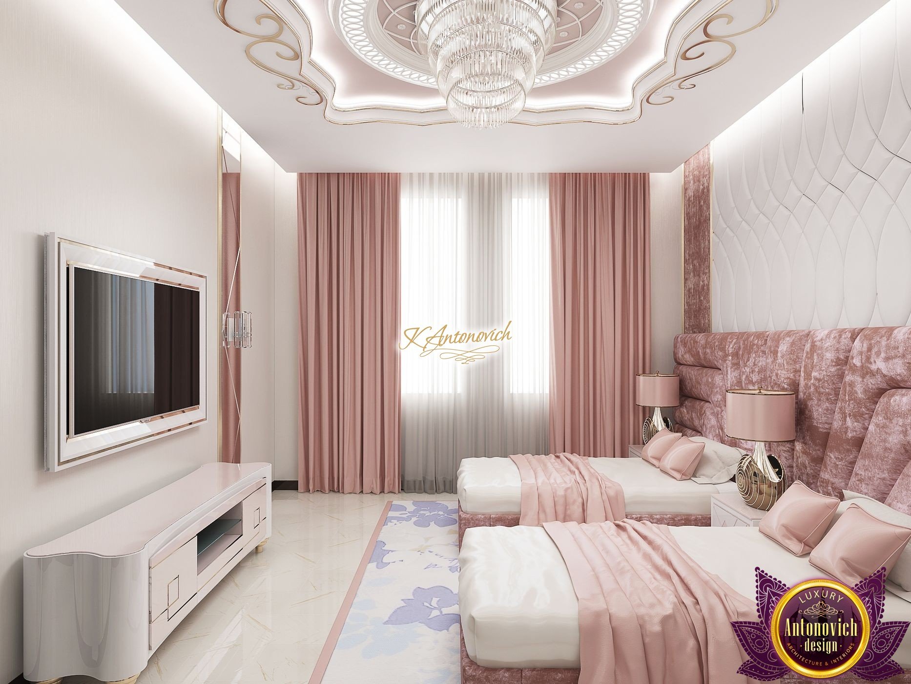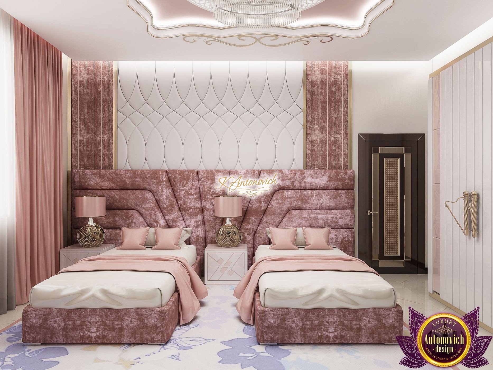 According to the project of an elite villa, several children's rooms were provided. The owners of the house decided to divide the area for games, training area, and the zone for sleep. This bedroom interior for two sisters is designed exclusively for comfort rest.In this design project of interior children's bedroom, we have demonstrated how charmingly, nice, and cozy can be interior in a contemporary style. The Velvet of salmon hue became the main color in the palette of the interior.A big soft headboard, which is the same for the two beds made of it.Profound fabric with geometric patterns perfectly harmonizes interior space child's bedroom in a contemporary style.Luxuriously and presentable looks great a decor panel behind the headboard. Its basis is milky leather with a beautiful ornament.The panel is framed by inserts of velvet and thin strips of polished brass.The decoration of beds perfectly blends with the window decoration.Silk cushions and bedspreads of pink hue resonate with silk curtains in a modern style.The elegance and grace underlined by many moments in the interior decor. Thus, the ceiling is decorated with a deep niche with beautiful contours and lines of gilded ornamental stucco decoration. The main part of the walls is decorated with monochrome ornamental plastering, against of which looks bright and juicy the other interior details. The interior design of the children's bedroom adjusts on relaxation and a wonderful feeling of warmth of home comfort.