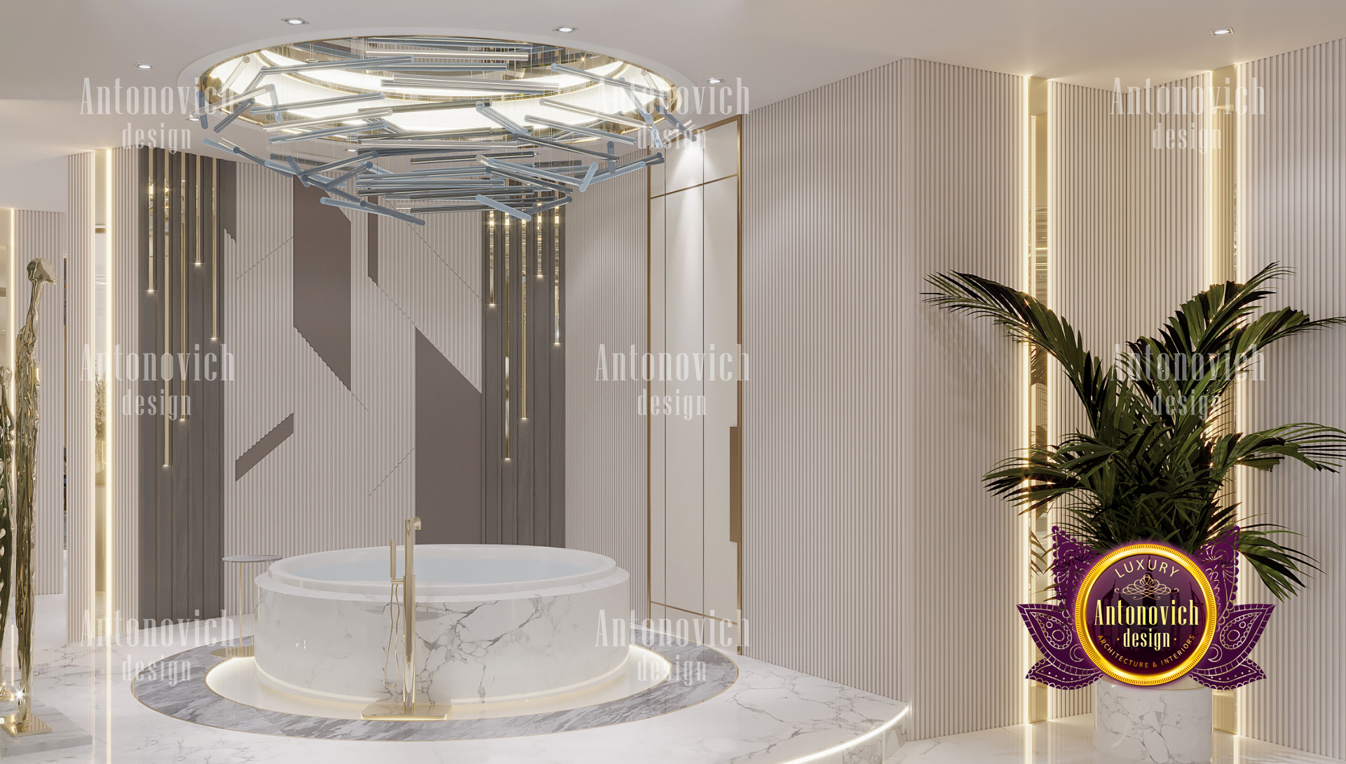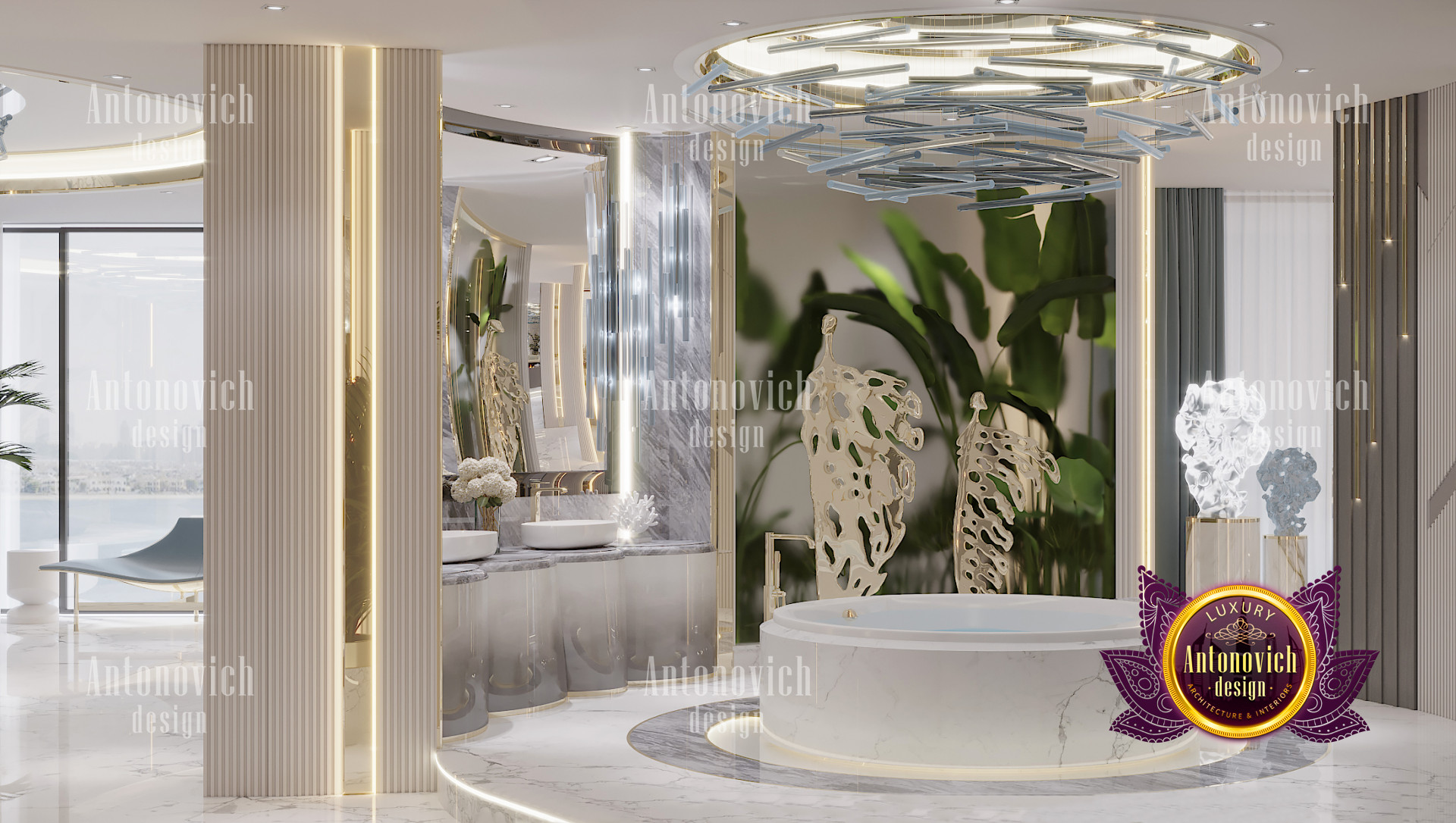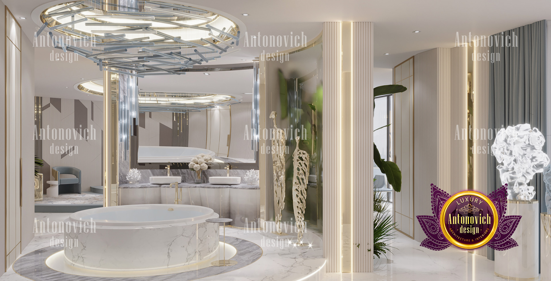 The luxury bathroom interior design also has good lighting. The wall lights are very unique as well as the chandelier which makes this luxury bathroom interior design a truly remarkable one when it comes to style, layout, and design. Overall, the luxury bathroom interior design is very beautiful with the addition of the plants that the company has added to the luxury bathroom interior design.