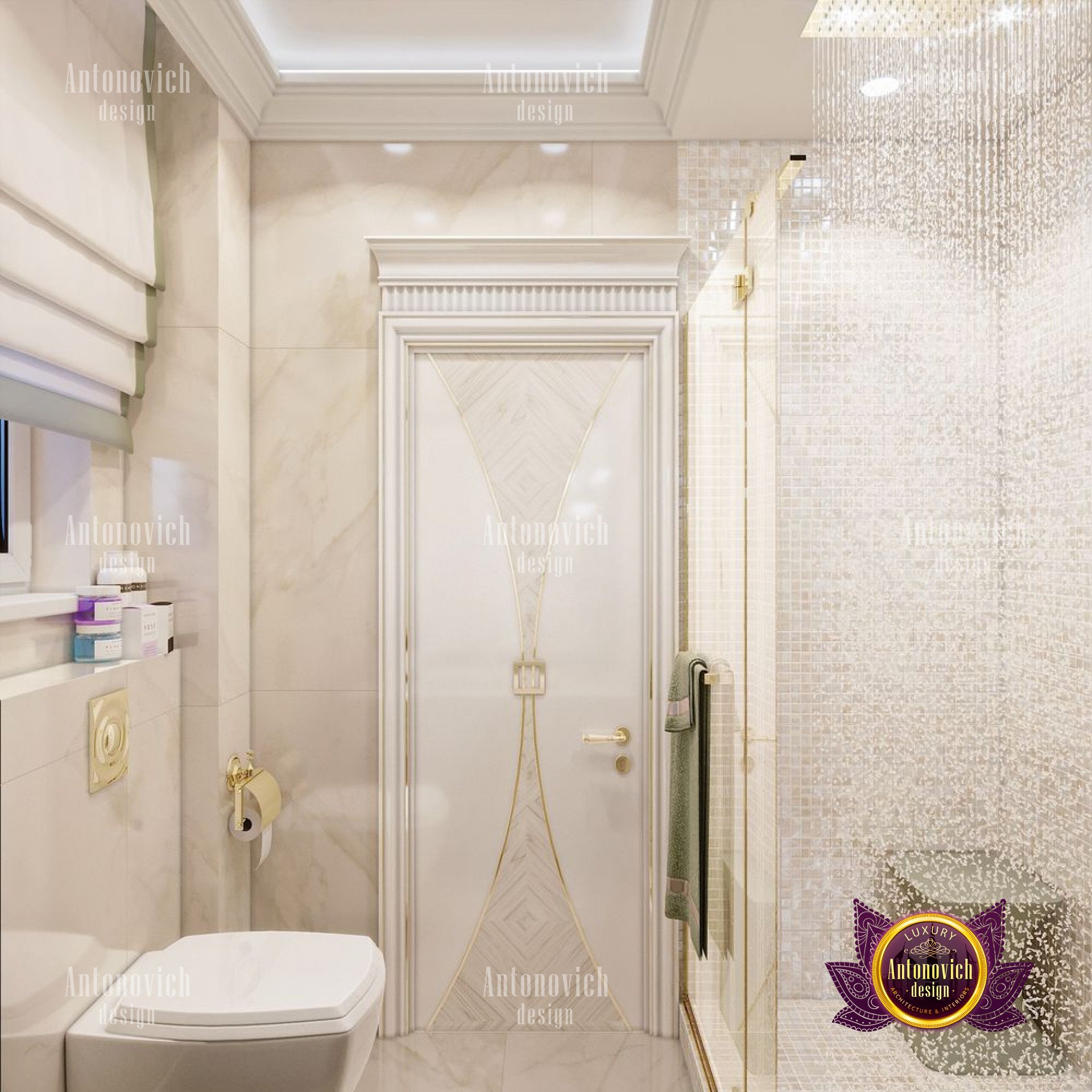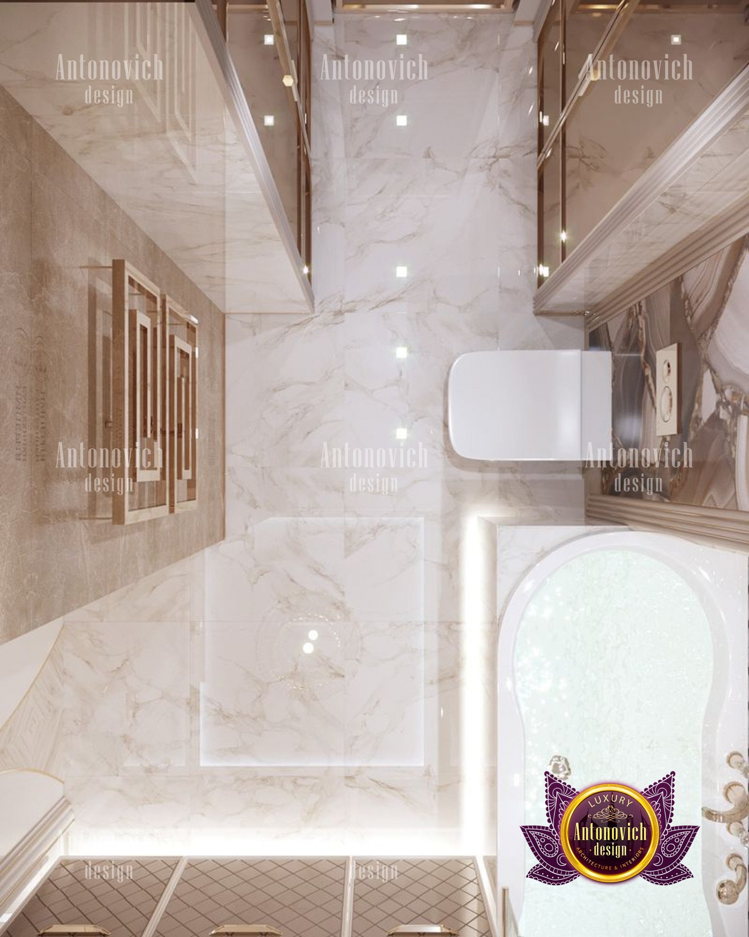 The bathrooms feature a contrasting color scheme, represented by mosaics and graceful decor of the wall surface and sanitary equipment, as well as a rich and colorful floor surface, which is lined with chocolate-colored marble tiles with a glossy finish.