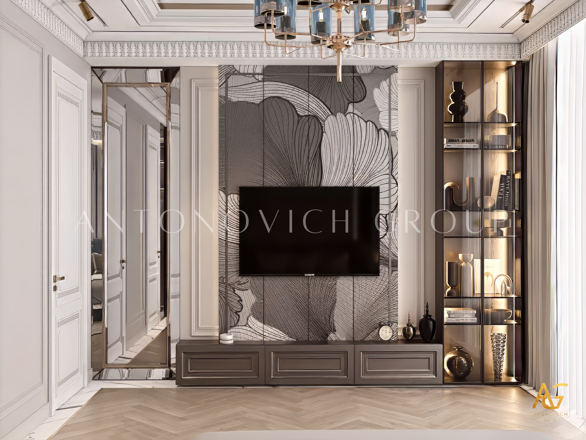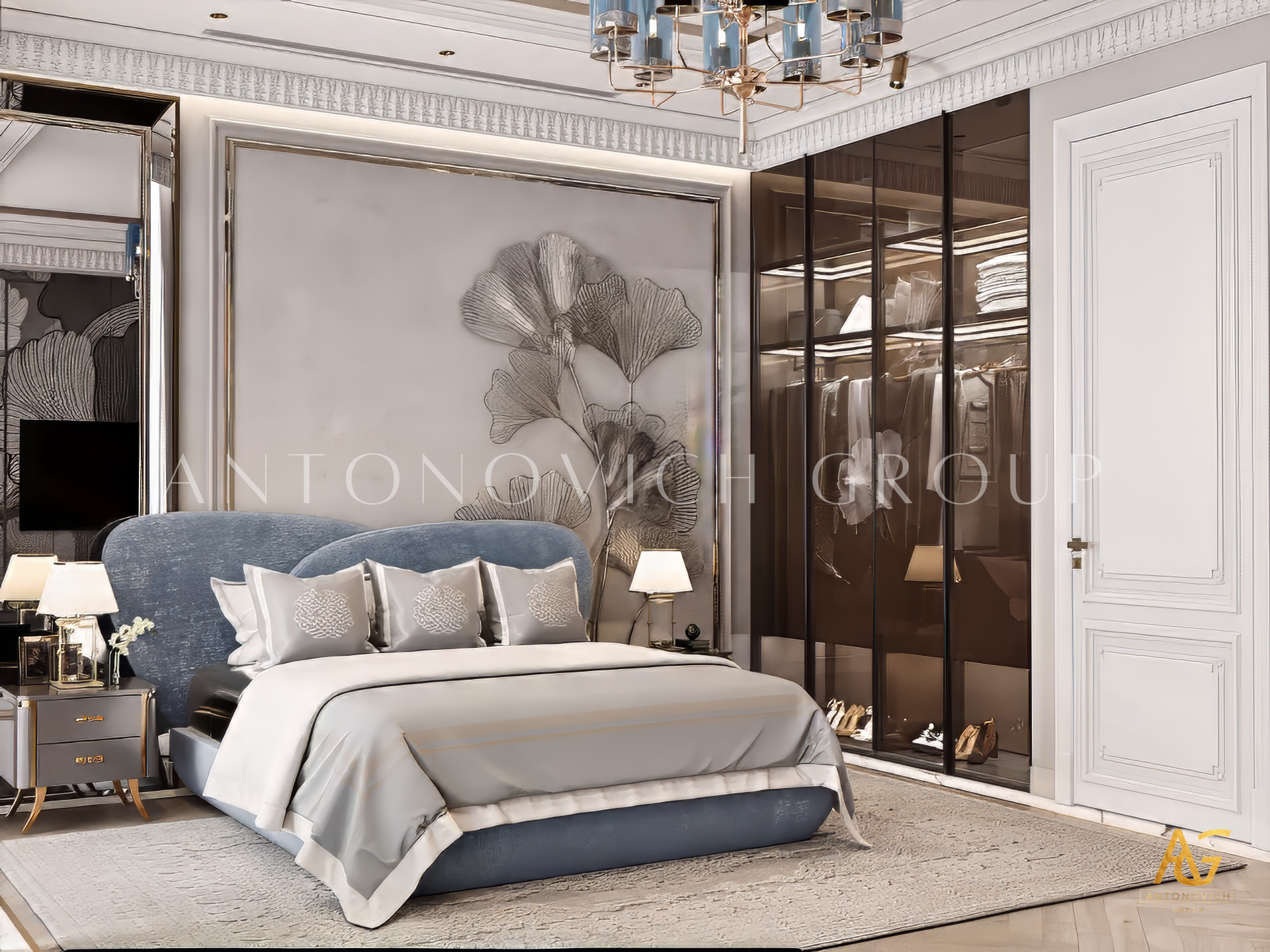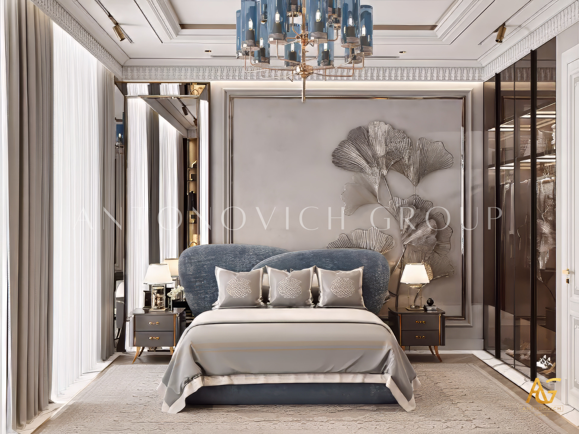 The design of a bedroom in a modern style is chosen by those who like non-ordinary solutions and are not afraid to experiment boldly. This luxurious bedroom became a worthy highlight of luxury apartments. The bedroom design in the modern classic in this project combines several stylistic accents.However, a vivid modern style prevails. This is a bedroom design for young and stylish.Our customers are a young family who likes to travel, and also works a lot.Therefore, it was so important to create in the bedroom interior a harmonious space for a perfect rest. Ideas for the design of the bedroom authors of the project got, communicating with customers. The room is an open space with large panoramic windows.The bedroom and the bathroom are separated by a wall of transparent glass with a light ornament.High panoramic windows were decorated with luxurious curtains in a modern style made of natural silk of silvery hue. The bedroom design options in the modern style are always bright and unusual solutions in the decor. So, the ceiling was decorated with multi-level structures with glass and steel decor, which are additionally illuminated. This creates a sense of versatility and infinity of luxurious space. The elegant design of the bedroom is also based on such elements of wall decoration as natural marble and original gray panels with the texture of natural stone.The design of the modern bedroom also implies the use of bright decorative accents as furniture and art objects.Interior designers of Antonovich Design studio have created an ideal space for a relaxing holiday.