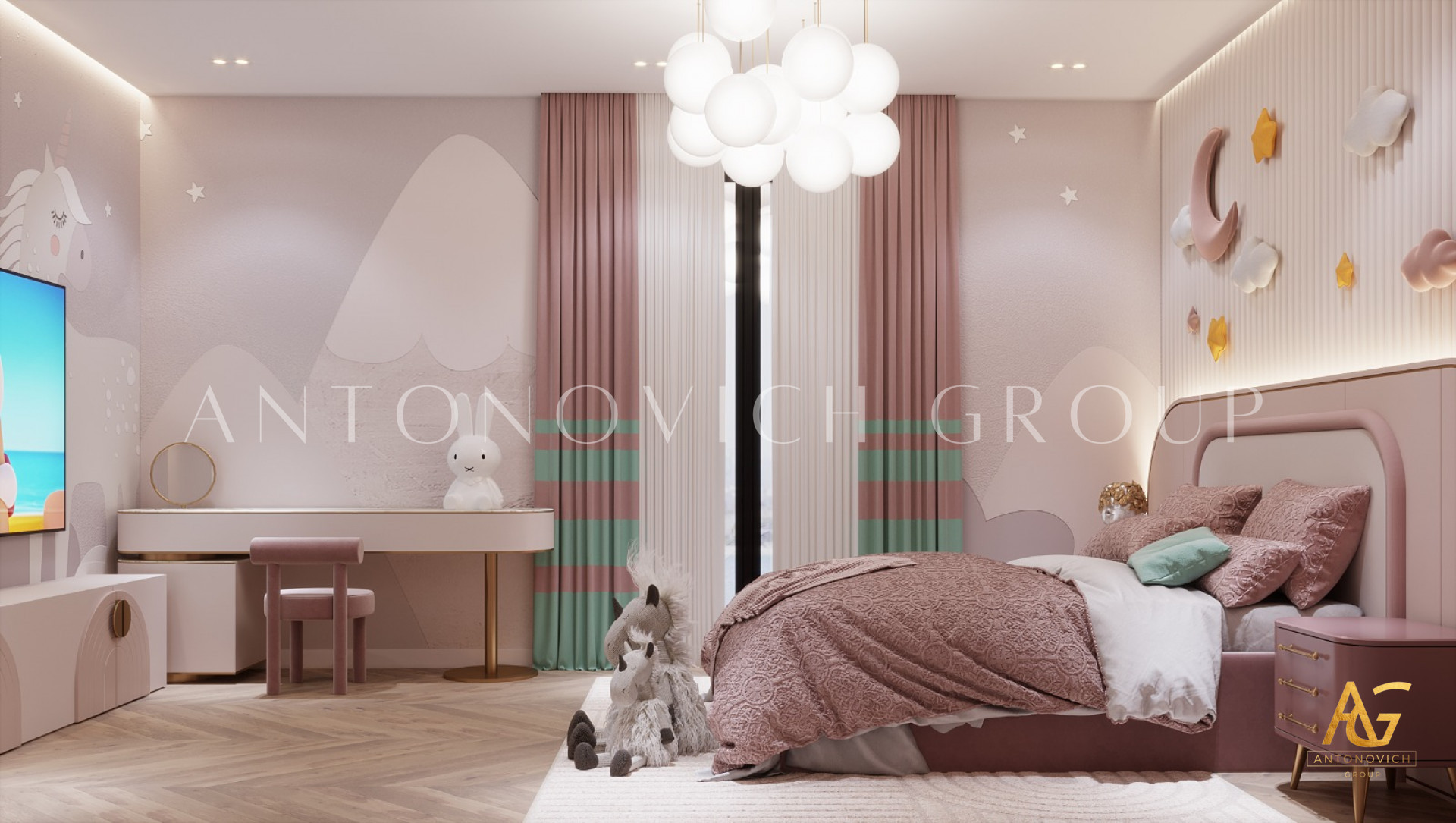The centerpiece of any bedroom is its furniture, and Antonovich Group has spared no effort in creating bespoke pieces fit for a little princess. Elegant pink-toned furniture, including a charming bed with intricate detailing and a study desk with ample storage, adds a touch of regality to the space.
