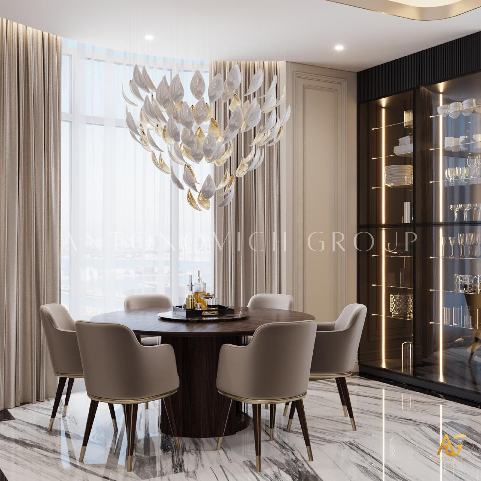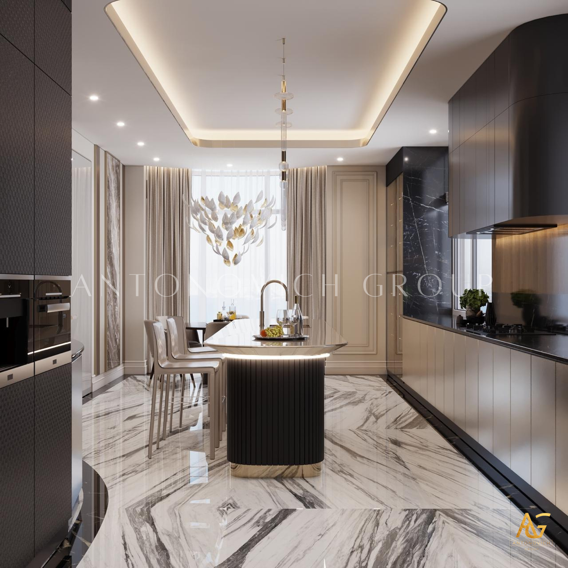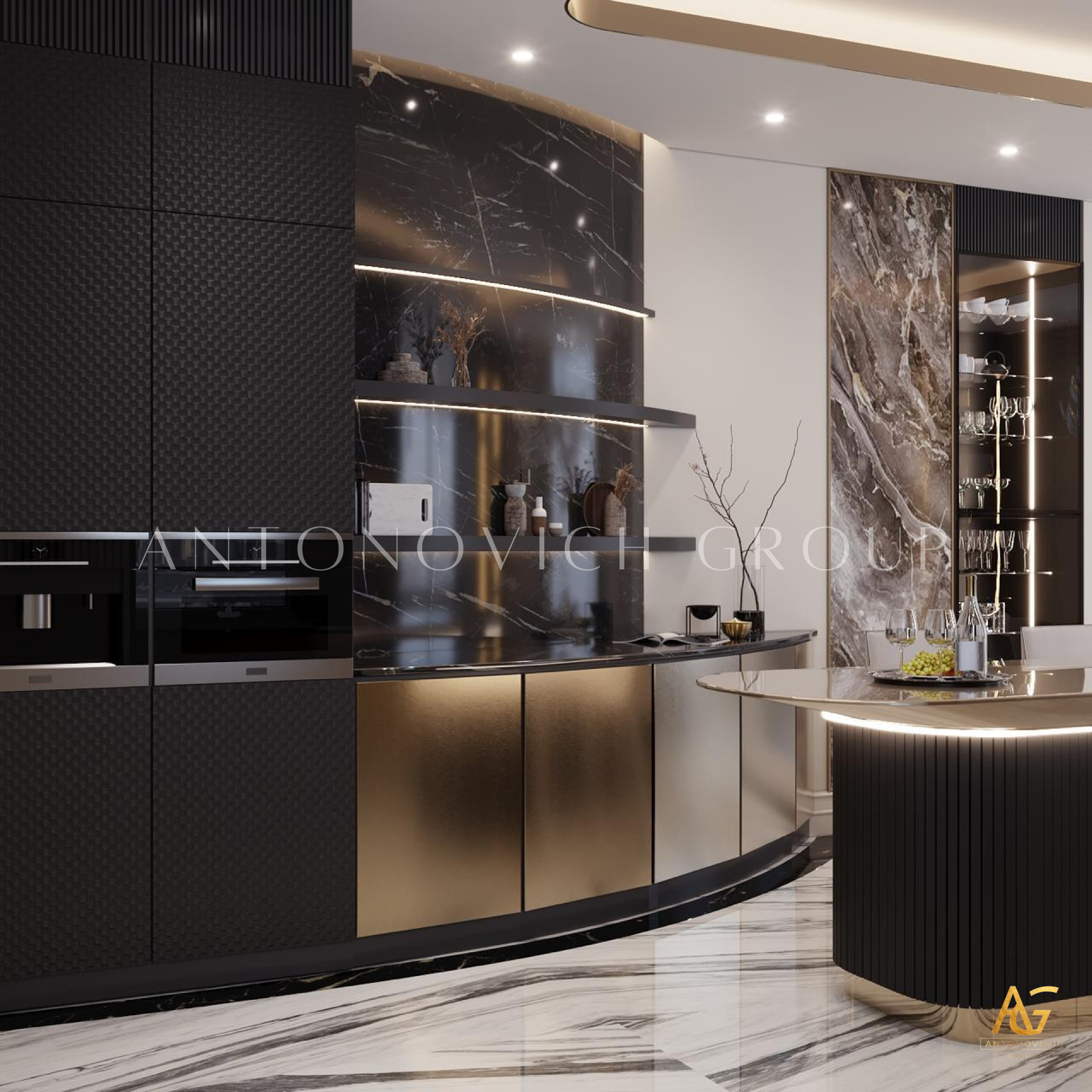 Beautiful design of the kitchen from the studio Luxury Antonovich Design is first of all aesthetically perfect and the most comfortable space.Modern style in this design project, it is a harmonious intertwining of minimalism and hi-tech. The interior looks very cozy and warm, thanks to the maximum use of wood in the decoration of the space.In a relatively small kitchen, the furniture items are perfectly arranged in order to stay in the kitchen is comfortable. The design of kitchen on pictures in modern realities practically does not differ from real photos of implemented interiors.A new kitchen design can be a completely new look at the design of such rooms.According to the architectural design of the villa, the kitchen is a separate room without windows that overlook the street.To make the interior of the kitchen cozier, one of the walls is decorated with two small windows overlooking the beautiful living room. The design project of the kitchen interior from Antonovich Design has turned out very elegant and exquisite.Kitchen facades made of natural wood contrast perfectly with light-colored work surfaces. To visually expand the space, the authors of the project actively use lighting. This is a large crystal chandelier, a line of backlighting throughout the perimeter of the ceiling, additional lamps and furniture backlighting.Light-colored marble on the floor and on the working surfaces is a wonderful moment of practicality in the interior of the kitchen. The best design of the kitchen always implies the correct calculation of the height of furniture, the distance between the cabinets.Every nuance is extremely important in order to that when you are in the kitchen you get only positive emotions.