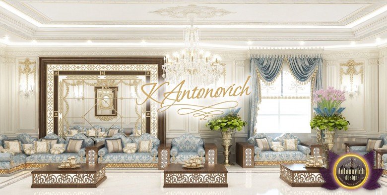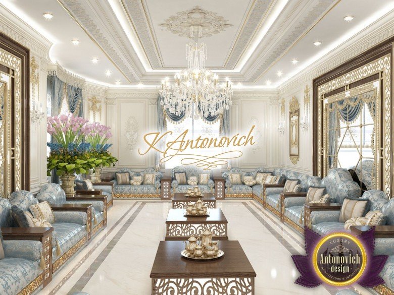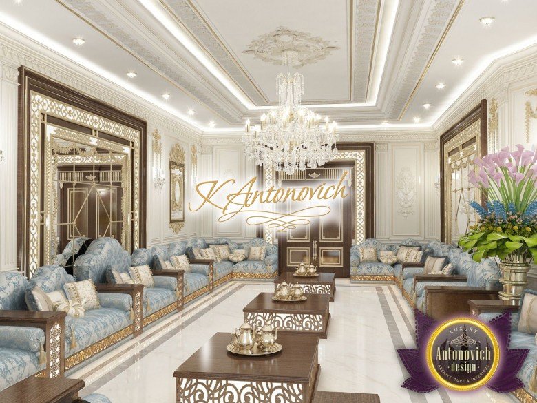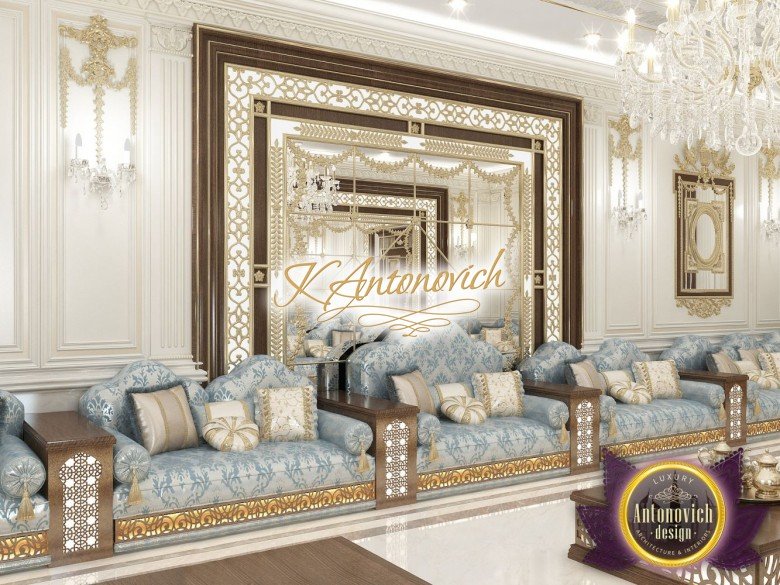 Holiday joy, happiness, and hospitality reflect this magnificent Majlis design in Abu Dhabi. Presentable and noble classical style, interior designers Abu Dhabi have complemented with the oriental notes. Bright and unique image based on unique solutions designers in the decoration. Ceiling decorated in the best traditions of a classic. It decorated in the middle by the elegant crystal chandelier framed stucco medallion. The ceiling is divided into several niches. And each tier is illuminated of a soft line of LED backlight. To enhance the shining mood of the luxury interior, lighting is complemented by the contemporary ceiling lights and sconces in the form of refined candle holders. The main decoration of walls become mirror panels with openwork forged gilded plates. Each panel framed by a frame made of wood valuable species. Motifs of walls decor continue lovely coffee tables of dark wood on the illuminated basis. Majlis design in Abu Dhabi highly emphasizes the respectability of owners. And also the fact that they are glad to offer valued guests the best. For relaxation and comfort, the entire interior perimeter of the Majlis occupies upholstered sofas in fine fabrics with embroidery. Sofas basis is encrusted with carved handwork decoration. The windows are decorated with luxurious classical curtains of magnificent silk, which is complemented by a golden braid. interior designers Abu Dhabi For floor using light marble on which background looks great more vivid and fanciful decorations.