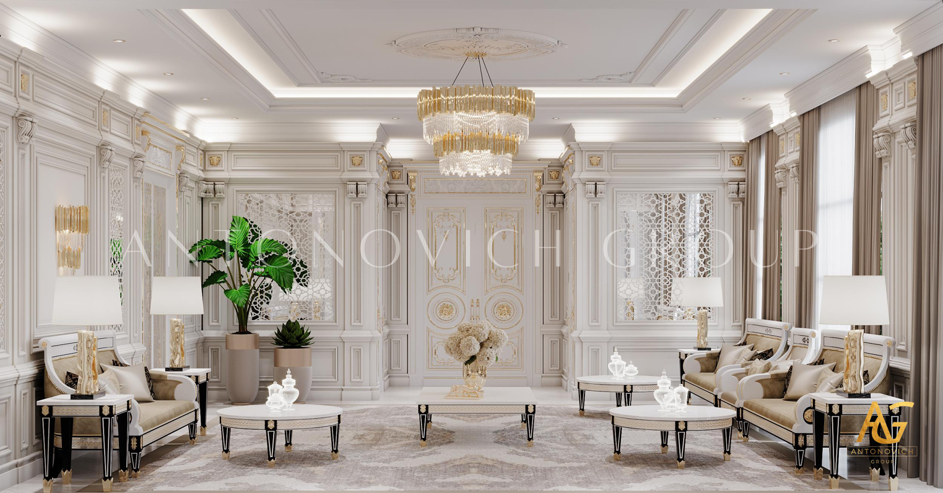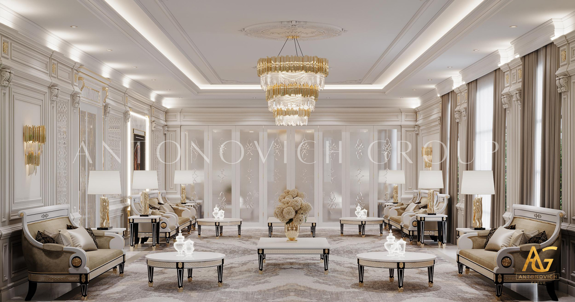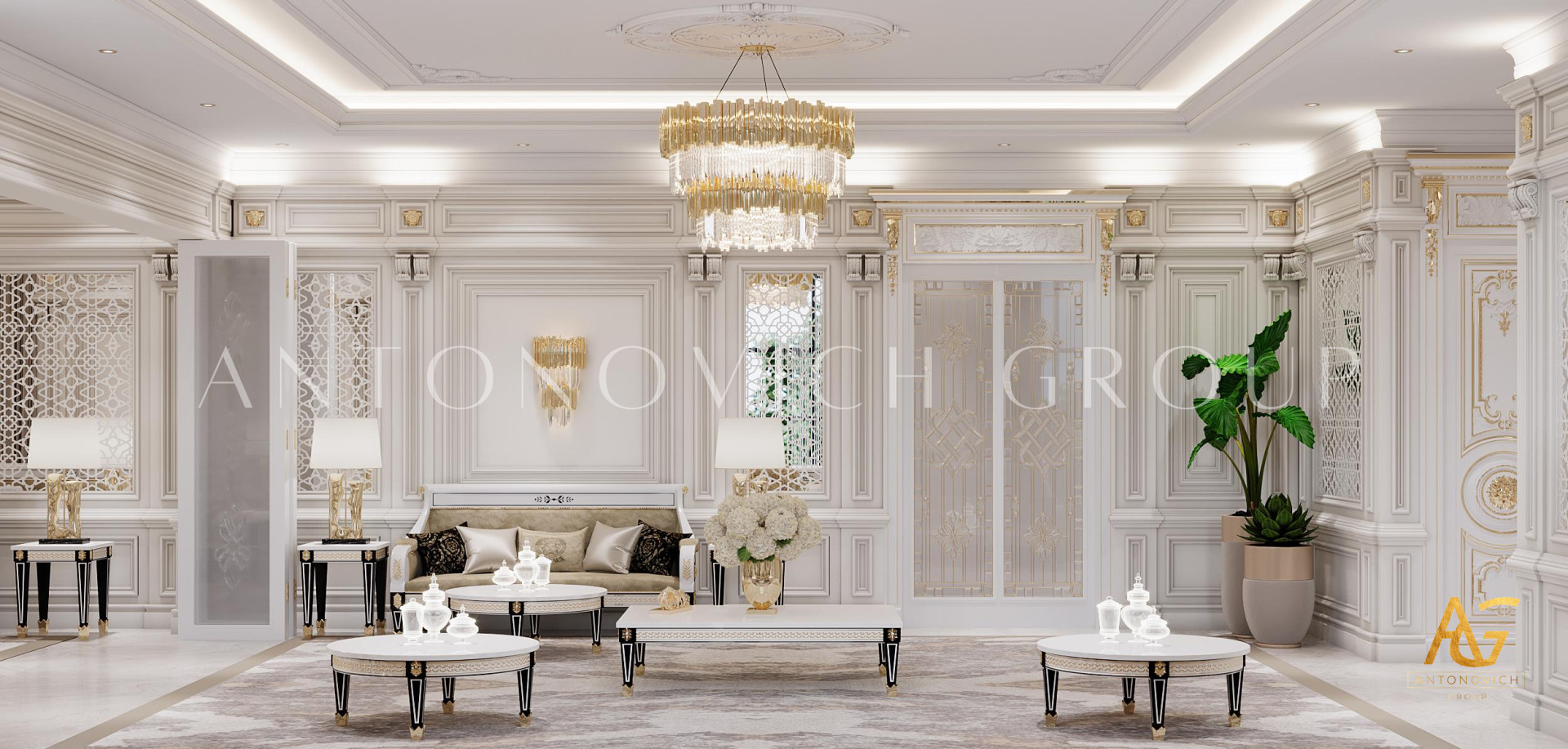 Eastern culture is full of wonderful traditions that embody the features of this country and its people. The interior design of the villa in Al Ain combines design motifs that come from Europe and the beautiful oriental flavor. Interior Designers Al Ain Luxury Antonovich Design studio offered a combination of oriental and classical style for beautiful villa interior .Part of the villa project was majlis design. This room, which in the eastern interior of the special mission. And majlis design Al Ain perfectly reflects the main tradition, which is the warmth and hospitality. On the ground floor is allocated a separate room for the Majlis interior . To comfortably accommodate the maximum number of guests interior designers have proposed to place around the perimeter of the room comfortable sofas. We offer our valued customers a luxurious furniture from the best Italian factories. And this furniture is made according to the sketches of our designers and then delivered directly to the site. Soft sofas are upholstered in luxurious silk with printed motifs that shimmer with pearly luster. The shining mood of purity and freshness in the Majlis interior sets bright range of colors. The floors are decorated with white Italian marble with carved patterns. The decor of the walls is filled with boiserie mirror panels in the eastern frames. This creates a wonderful feeling of home warmth. Part of the walls is complemented with gilded stucco . Arched windows decorated with luxurious curtains made from delicate silk. majlis design Al Ain has become an ideal continuation of the overall design concept of the villa.