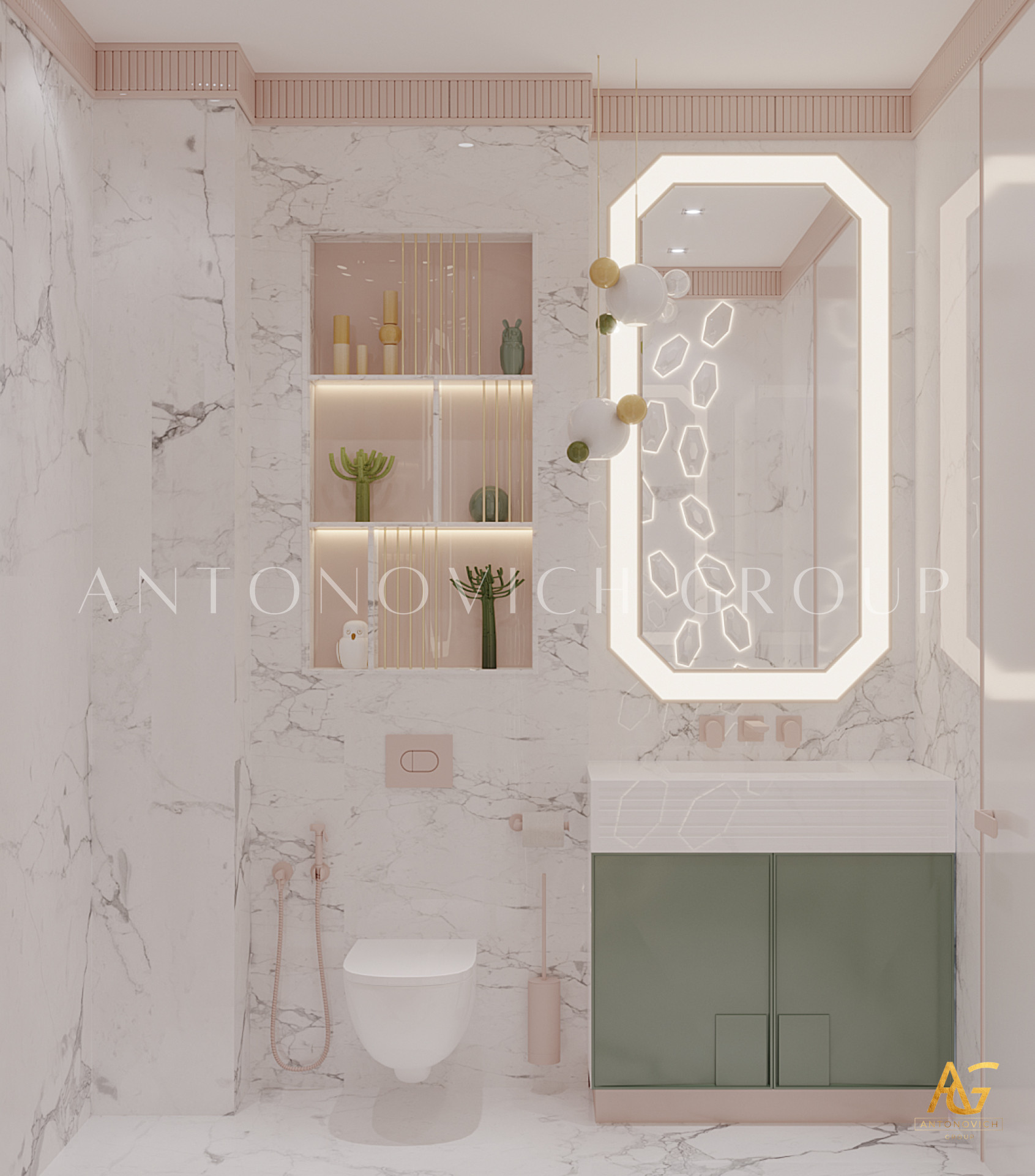 Expressing the mood of the elegant classic in the project of the house, the studio Luxury Antonovich Design designers designed the bathroom interior in the same refined and aristocratic motives. A discreet palette of shades pleasantly pleases eyes tuning to a wave of relaxation and pleasure. A big role in creating a really comfortable space was furniture. Here we proposed a somewhat unconventional option for both bathrooms. High cabinets with glass showcases have become part of the decoration. A natural wood that is painted in a muted beige shade is complemented by exquisite fittings and lighting elements. Interior designers skillfully use motifs of geometric ornaments, which will become a trendy accent of the 2018 season. On the floor, marble tiles in the form of rhombs are stylishly echoed with a vertical pattern of tiles on the walls. Using a combination of contrasting shades and vertical stripes in the decor of the walls, the designers managed to visually increase the height of the space. The smooth smooth surface of the ceiling is complemented with neat ceiling lights. And the most elegant element of the bathroom interior was the window decoration. The window was decorated with a luxurious Roman blind. Ideal waves of noble silk with a bronze tint give the interior a touch of luxurious chic. For practicality, instead of traditional tulle, modern white blinds are offered here. The shower cubicle is decorated inside with a mosaic tile with a pearl luster. The accents of this tile are also present in the decor of the rest of the walls. Every detail, every shade, every arrangement of furniture plays an important role in creating a harmonious and comfortable space. building floor plans, building house plans