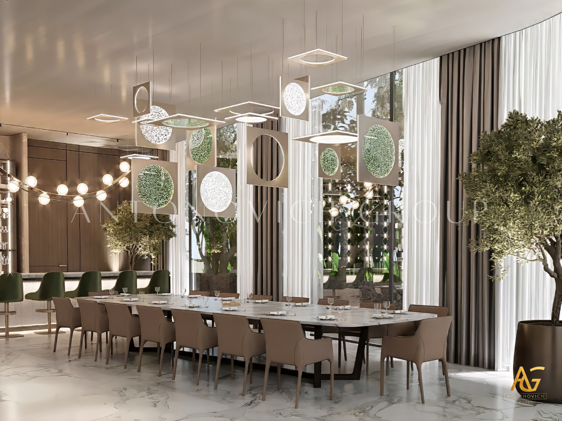 Whether it’s a spacious villa dining area or a compact apartment setup, Antonovich Group plans every inch carefully — from ceiling height and furniture positioning to lighting integration and flooring materials.