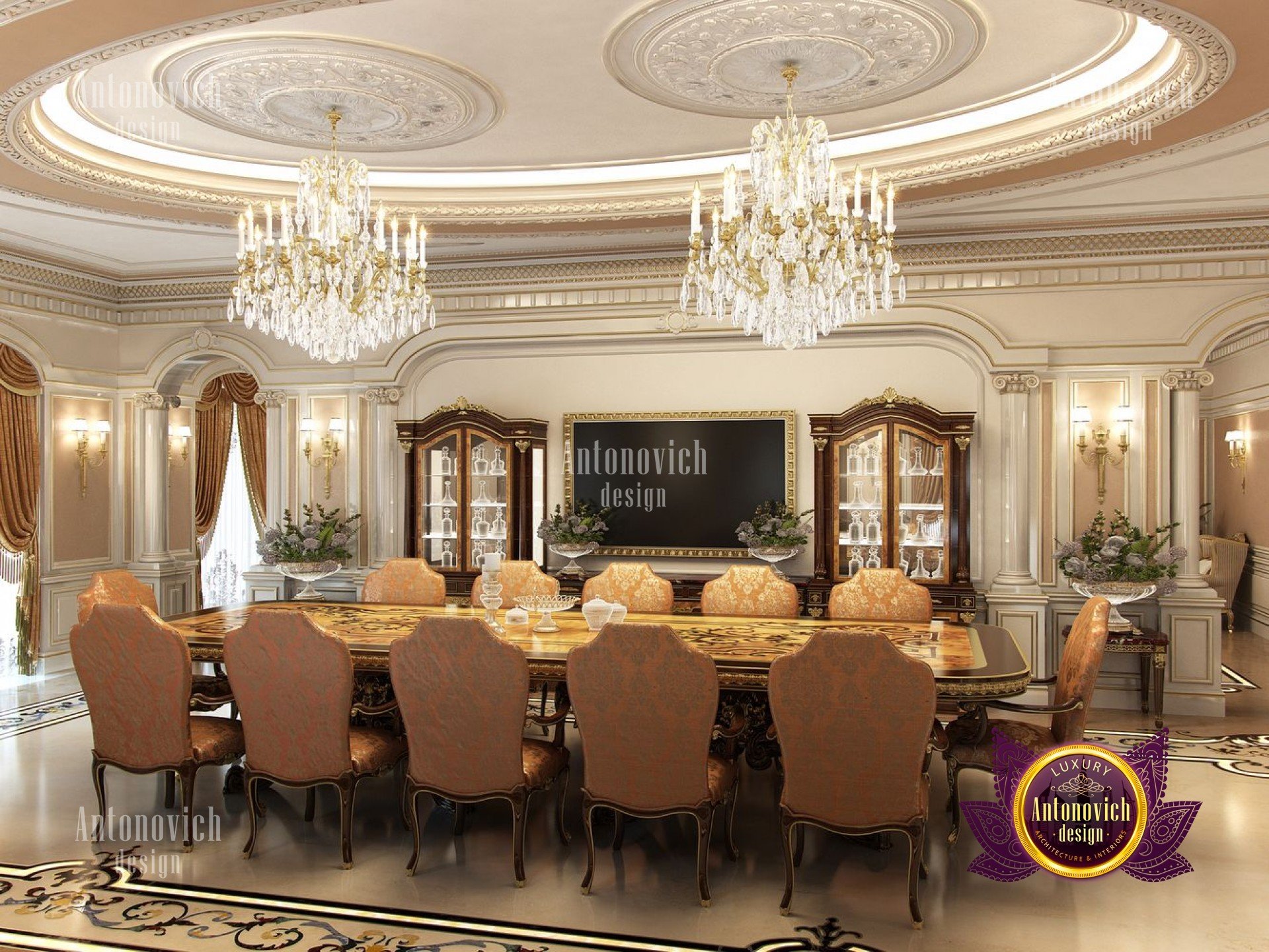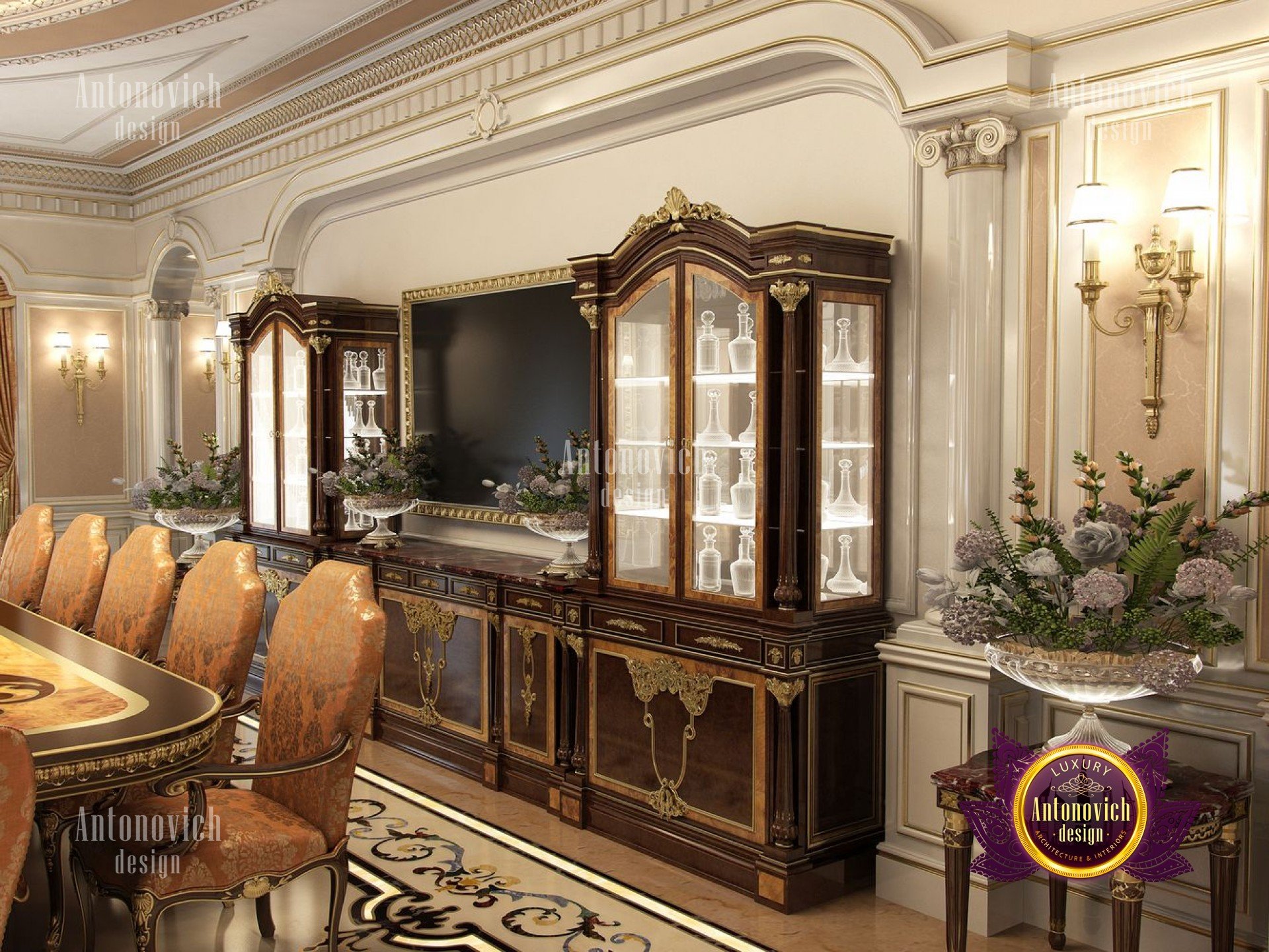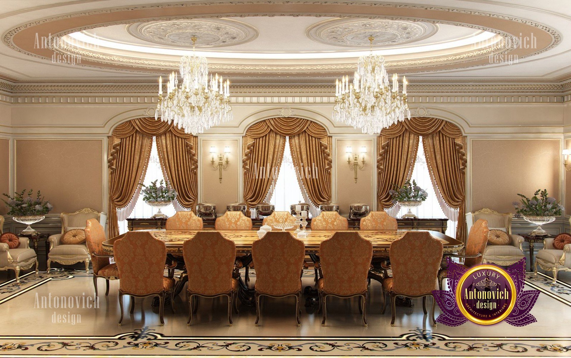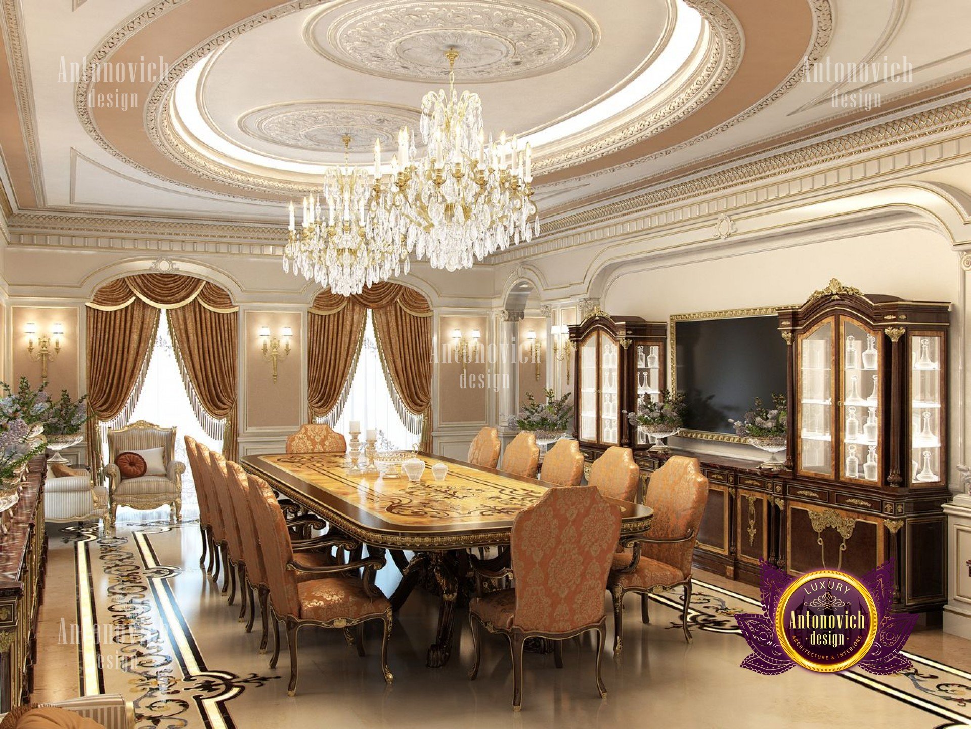 In this beautiful architectural house design project of the dining room Nigeria our team of Luxury Antonovich Design strove to create something original! We have experimented with shades of brown and combinations of other colors in desire to get a calm atmosphere, but add energy and life to it with the help of bright elements. In order to maintain a positive, cheerful mood our designers have used brighter lighting in the table area in a form of two gorgeous crystal chandeliers with candle form lamps, elegant wall sconces, bright curtains with iridescent textures, framed mirrors and live flowers in stunning vases.
