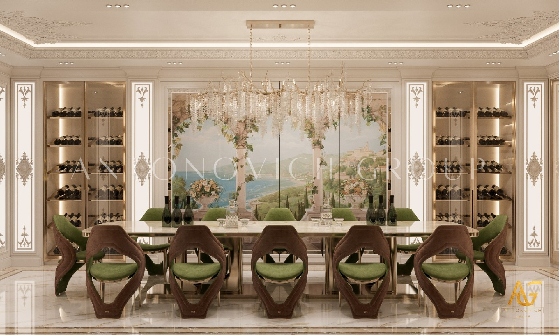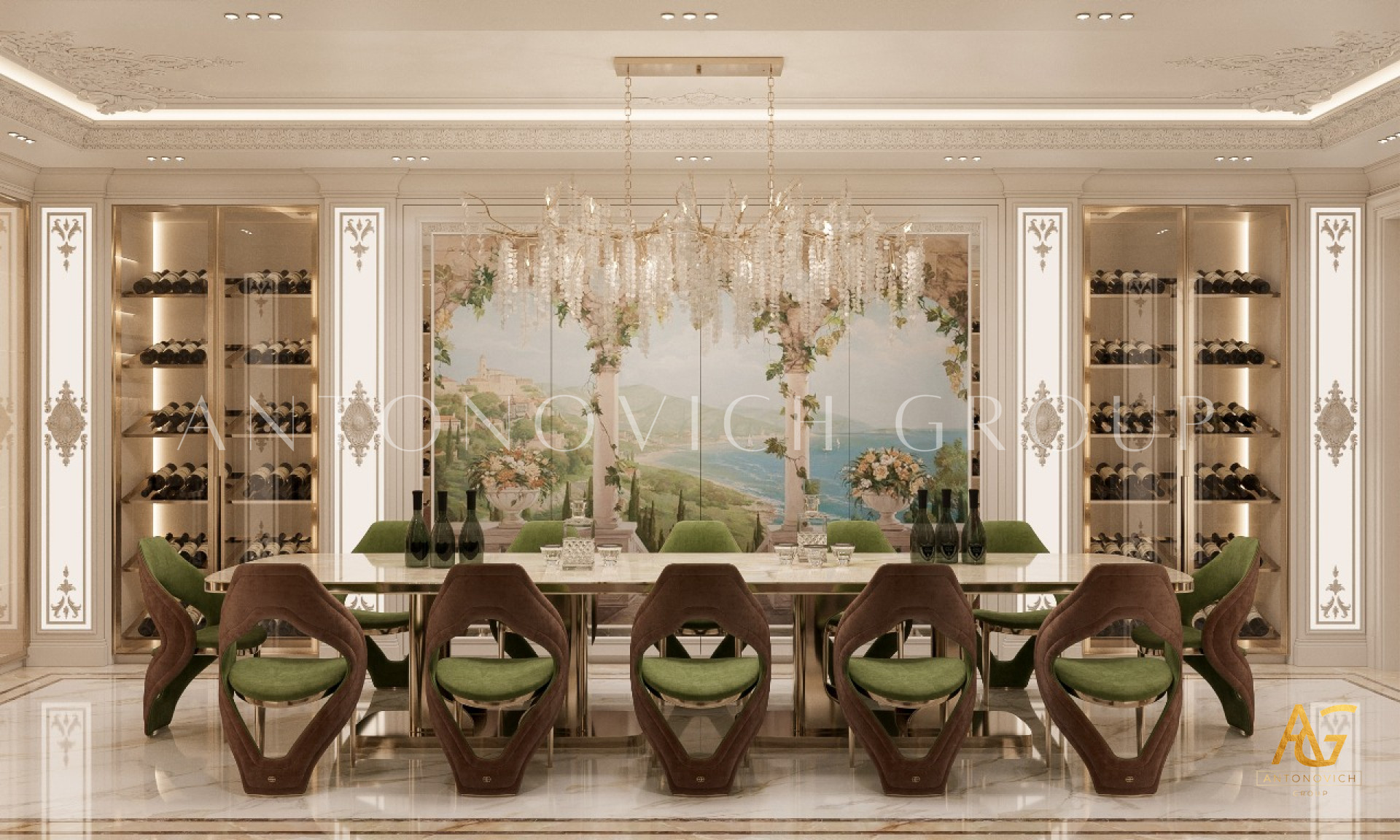 A dining room with a wine cellar is the epitome of luxury living in Dubai and the UAE. The combination of gourmet dining and a meticulously designed wine room adds a touch of grandeur to any villa or residence. Antonovich Group brings years of experience in luxury dining room design in Dubai, transforming spaces into elegant settings that feature the latest trends in interior design while maintaining timeless sophistication.