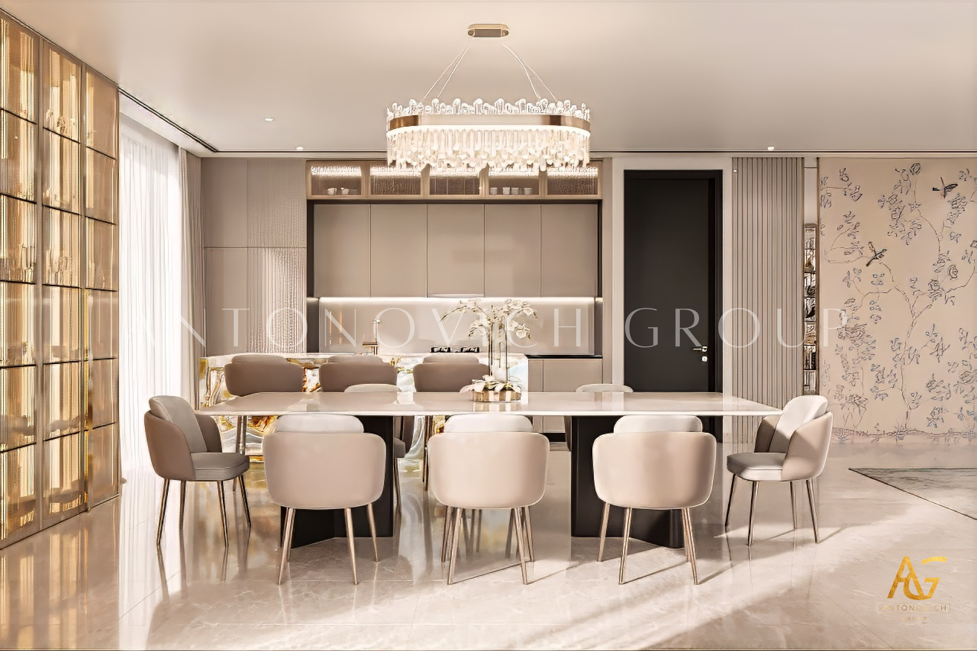 Each design begins with a meticulous concept development process, where proportions, materials, lighting, and textures are harmonized to create an atmosphere of comfort and sophistication. Whether for a royal-style villa, modern penthouse, or luxury residence, Antonovich Group tailors each dining room to reflect the client’s personality and preferences while maintaining the essence of elegant living.