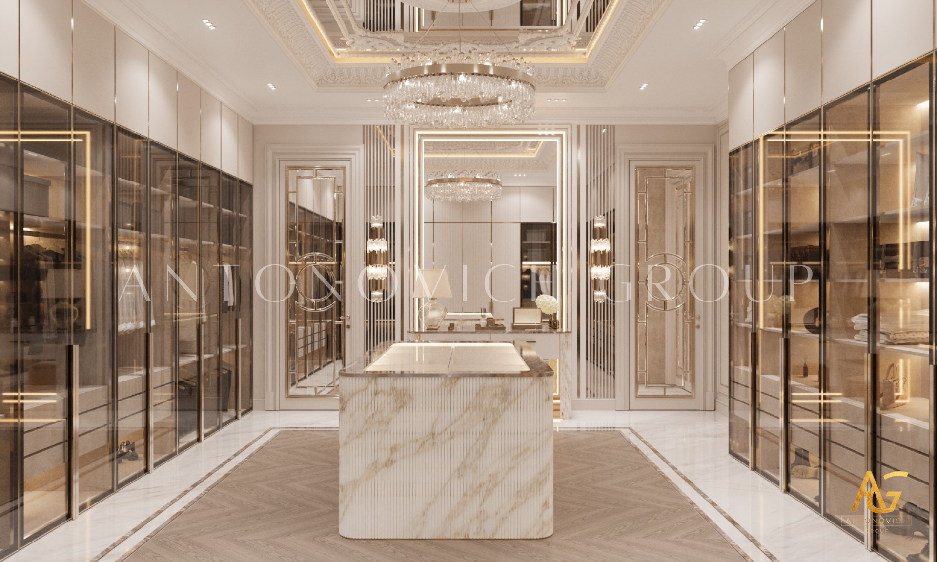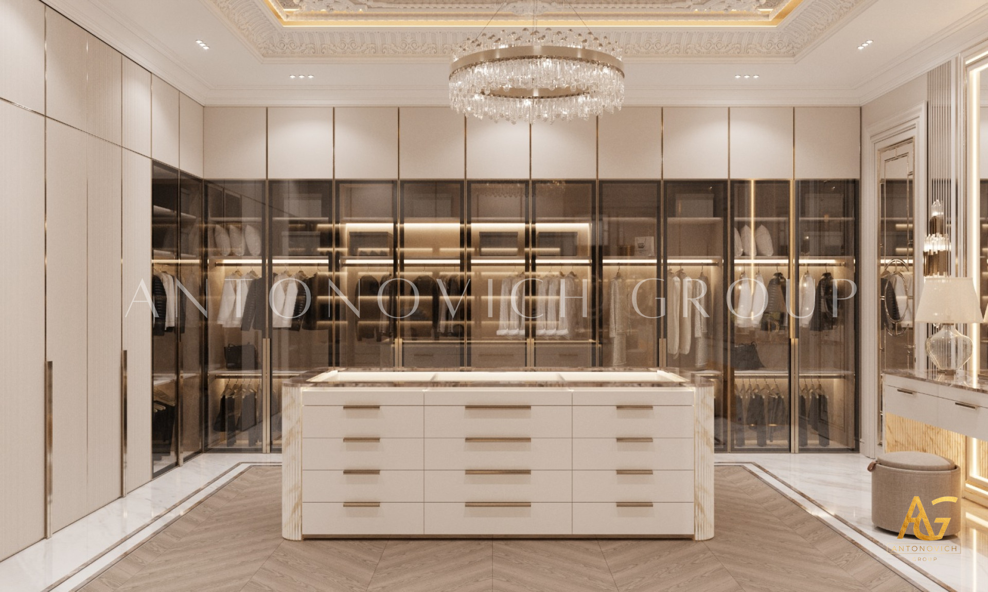 Apartment design in the UAE from Luxury Antonovich Design Studio is filled with beautiful motifs of classic luxury. And in these luxurious accents, Dubai interior designers skillfully combined notes of modern trends. As a result, a relatively small dressing room has become an island of lush splendour for convenient clothes storage. The highlight of the interior design has become the ceiling. The ceiling is decorated with the image of a blue sky with light clouds. The full illusion of the heaven island is enhanced thanks to the line of LED backlighting, which outlines a niche in the ceiling. Luxuriously and solid in the interior look luxurious The wardrobe doors , which are skilfully encrusted with carved decoration and gold, look really luxurious. The curls of carved decoration are delicately repeated on the wide moldings, which are decorated with stucco.