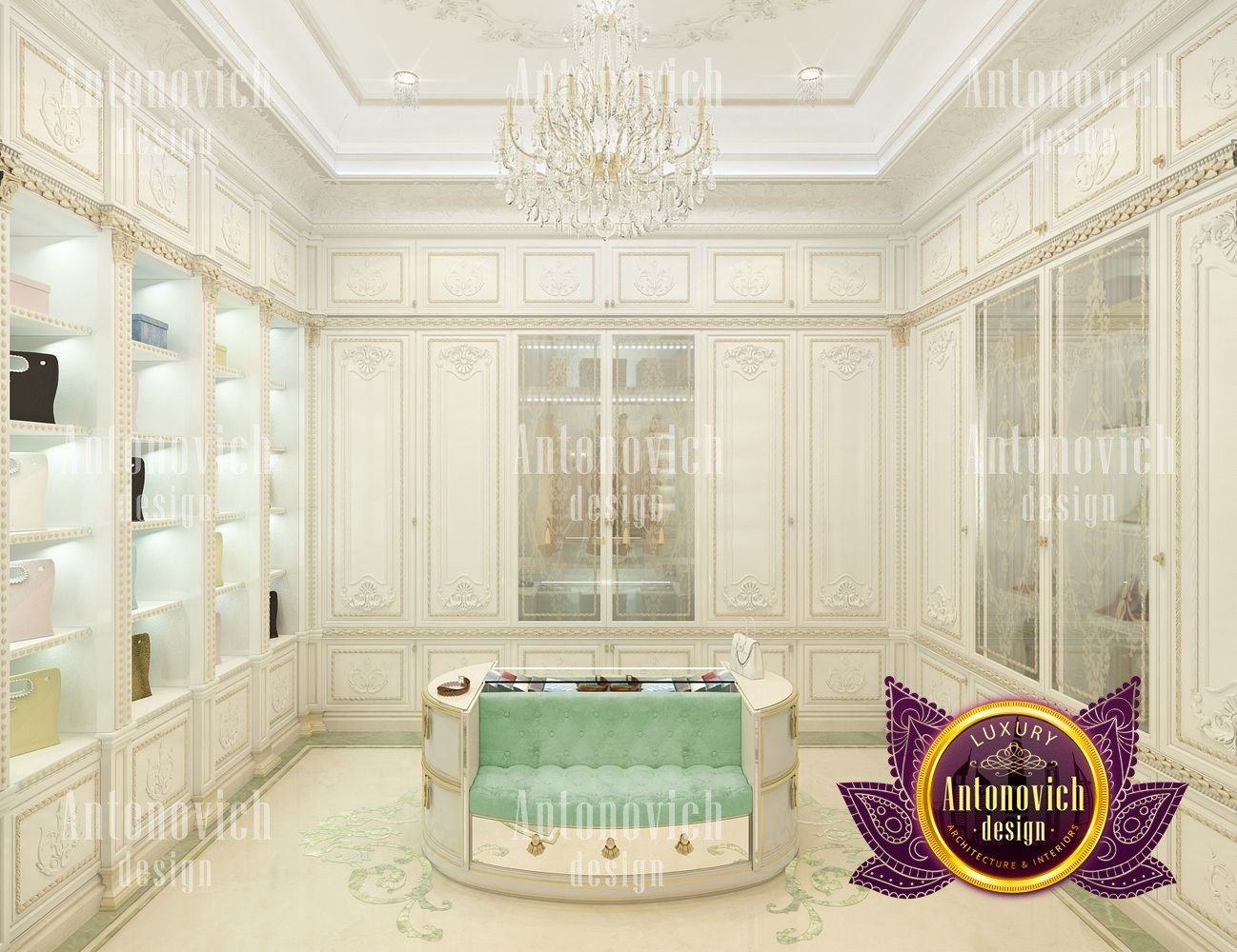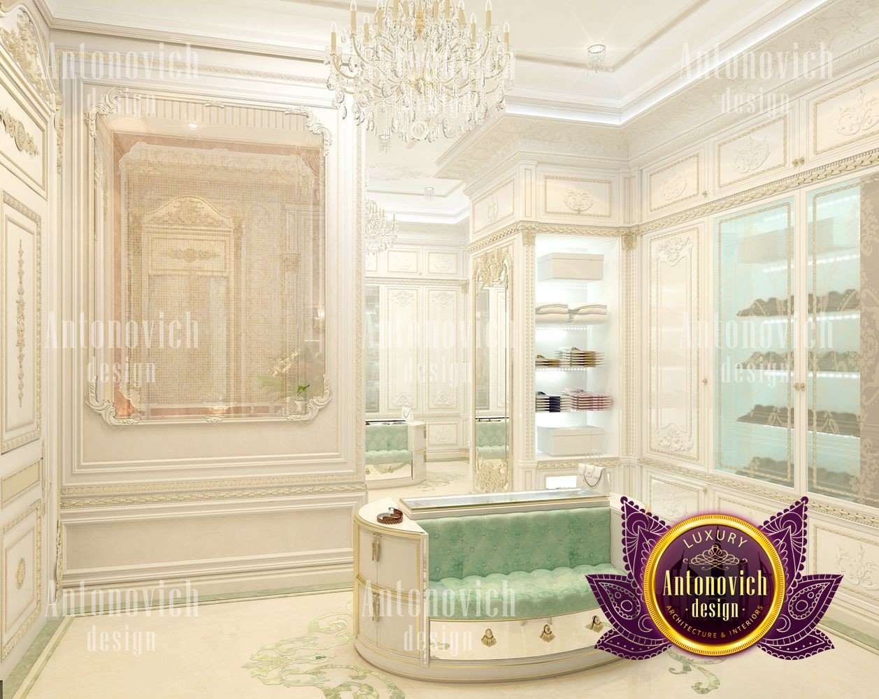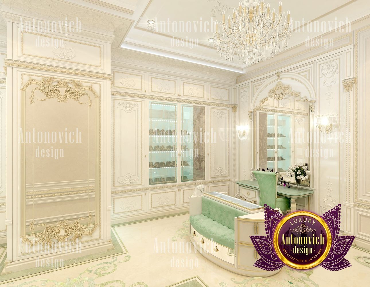 Sometimes the interior of a simple dressing room can become a favorite place in the house. Especially when it comes to the dressing room for the female. In this project, studio designers Luxury Antonovich Design have created a luxurious oasis for the storage of belongings of the owner of a large house. According to the project, there is enough space for the dressing room and we organized it in such a way as to store things, to choose clothes and to change clothes was absolutely comfortable. In general, the interior of the dressing room continues the concept of the interior of the whole house. Here there is a splendor of classics with accents of art deco. Since the dressing room is not a very large space, the white color in the palette of shades is ideally suited here. With its help, both with the help of mirrors and lighting, interior designers visually increase space. The highlight of the interior was a beautiful insular design for storing jewelry and small accessories. Two semi-circular padded stools are attached to it, on which, with comfort, you can slowly try on shoes. The floor is completely covered with a natural carpet with a classic ornament. Part of the dressing room was the boudoir with a large mirror in the carved frame. All the wardrobes in the dressing room are made of natural wood, which is pearly white. The furniture is decorated with carved decor with gilding. The shine of the beauty of the dressing room interior complemented by room mirrors with beautiful overhead ornaments. The height of the ceiling is sufficient to use traditional decor in the form of curls of stucco molding and a beautiful crystal chandelier.