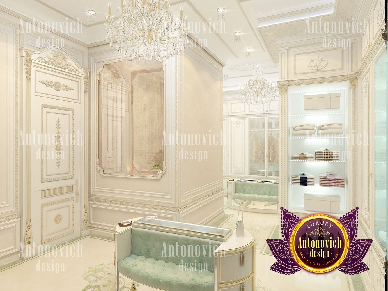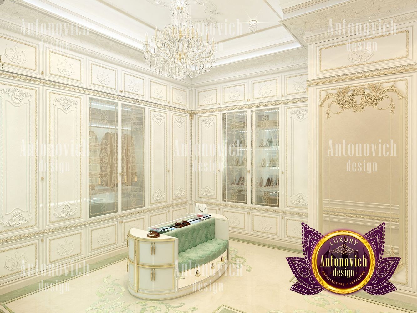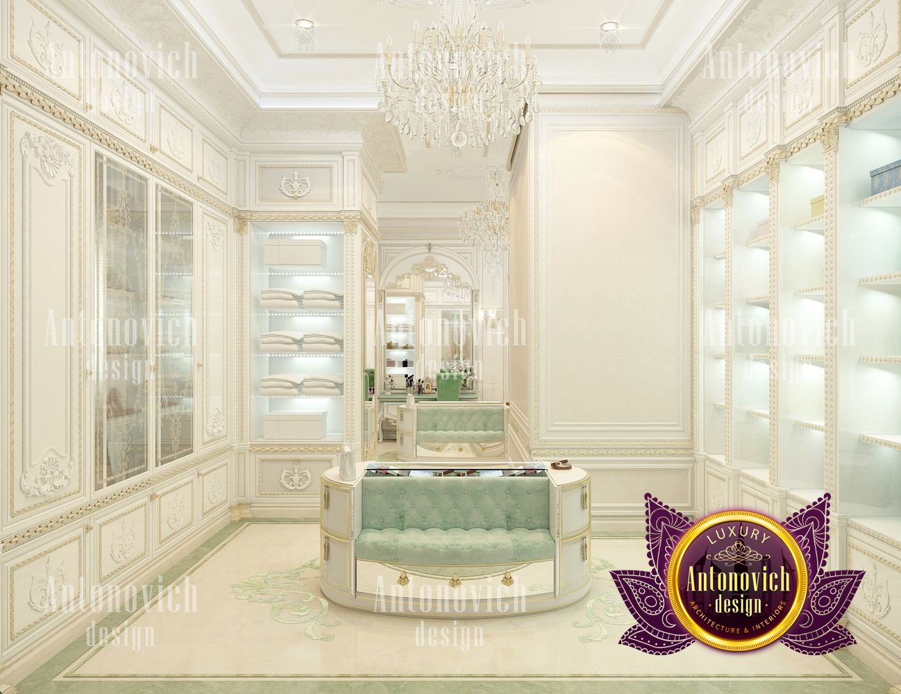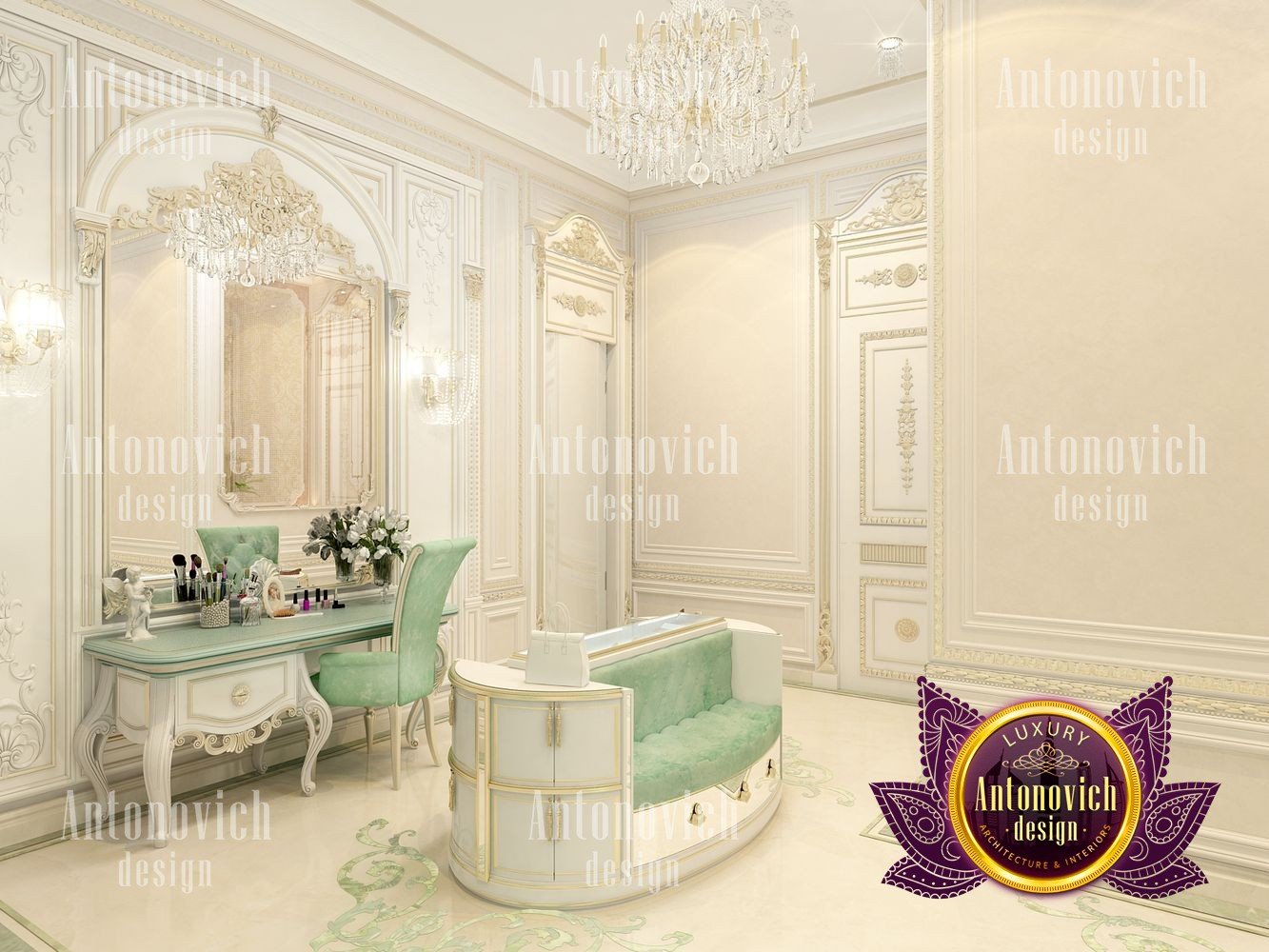 Sometimes the interior of a simple dressing room can become a favorite place in the house. Especially when it comes to the dressing room for the female. In this project, studio designers Luxury Antonovich Design have created a luxurious oasis for the storage of belongings of the owner of a large house. According to the project, there is enough space for the dressing room and we organized it in such a way as to store things, to choose clothes and to change clothes was absolutely comfortable. In general, the interior of the dressing room continues the concept of the interior of the whole house. Here there is a splendor of classics with accents of art deco. Since the dressing room is not a very large space, the white color in the palette of shades is ideally suited here. With its help, both with the help of mirrors and lighting, interior designers visually increase space. The highlight of the interior was a beautiful insular design for storing jewelry and small accessories. Two semi-circular padded stools are attached to it, on which, with comfort, you can slowly try on shoes. The floor is completely covered with a natural carpet with a classic ornament. Part of the dressing room was the boudoir with a large mirror in the carved frame. All the wardrobes in the dressing room are made of natural wood, which is pearly white. The furniture is decorated with carved decor with gilding. The shine of the beauty of the dressing room interior complemented by room mirrors with beautiful overhead ornaments. The height of the ceiling is sufficient to use traditional decor in the form of curls of stucco molding and a beautiful crystal chandelier.