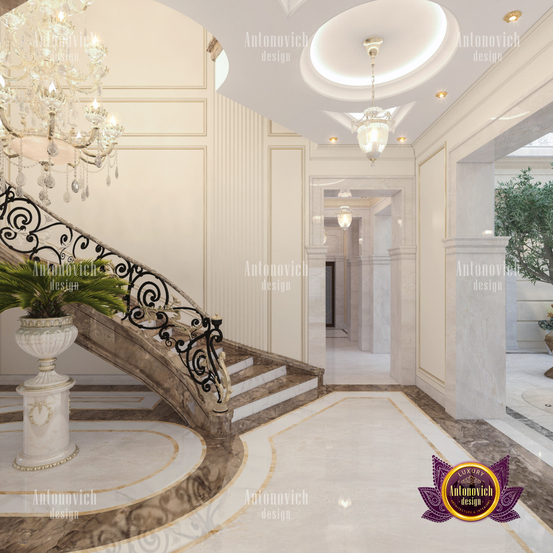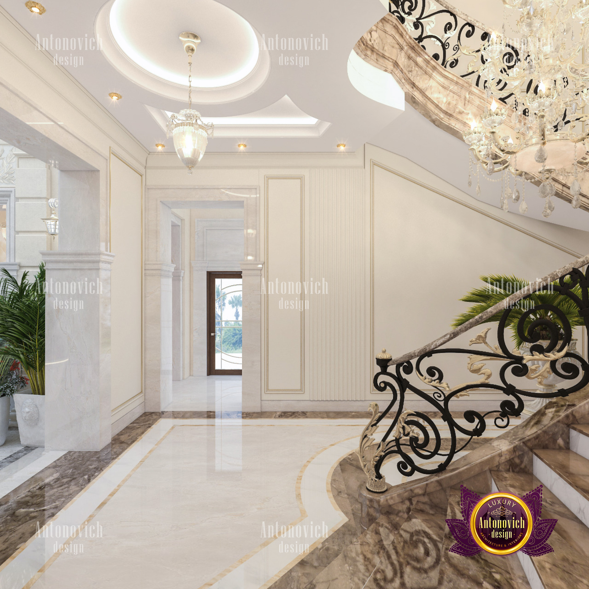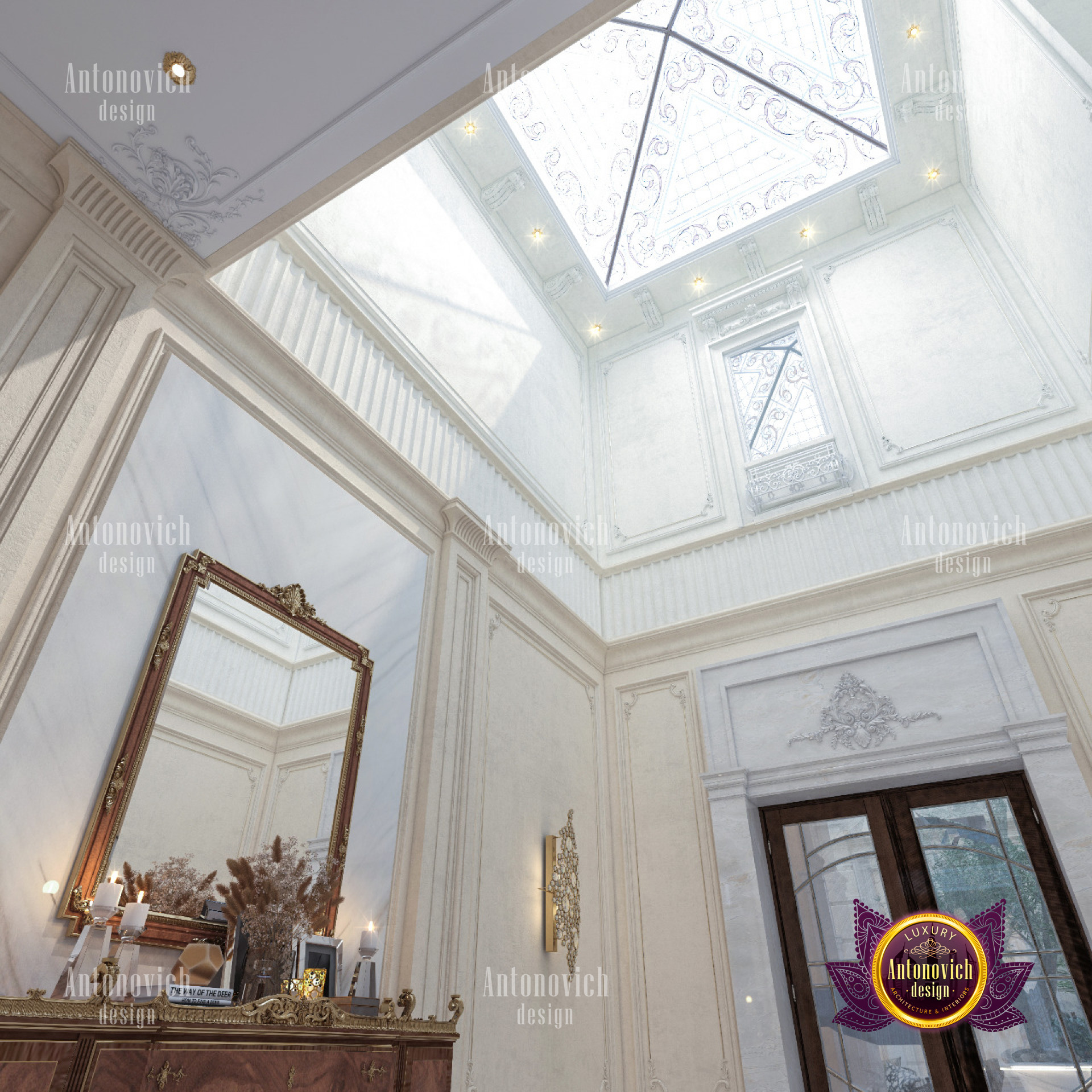 Luxury Antonovich Design has managed to perform an open lay-out interior on its entrance area although the receiving space. This is where an artists dome roof is made up of art glass with a combination of fiber and stained glass. With a great splash of royalty design, indeed the dome roof gives a fascinating mood in the interior. Performing a dome roof design is not a typical task which everybody can do, It takes the most professional and experienced team that has the full ability to perform the finest setup. With a combination of art, creativity, and craftsmanship, Dome roof is being performed. And this skill is one of the special features which the Luxury Antonovich Design team is offering. Most of the Royal Villas in Dubai as well as Arabian style home requires a different style of dome-roof design. And this quadratic-shaped dome roof is distinctively made especially for this villa in Dubai Hills. There is also no excuse to arrange a natural plant and tree for indoors as there is access for the natural sunlight from the dome roof as it is made up of glass.