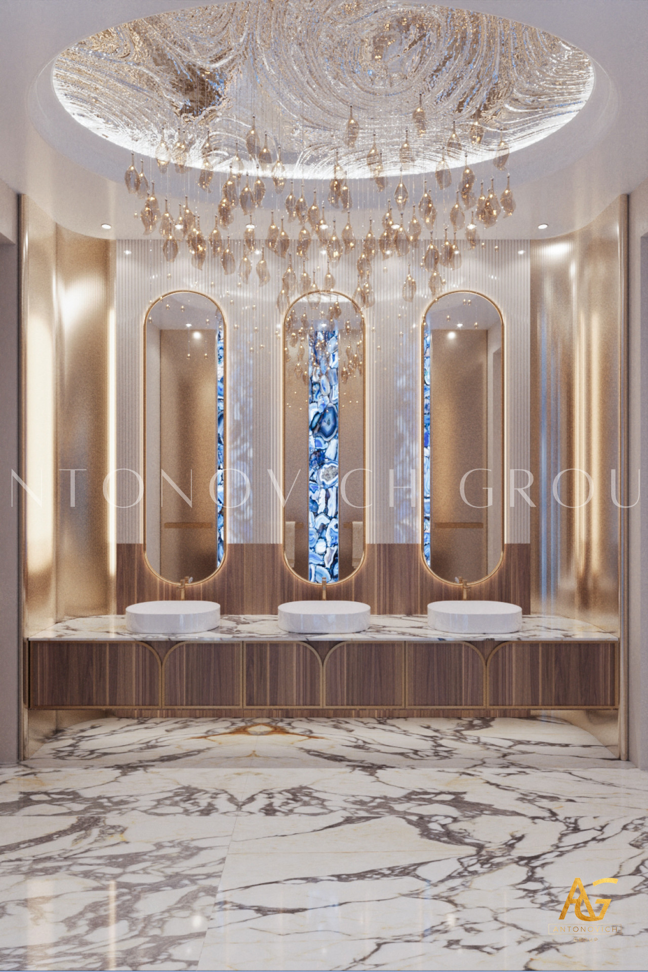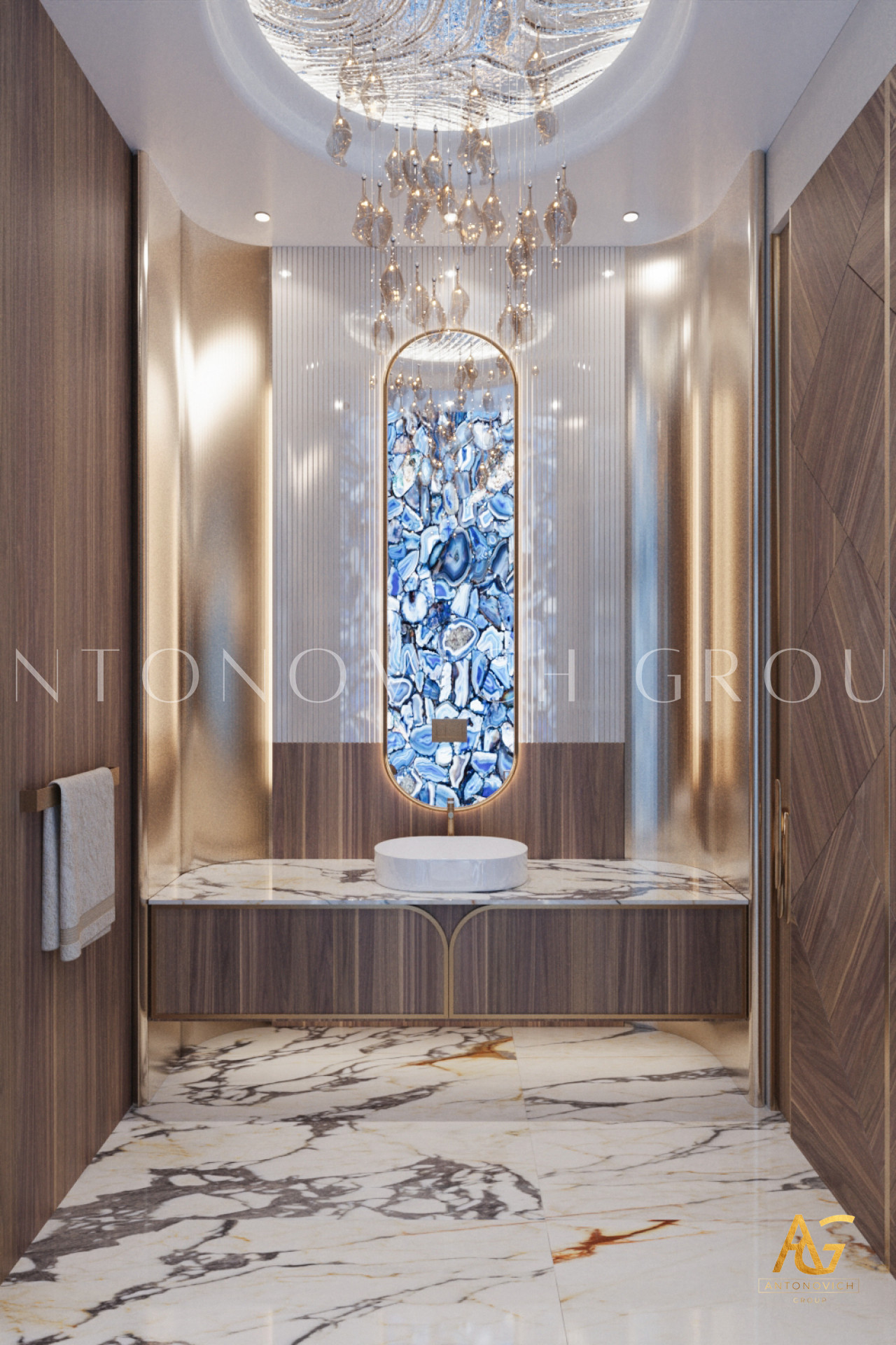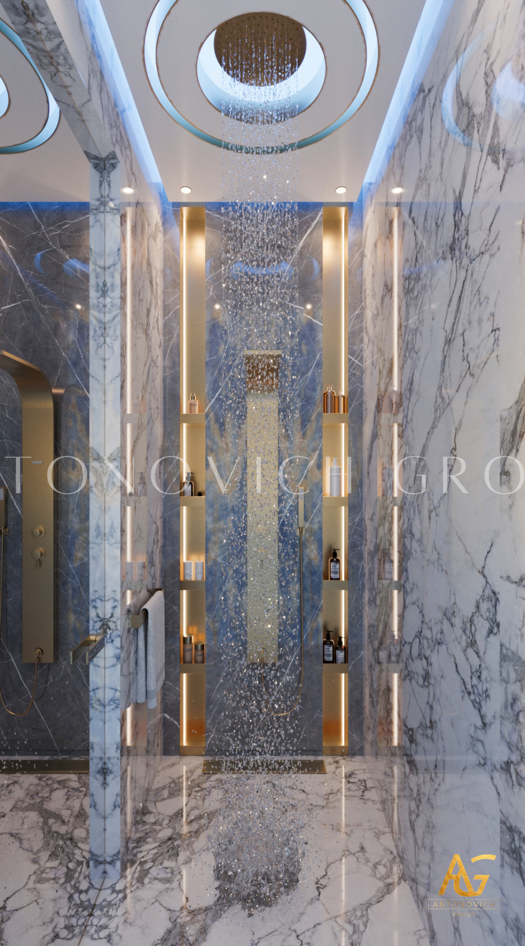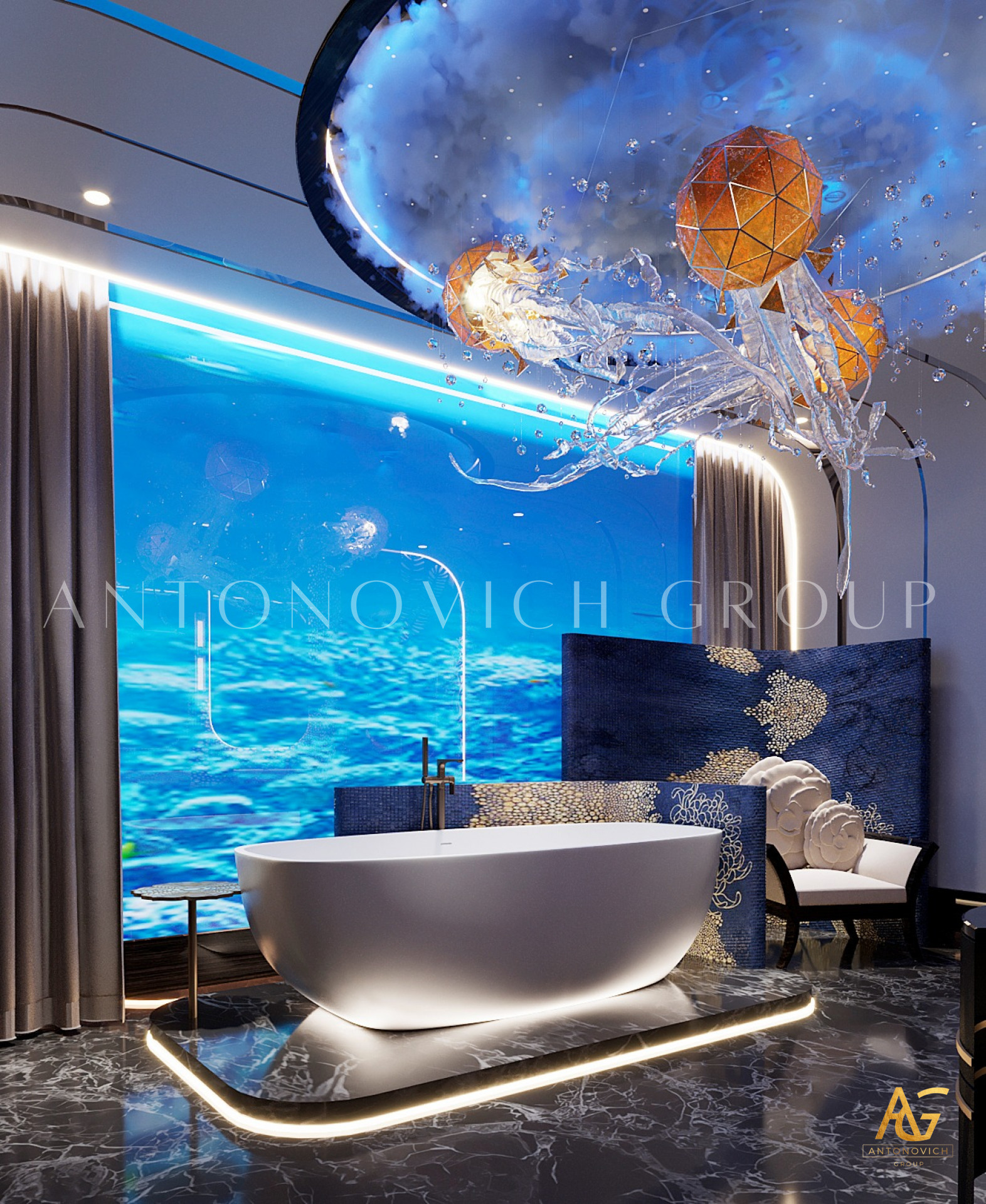 The underwater bathroom is a sanctuary of spa-like serenity. Antonovich Group's residential interior design Dubai includes features such as a glass-enclosed shower with a panoramic view, bringing the beauty of the ocean directly into the bathing experience.