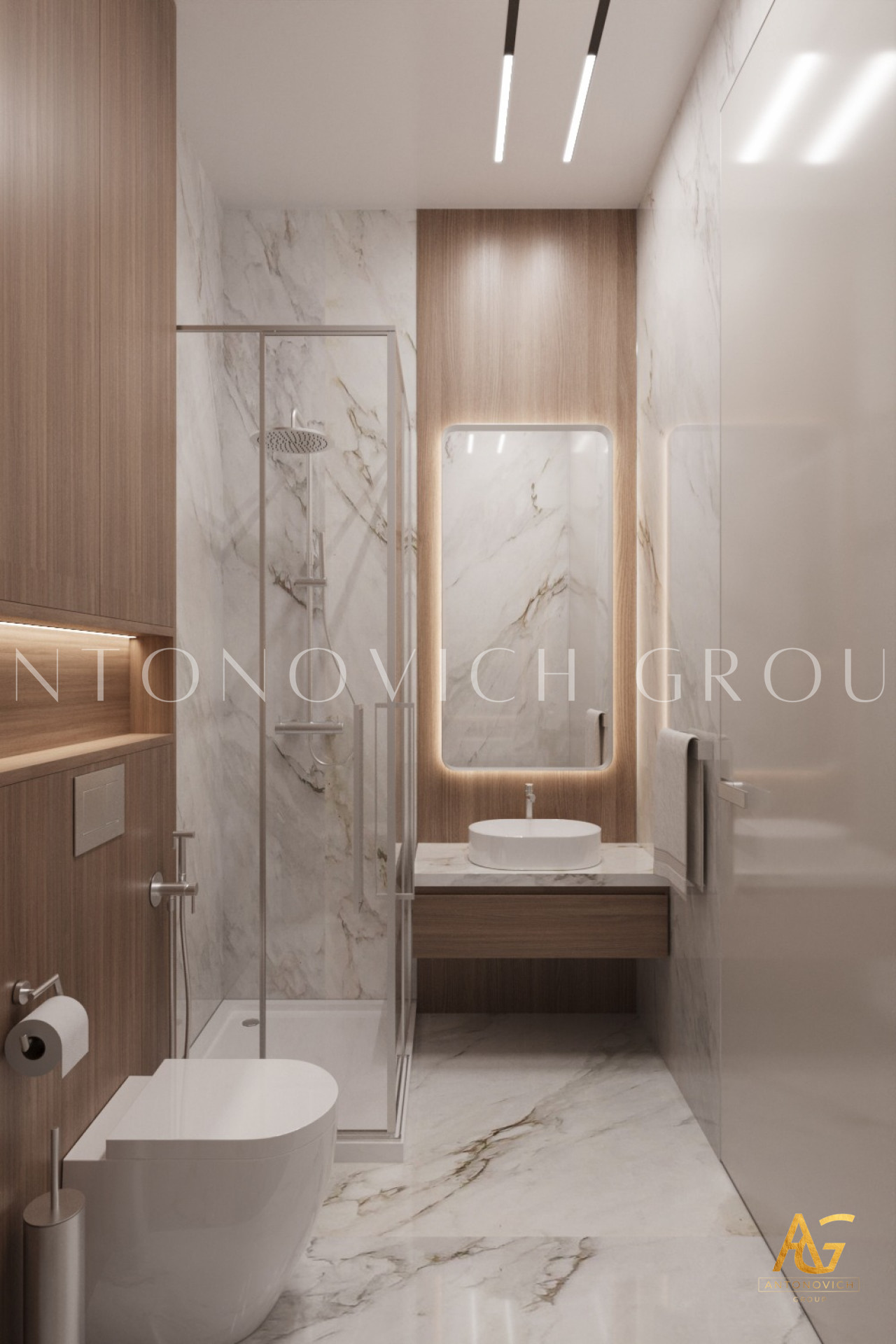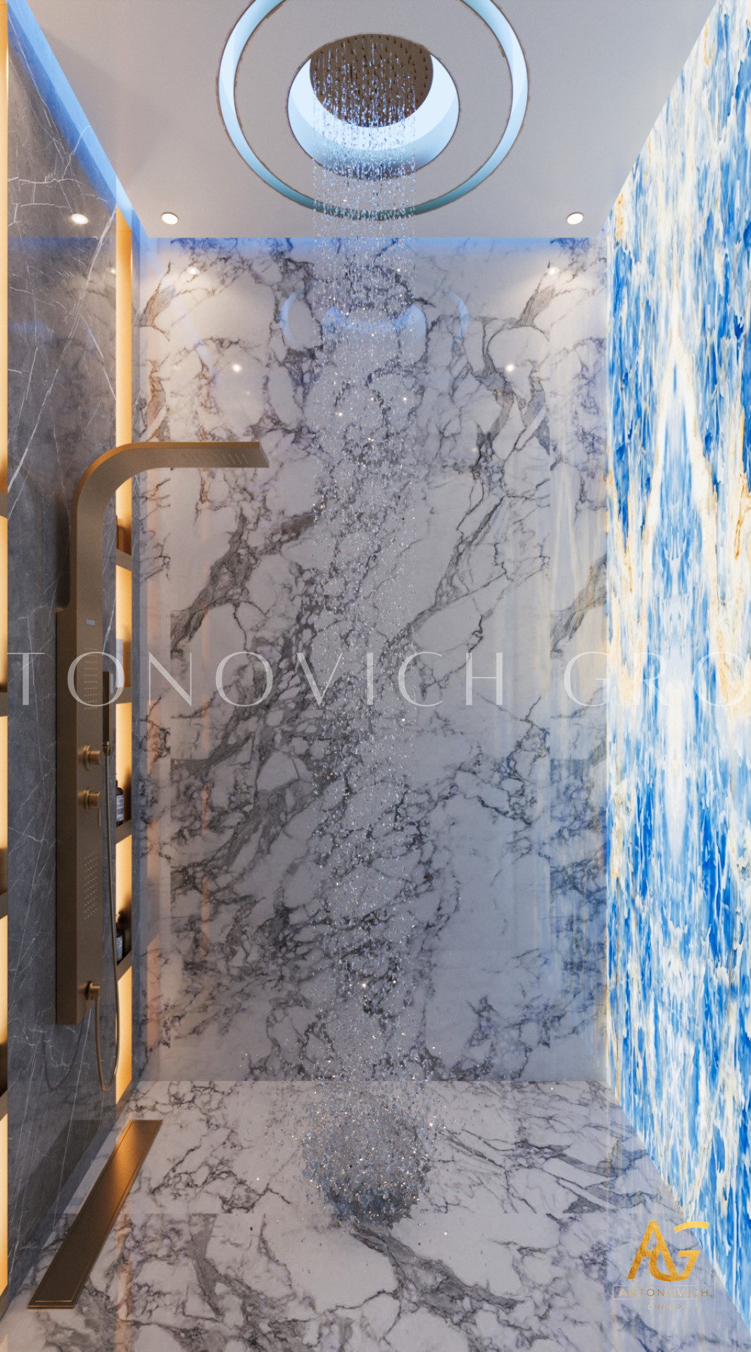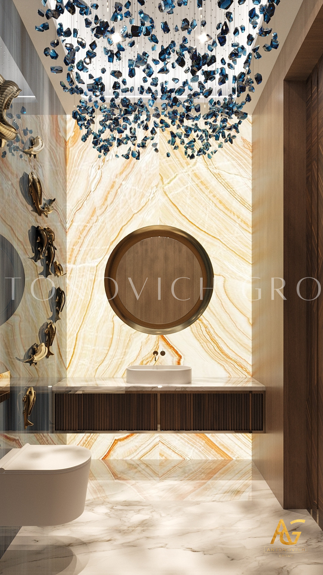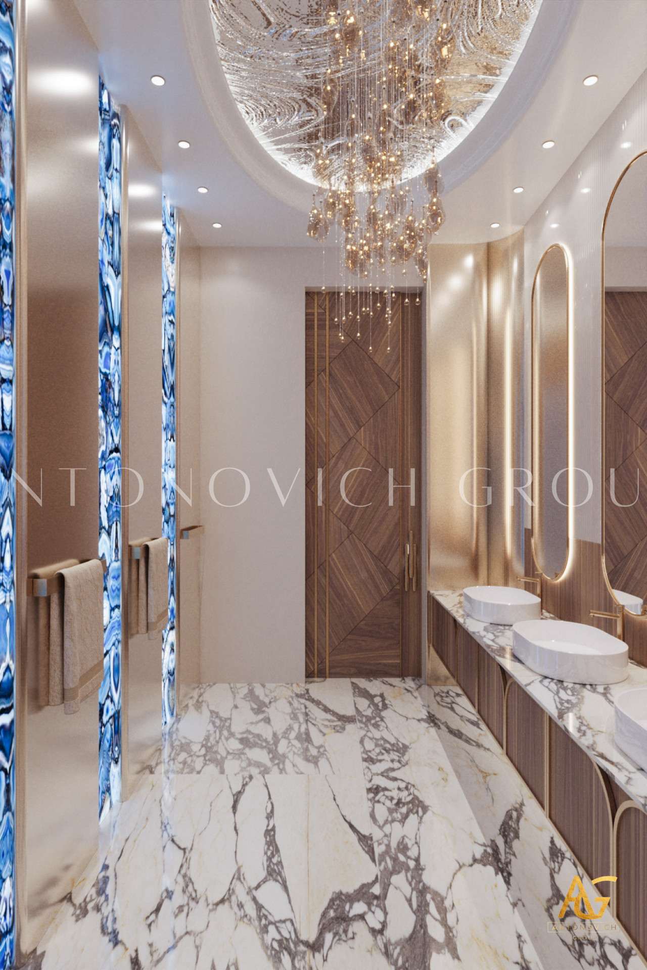 The underwater bathroom is a sanctuary of spa-like serenity. Antonovich Group's residential interior design Dubai includes features such as a glass-enclosed shower with a panoramic view, bringing the beauty of the ocean directly into the bathing experience.