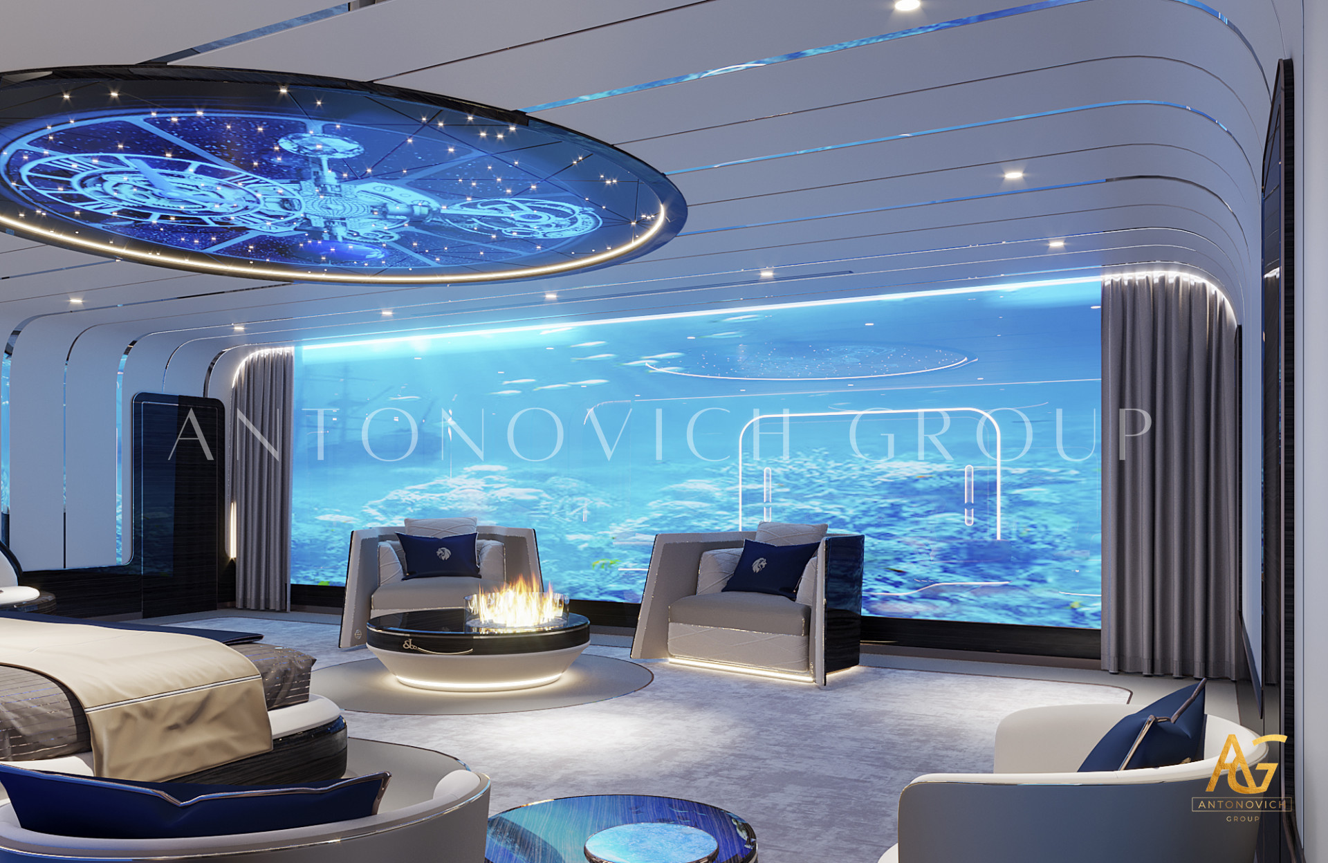 Antonovich Group's interior design services in Dubai take center stage as the underwater master bedroom unfolds. Floor-to-ceiling windows showcase the mesmerizing aquatic world, seamlessly integrating nature into the living space for unparalleled tranquility.