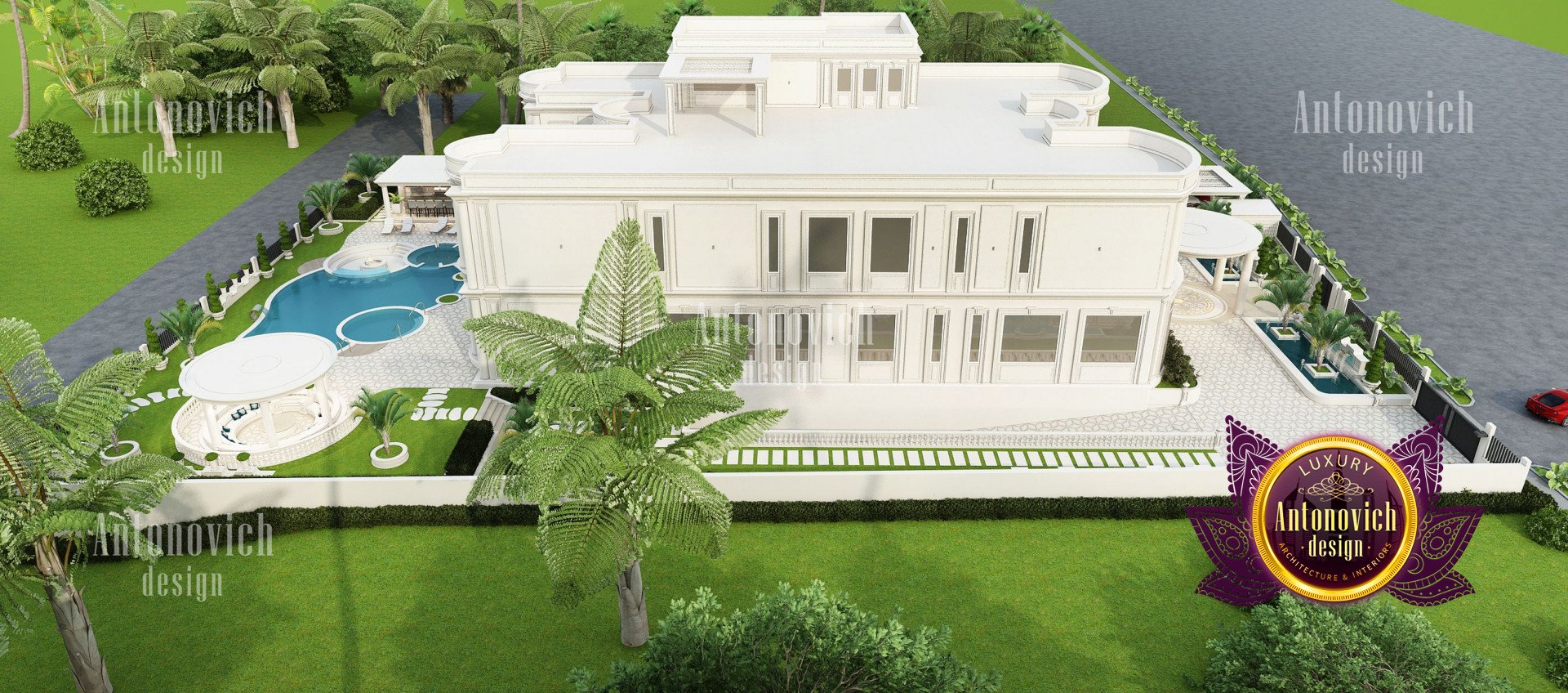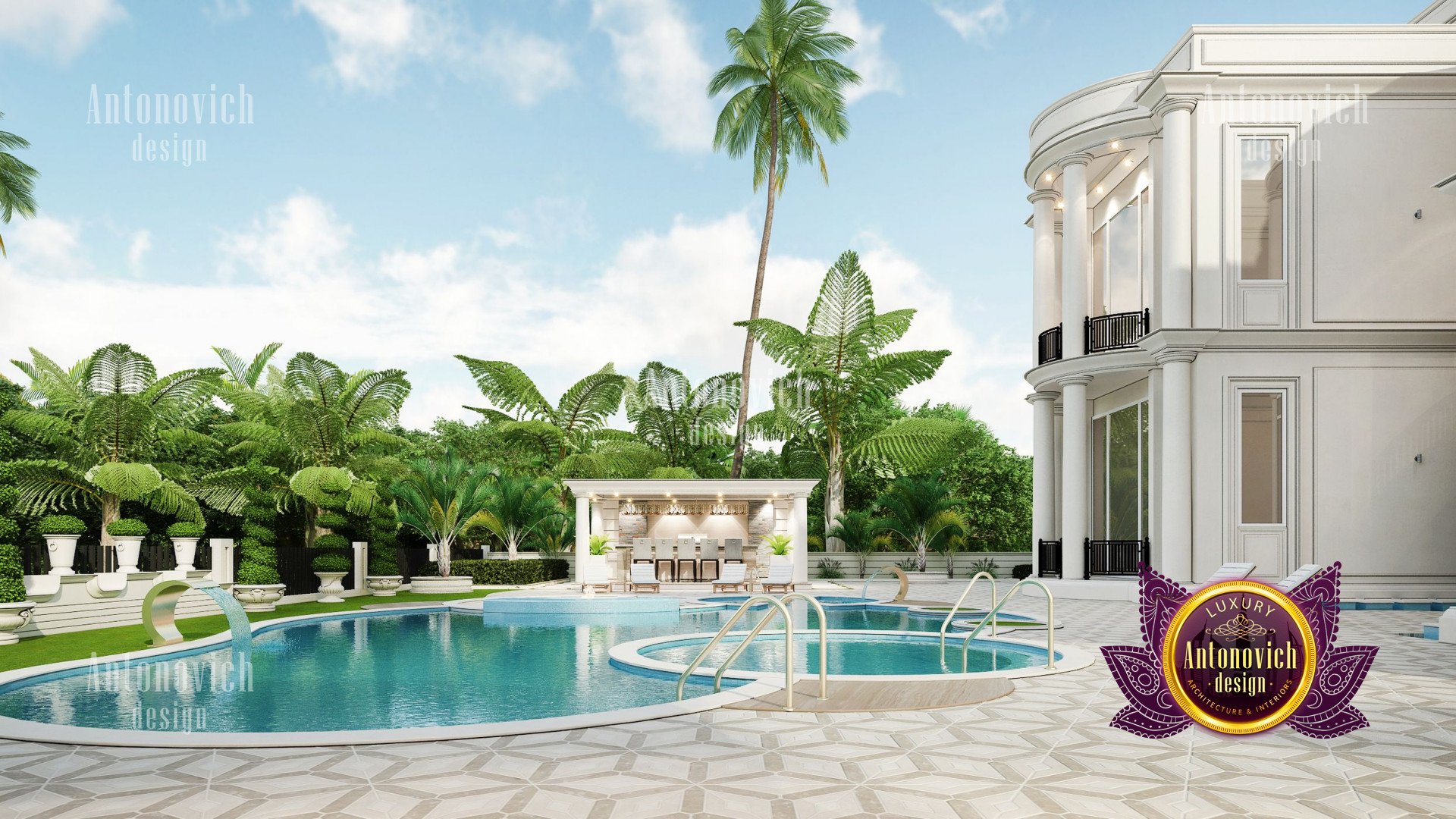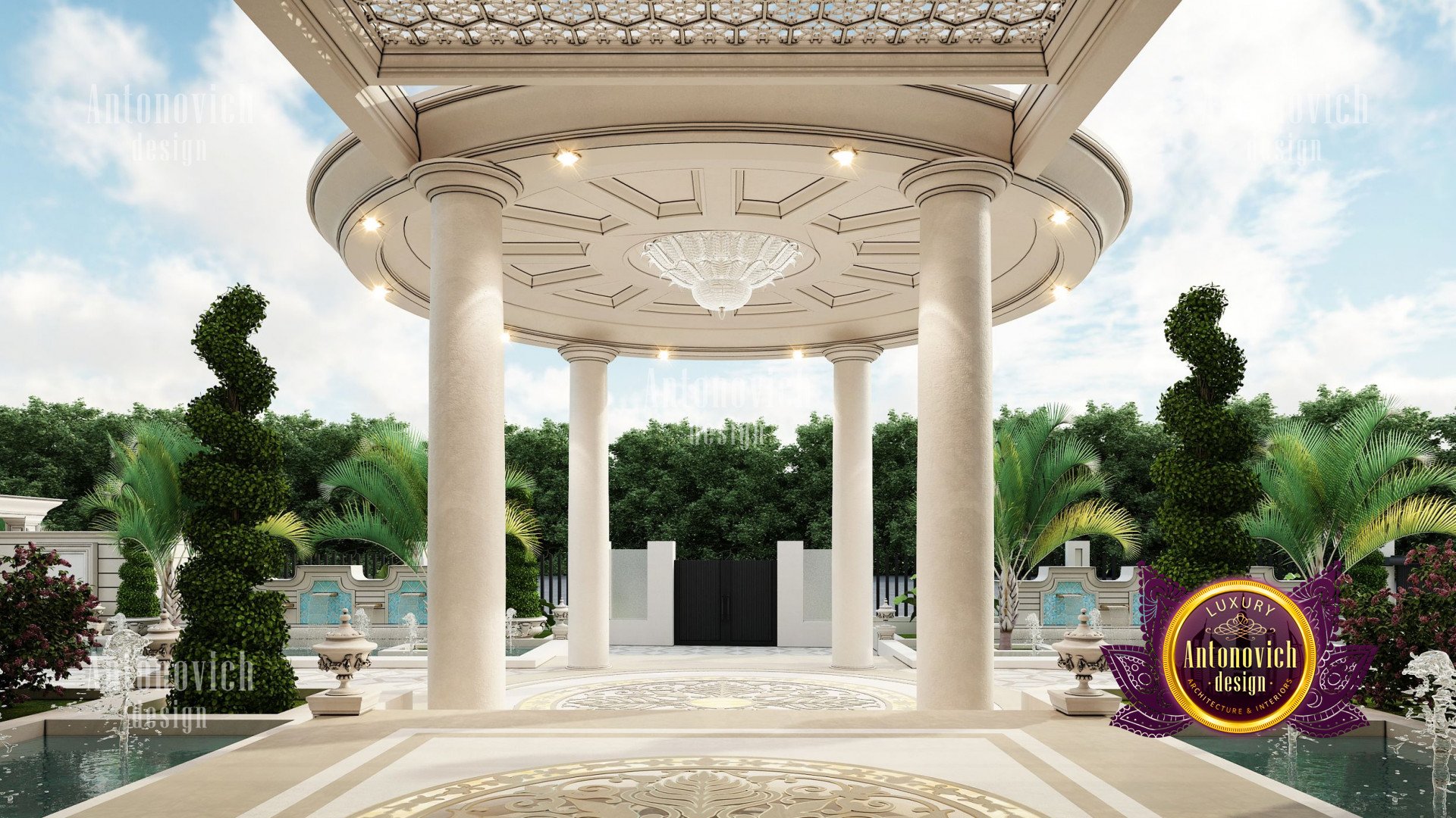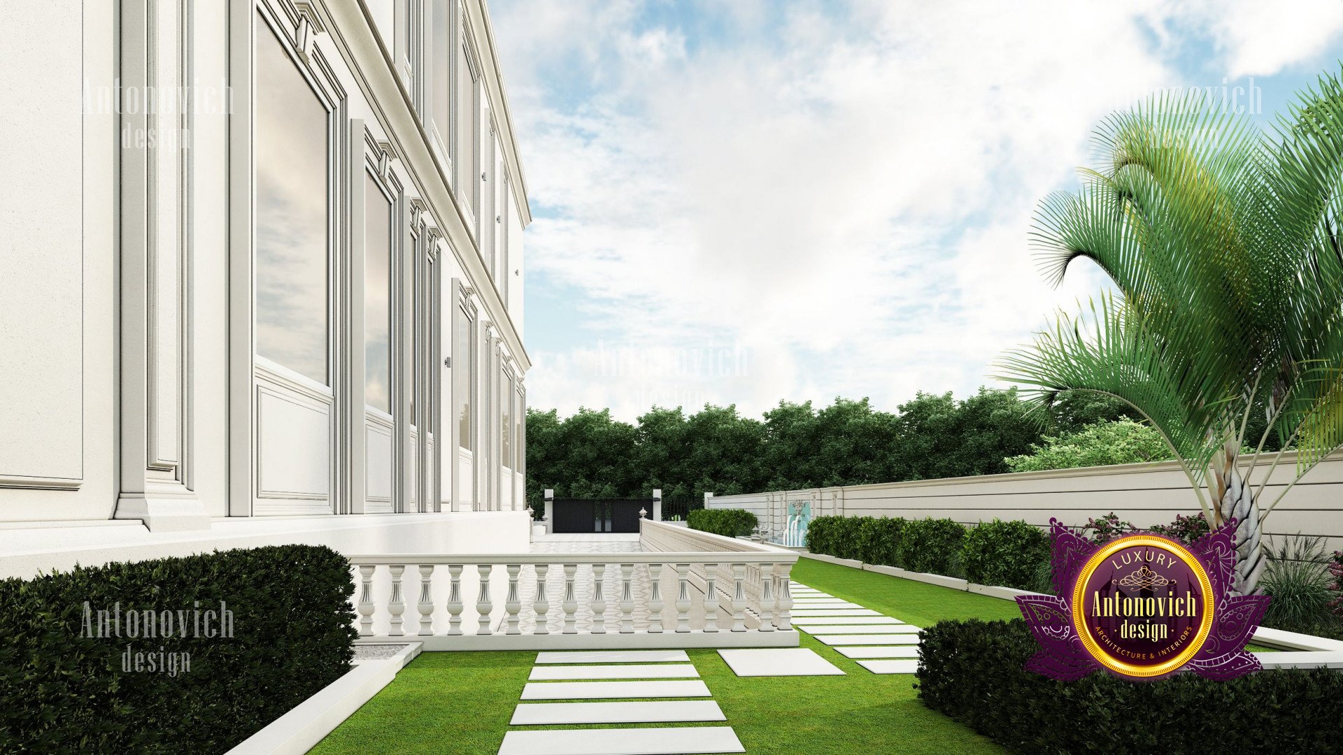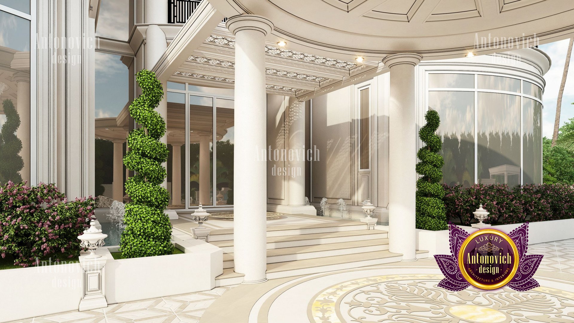 Refinement makes it possible to integrate the architectural design of the building in any landscape or building of any kind. The original Luxury Antonovich Design country house was modeled on eclectic style country villas. Important features of the house and surrounding design are borrowed from the concept of classics. In addition, individual touches of the house are the expression of the aesthetics and values of ancient eras. All this interweaving of styles allowed to achieve a very interesting result.