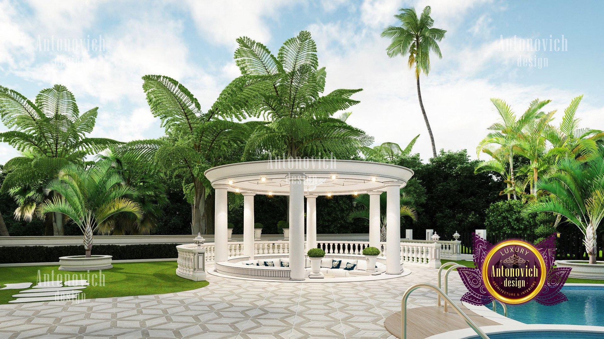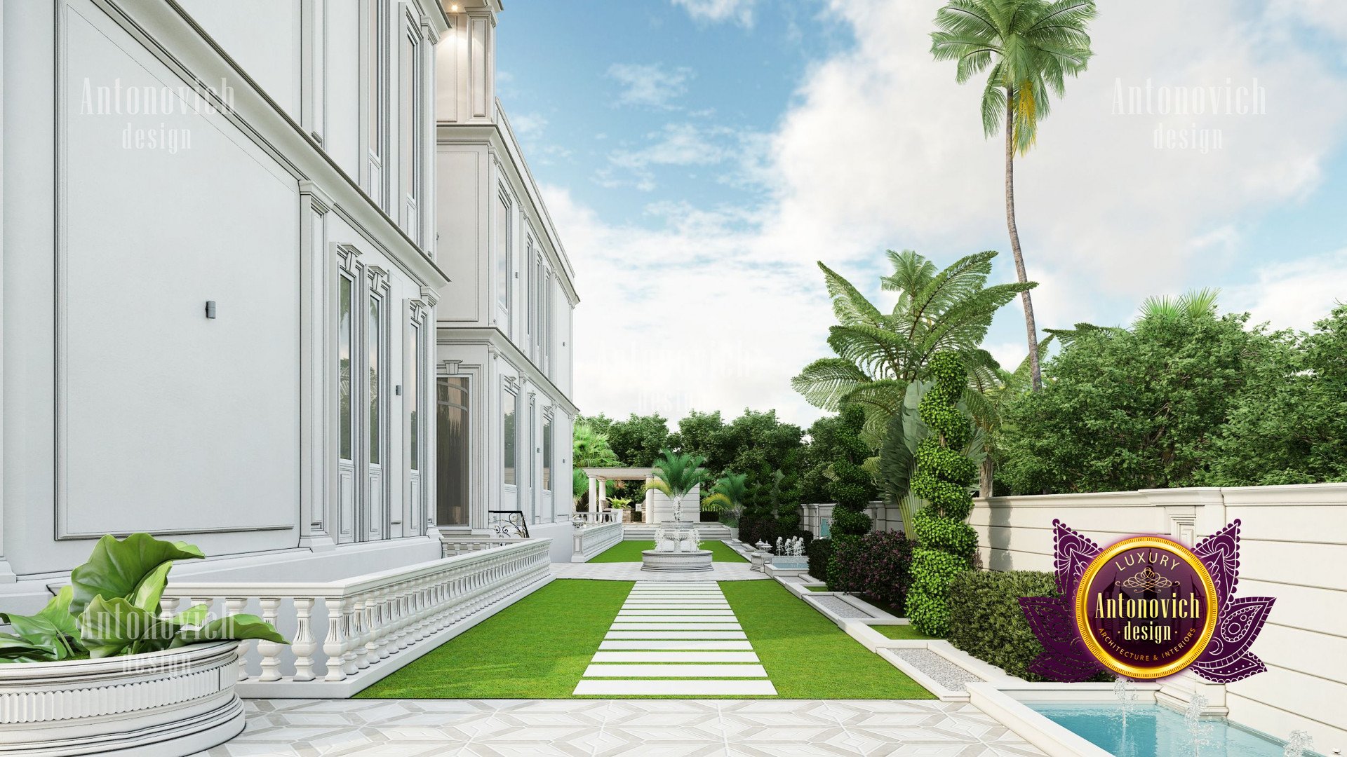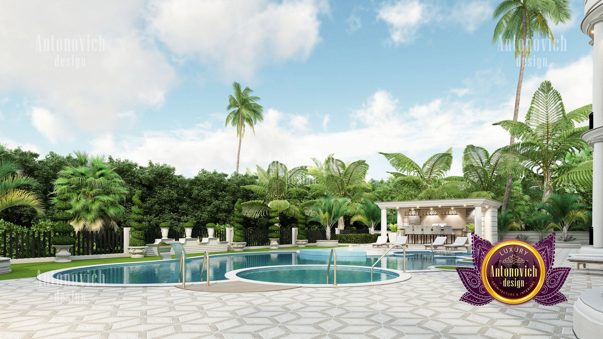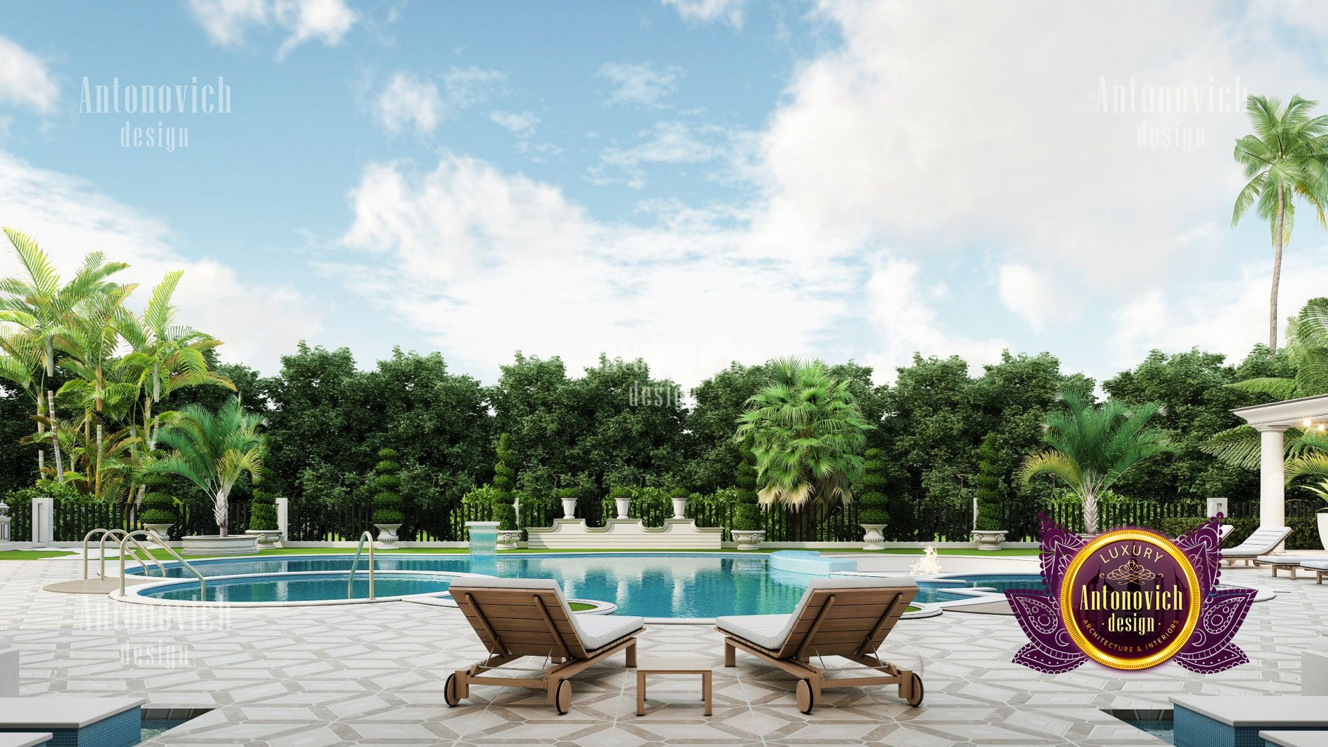 Refinement makes it possible to integrate the architectural design of the building in any landscape or building of any kind. The original Luxury Antonovich Design country house was modeled on eclectic style country villas. Important features of the house and surrounding design are borrowed from the concept of classics. In addition, individual touches of the house are the expression of the aesthetics and values of ancient eras. All this interweaving of styles allowed to achieve a very interesting result.
