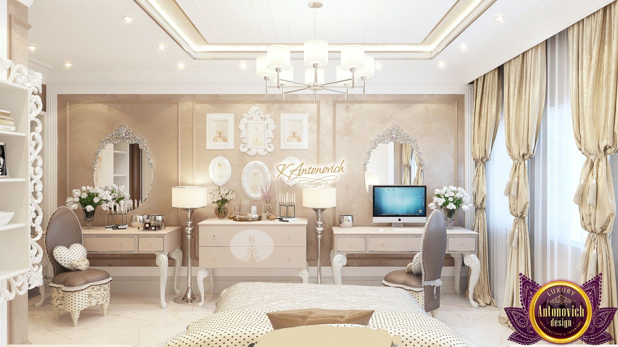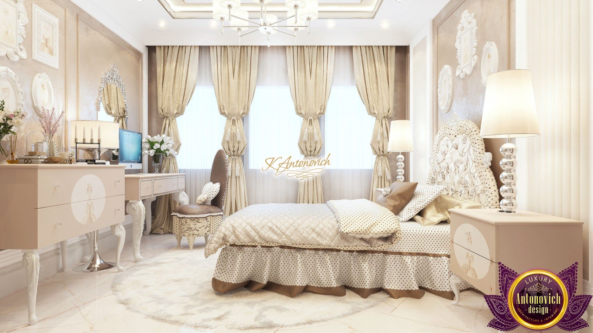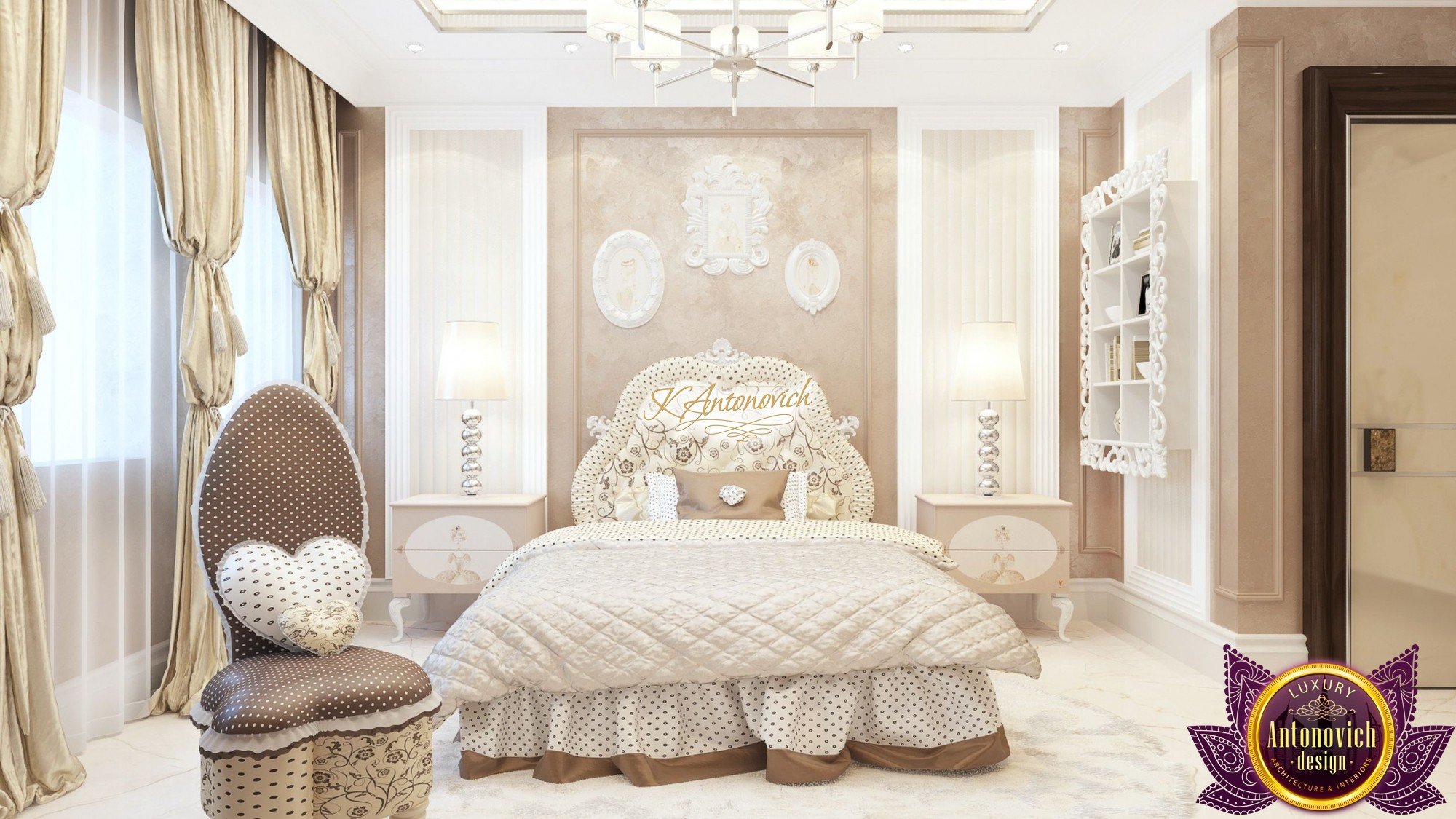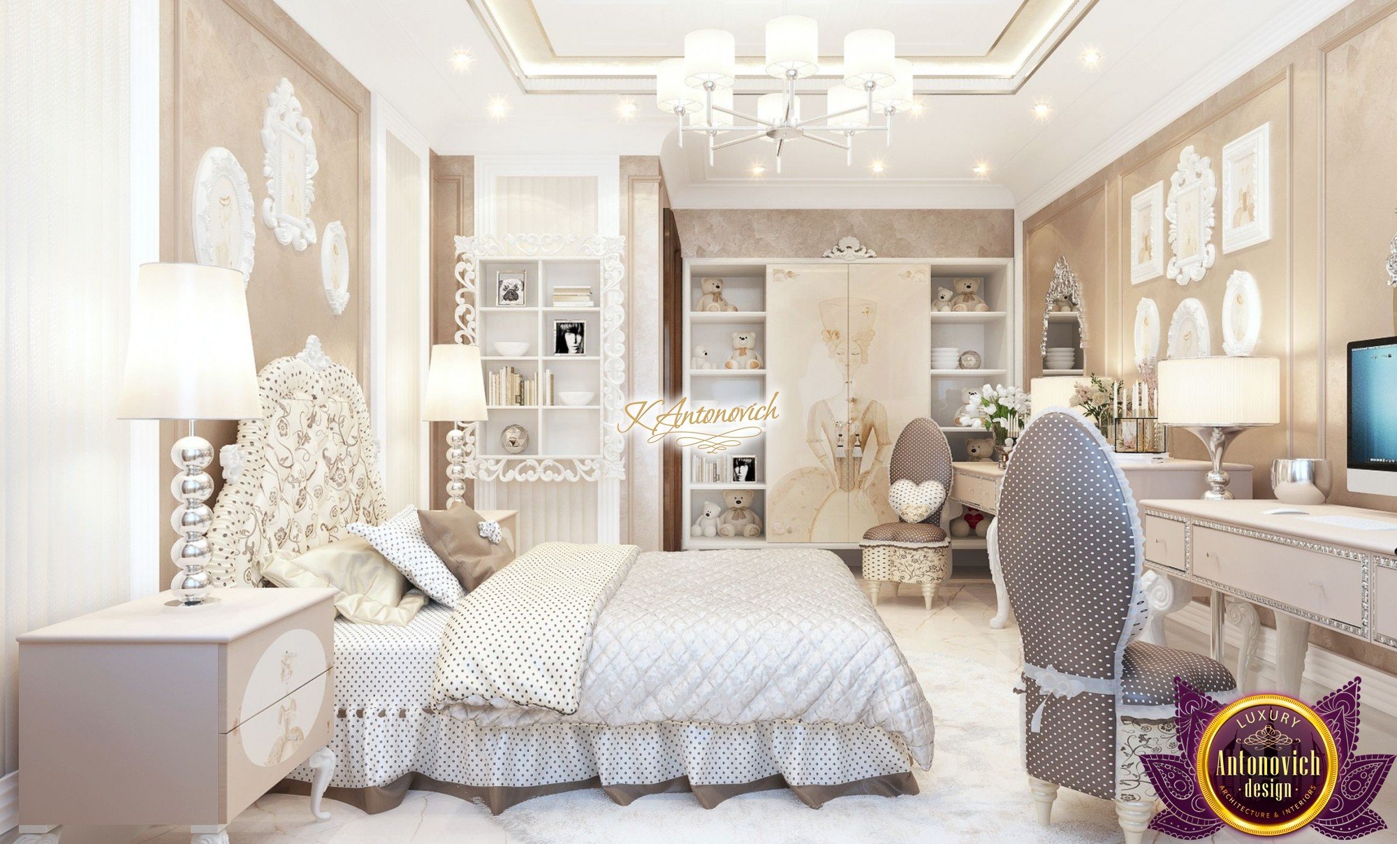 The interior design of children's room for a teenage girl was the fine line between the interior decoration of children's room and adult bedroom. At this age, a child so wants to feel like an adult. Interior designers of the design studio Antonovich offered a solution in the classical style. Gentle range of pastel beige hues fills the room with a special charm of home comfort warmth. Let us consider in detail the charming interior. Wall Decor is a combined version. It combines wonderfully, decorative plaster color of coffee with milk and supplements in the form of inlay panels in a white cream-colored frame. Interior like a zephyr, chocolate dessert filled with beautiful emotions of joy and happiness. As befits to the interior bedroom, the main protagonist of the story in this wonderful interior became a comfortable bed.Charming quilted silk bedspread and headboard upholstered in a colorful silk upholstery looks very nice.Interior designers have provided a lot of charming decorative elements. Next to the bed are two bedside tables with gracefully curved legs with original prints.On the pedestals are not less original night lamps. Padded chair with a cover of silk polka dot and soft pillows in the form of hearts perfectly fit into the interior.Curtains design continues smoothly an overall delicate picture of the room. Curtains made of luxurious silk of soft golden hue complemented by clips in the form of cords and large brushes.
