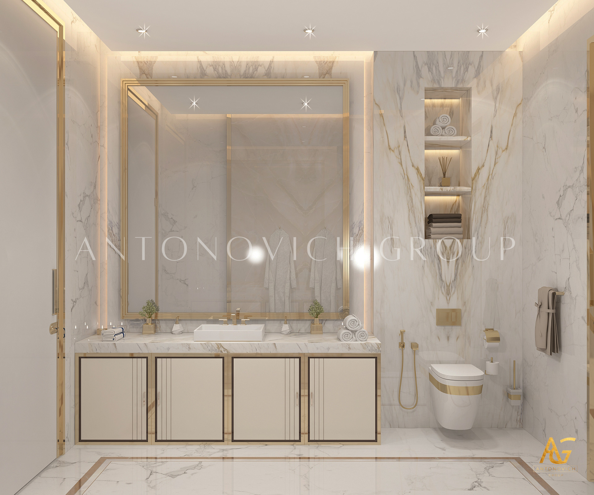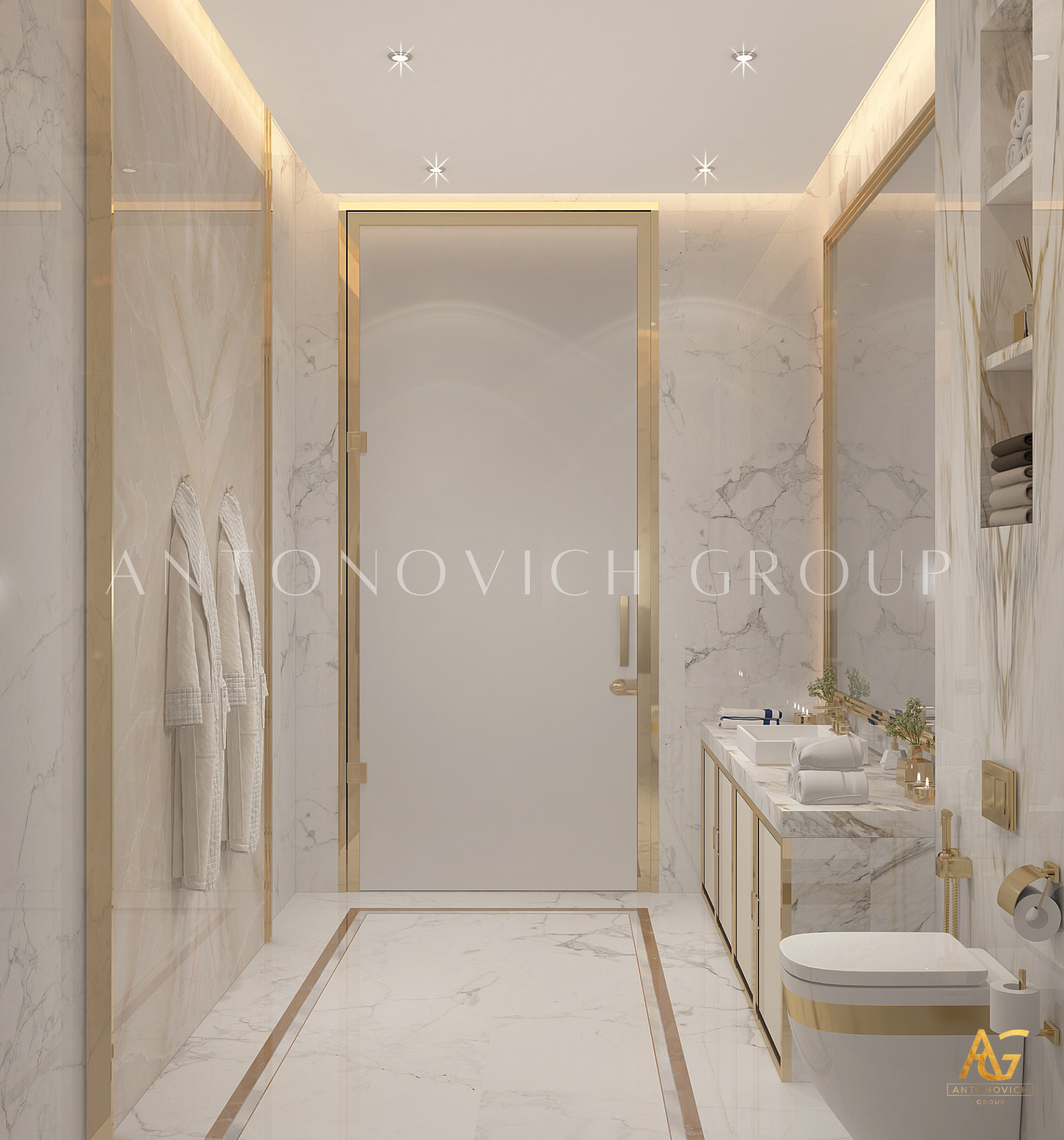 A master bathroom with this much space in Dubai is a dream come true. A marble freestanding bath next to a massive window with a view appears to be straight out of a movie set. This bathroom design, however, is more than just square footage. The power of a bathroom creates the illusion of space through its basic form and windows. Dubais bathrooms are small and lack large windows. However, if you have the luxury of a bathroom with large windows, make the most of the view. The finishes and textures in the bathroom are important components of the overall design. This one has textured wallpaper that looks like a stone on the walls, which contrasts with the chromed embellishments and shiny parts.